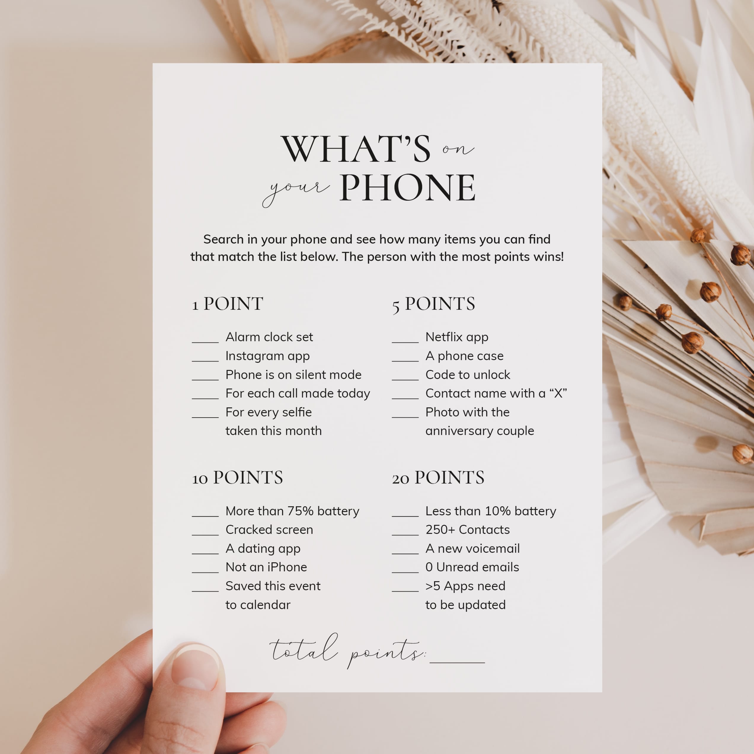 Most guests show up to an anniversary party with just their phone and a smile. Sound familiar? Then this anniversary edition of What’s On Your Phone is the perfect icebreaker! A modern twist on the classic What’s In Your Purse, this game is easy to play and guaranteed to get everyone laughing.