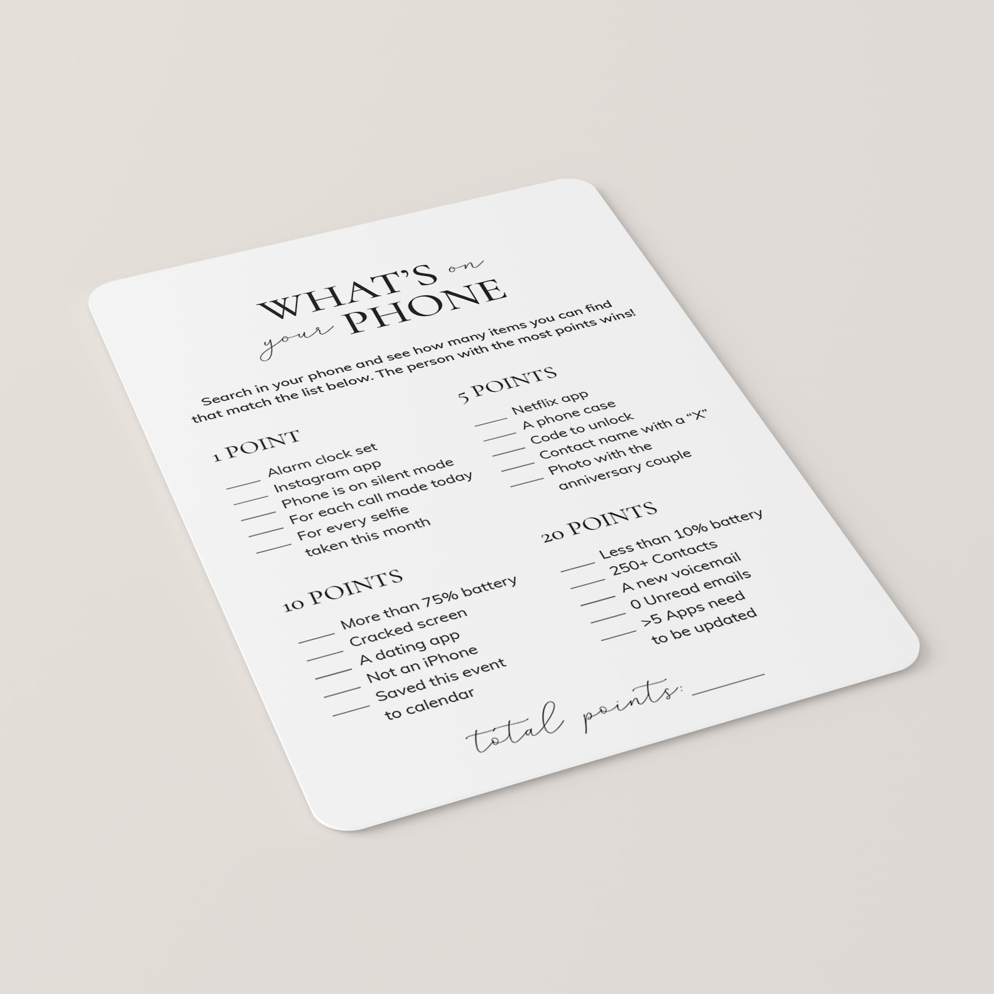 Guests simply scroll through their phones to see which of the listed items they have, like a photo of the anniversary couple, a dating app, or a new voicemail, and tally up their points.