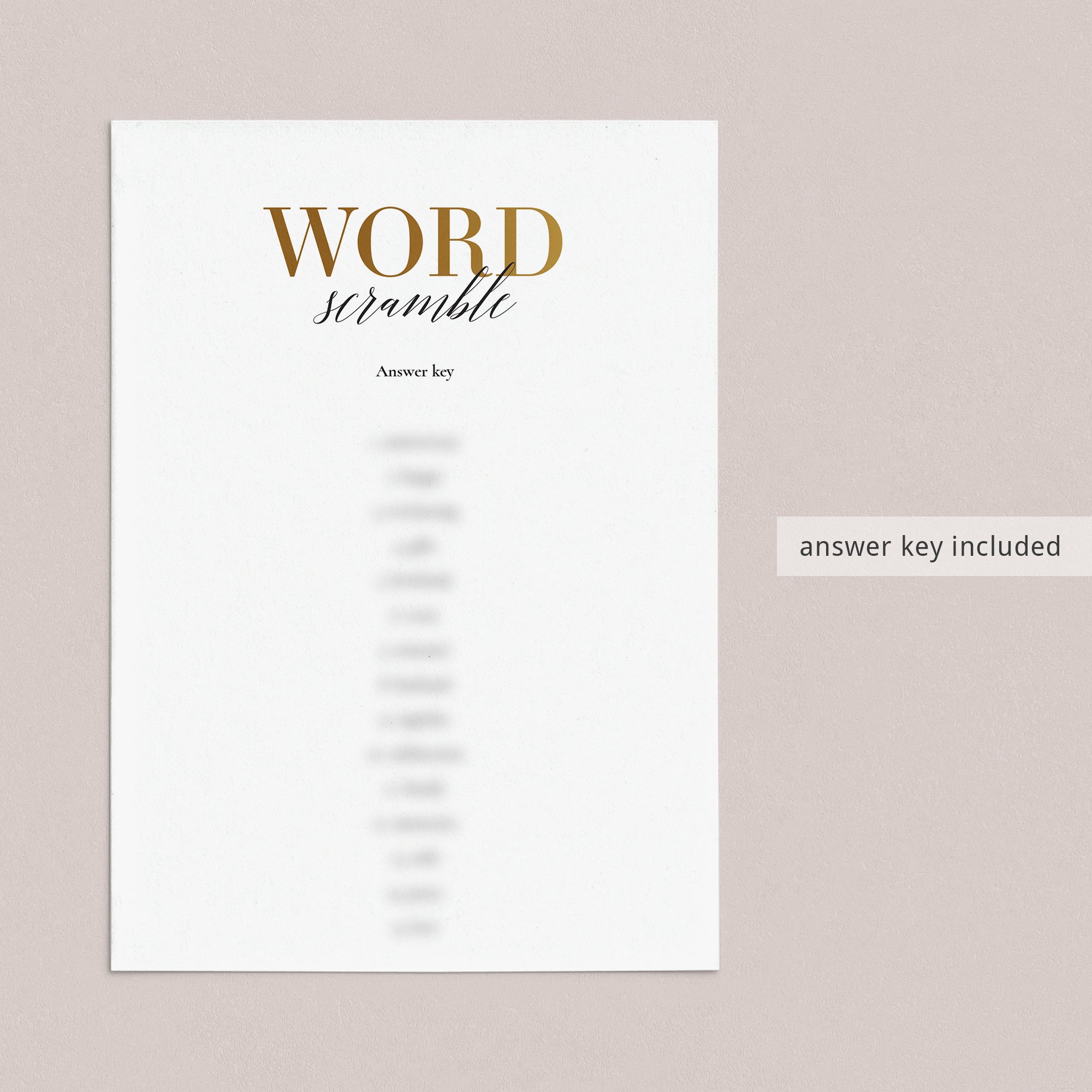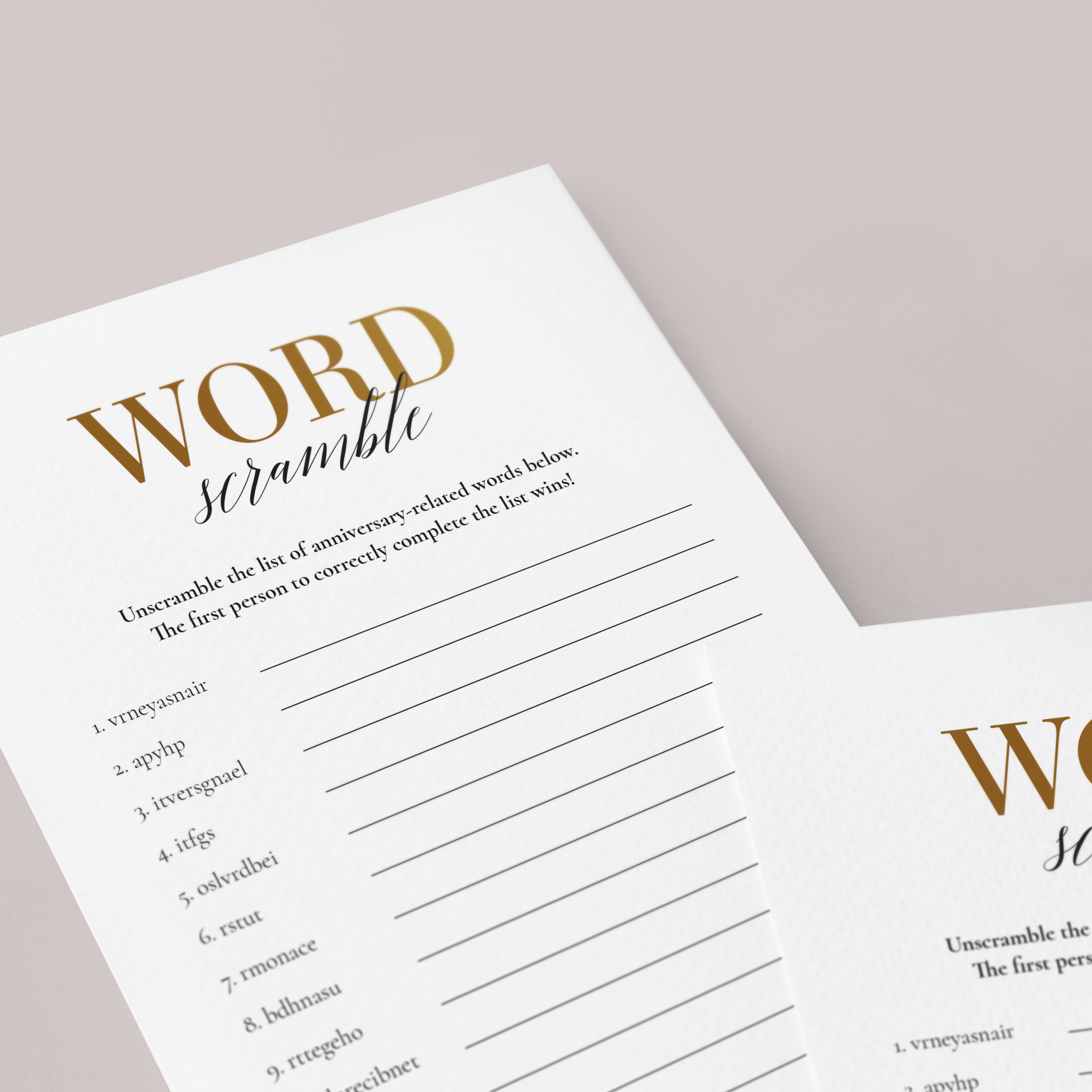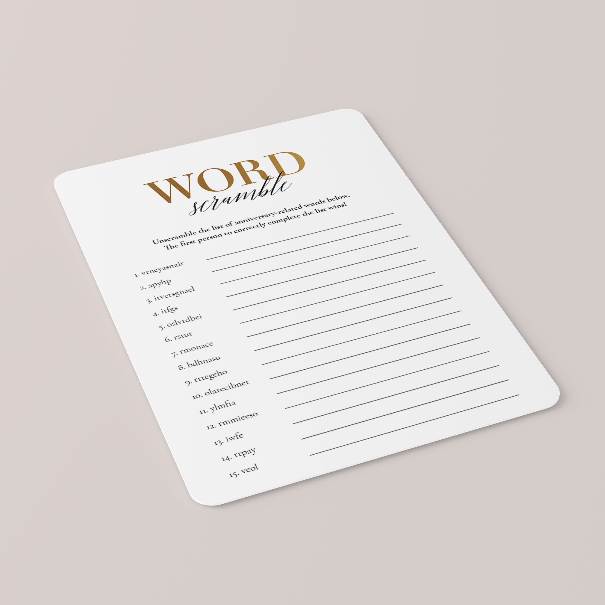 Play one of the most popular party games with this golden Anniversary Word Scramble game. The modern gold game will fit any anniversary party theme. This game will create a fun and enjoyable moment for all of your guests.