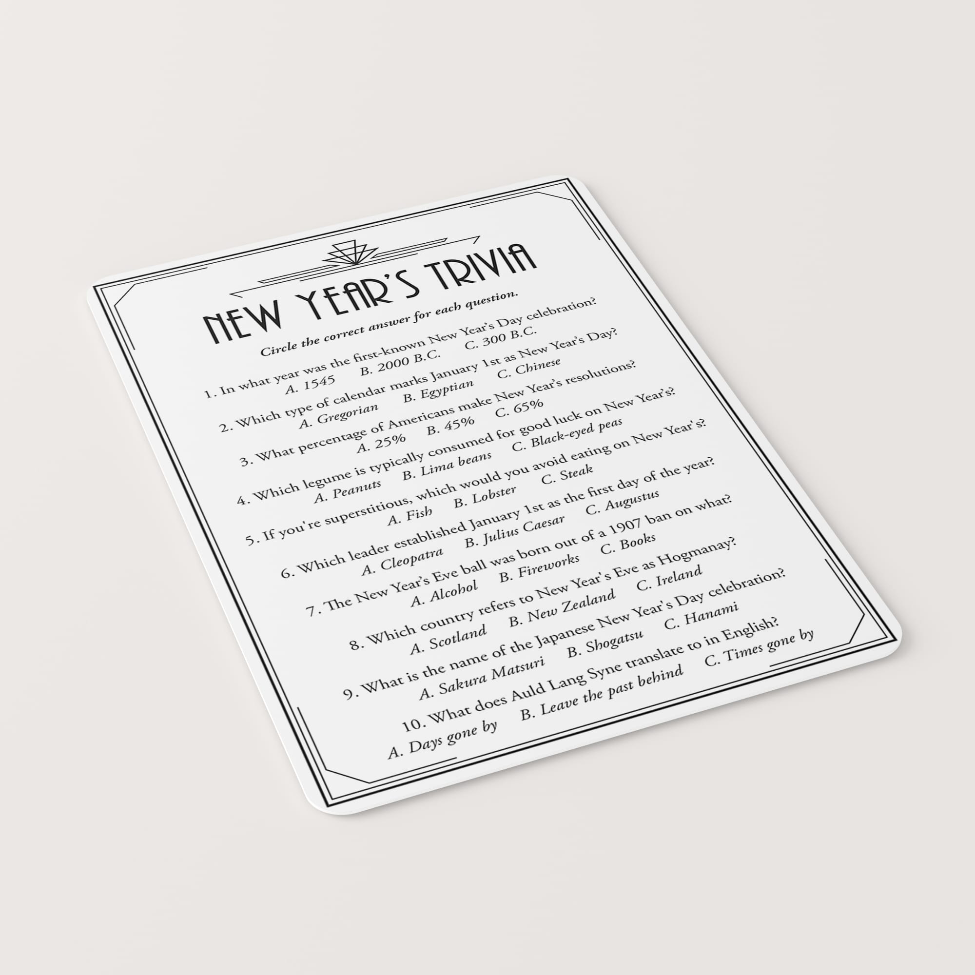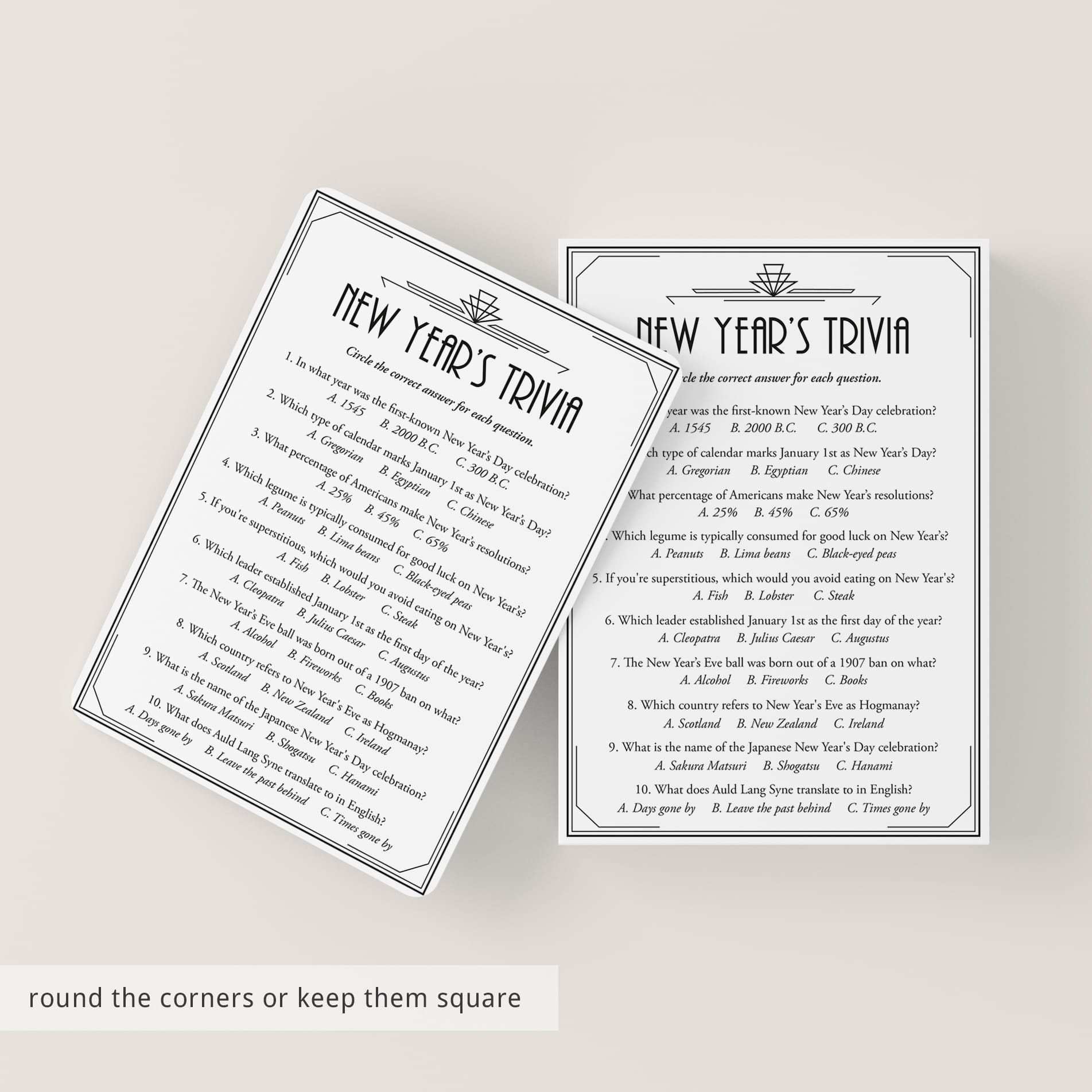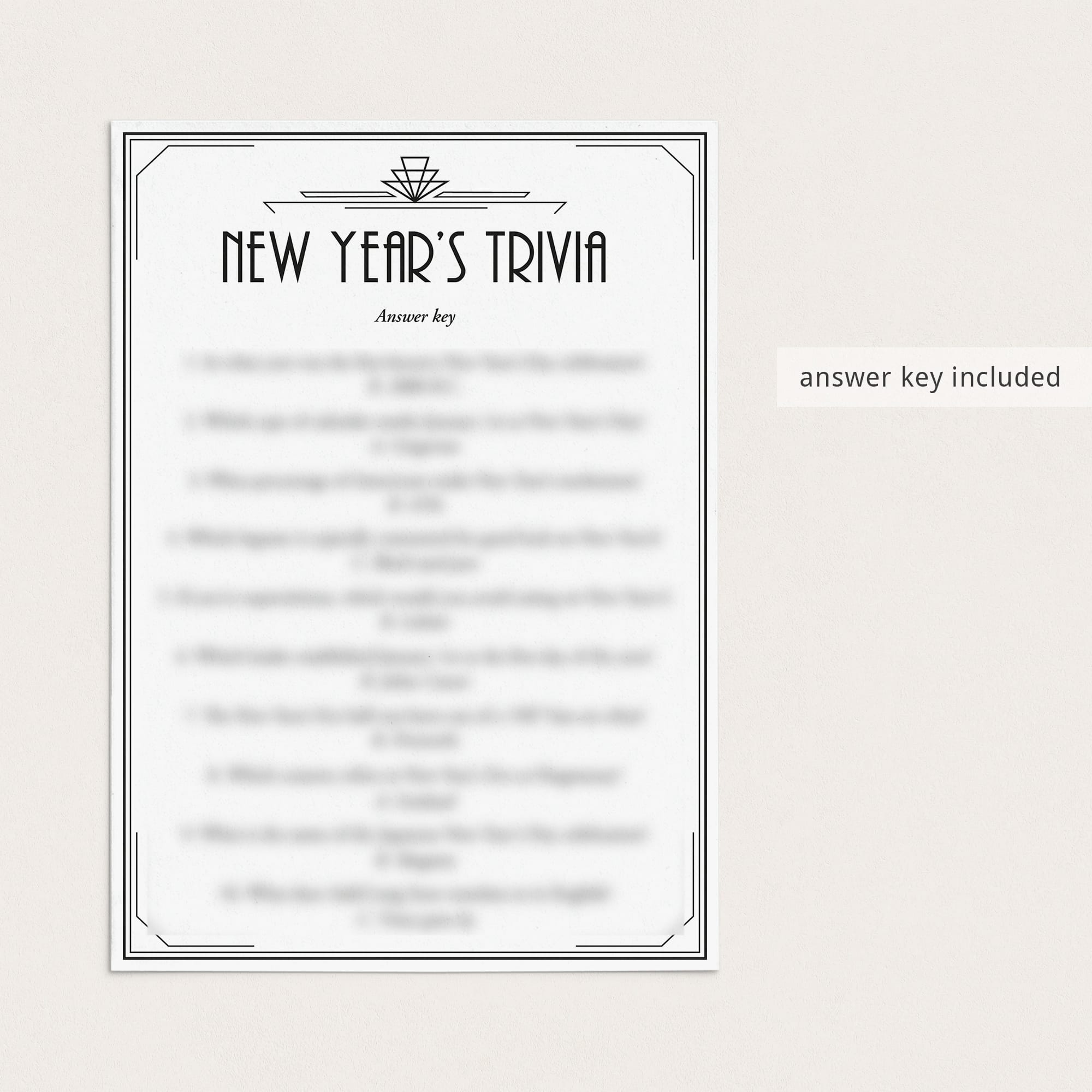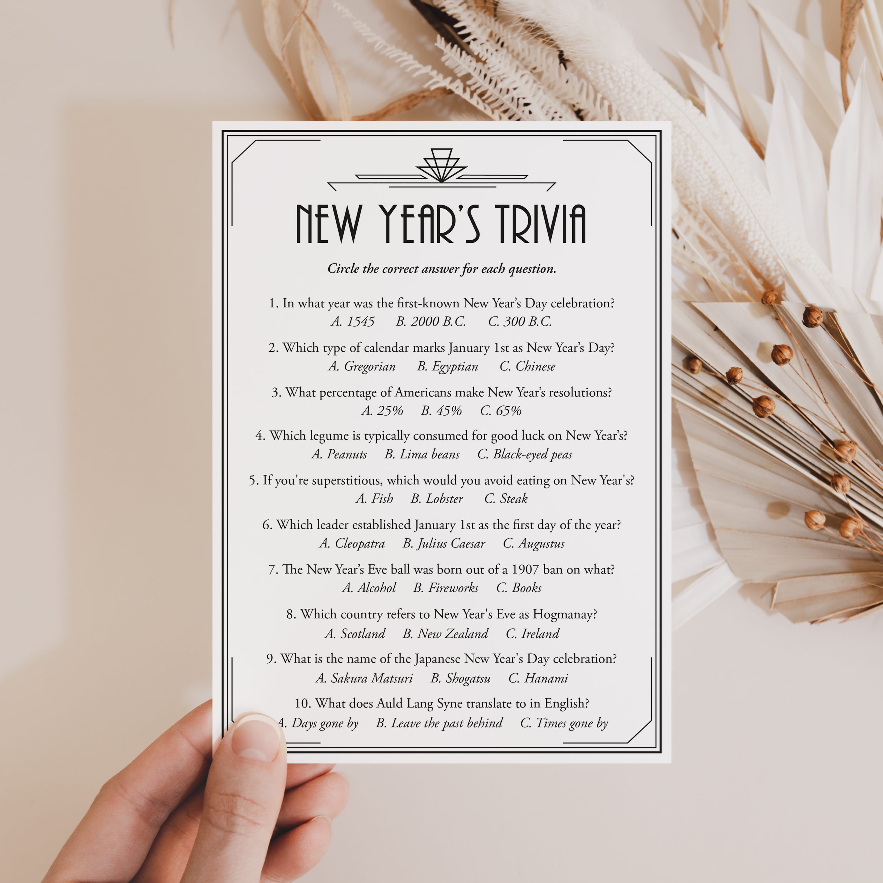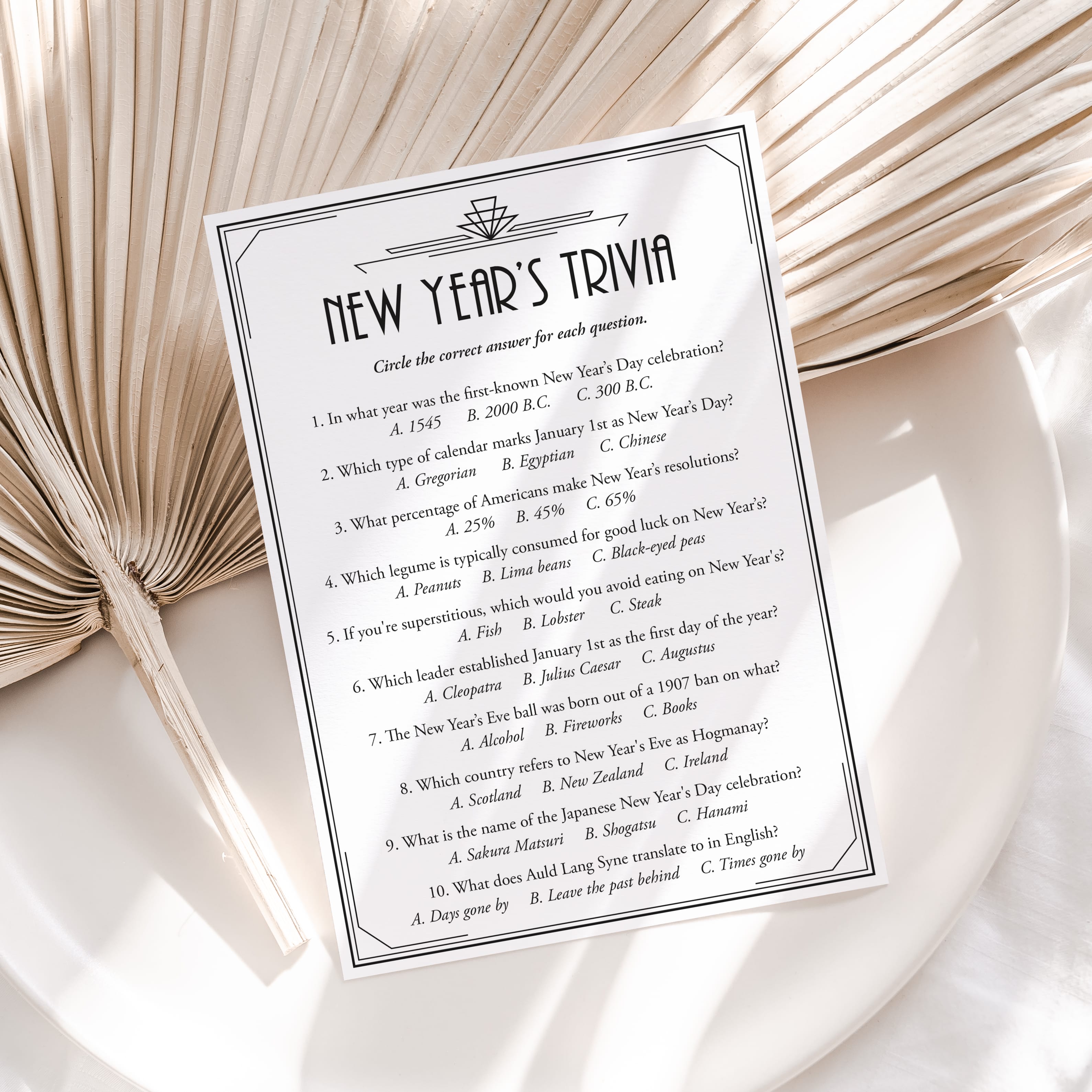 Are you throwing a Great Gatsby theme New Year's Eve party? Use this art deco New Year's Trivia game to test your guests New Year's knowledge. It’s a great challenging game to play at your 1920s New Years Eve party.