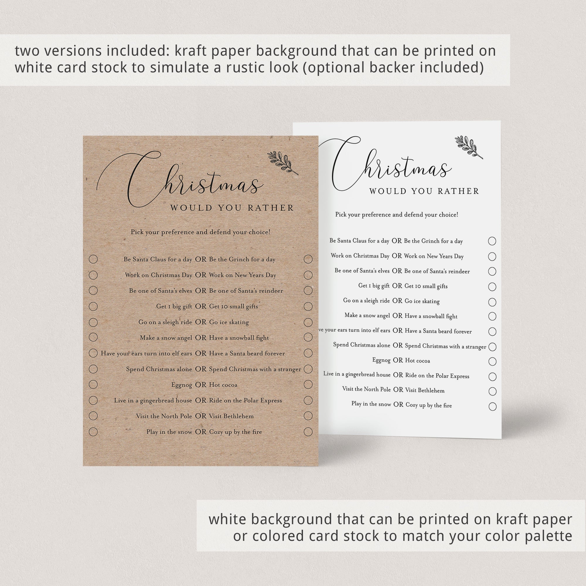Christmas Would You Rather with faux kraft background and white background, each: