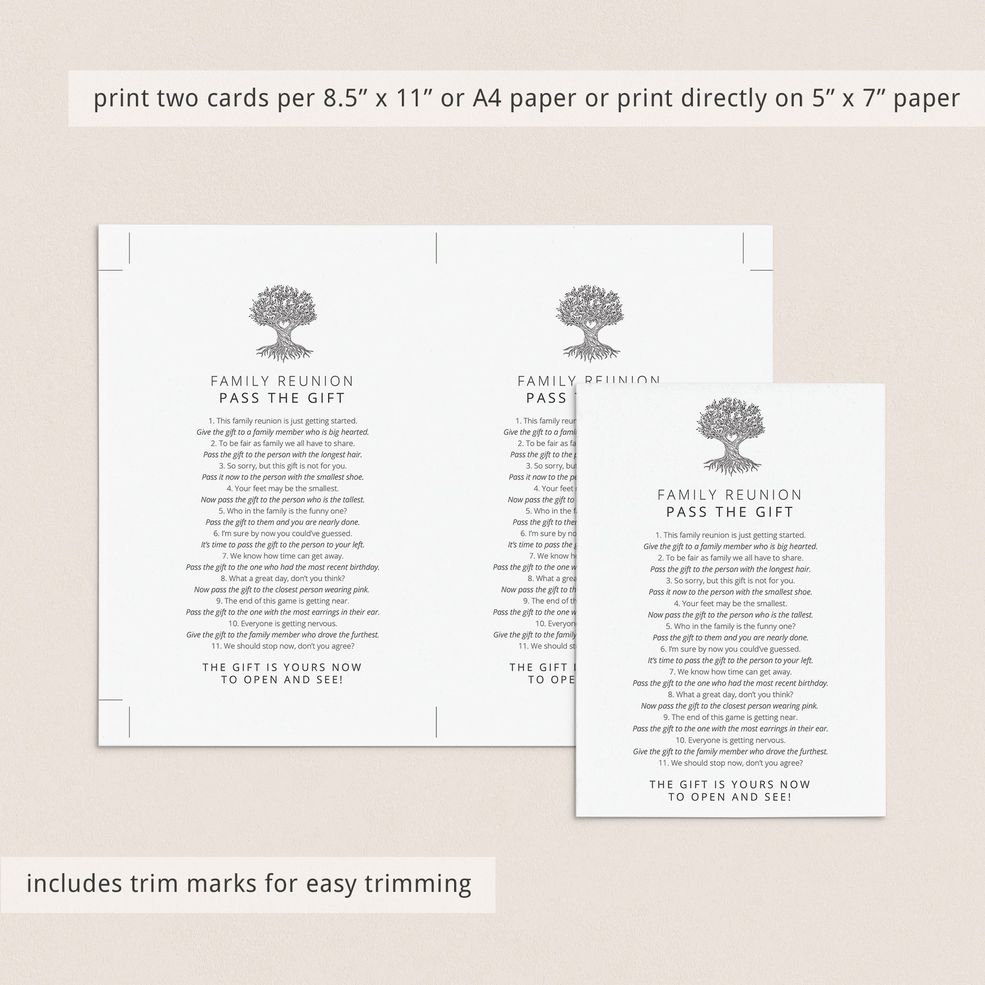 Are you looking for a fun Family Reunion Party game? Play Pass The Gift with this printable game card! The funny game is the perfect addition to any family gathering. All you need is a gift and this modern Pass The Gift game with minimalist family tree.