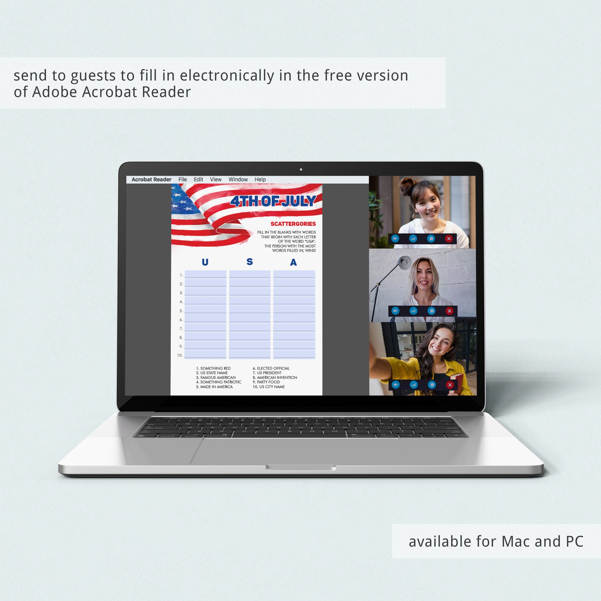 How many words can you fill in with the letters "U", "S", "A"? Play Scattergories at your (online) 4th of July party to ensure lots of fun and laughter. This game is great fun for all ages. You can play 4th of July Scattergories in your (online) classroom, at the office or at home with family and friends. Printable and electronically fillable files are included.