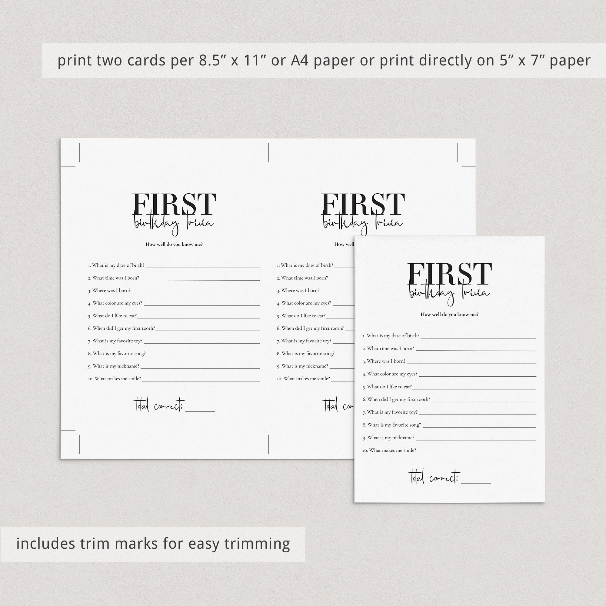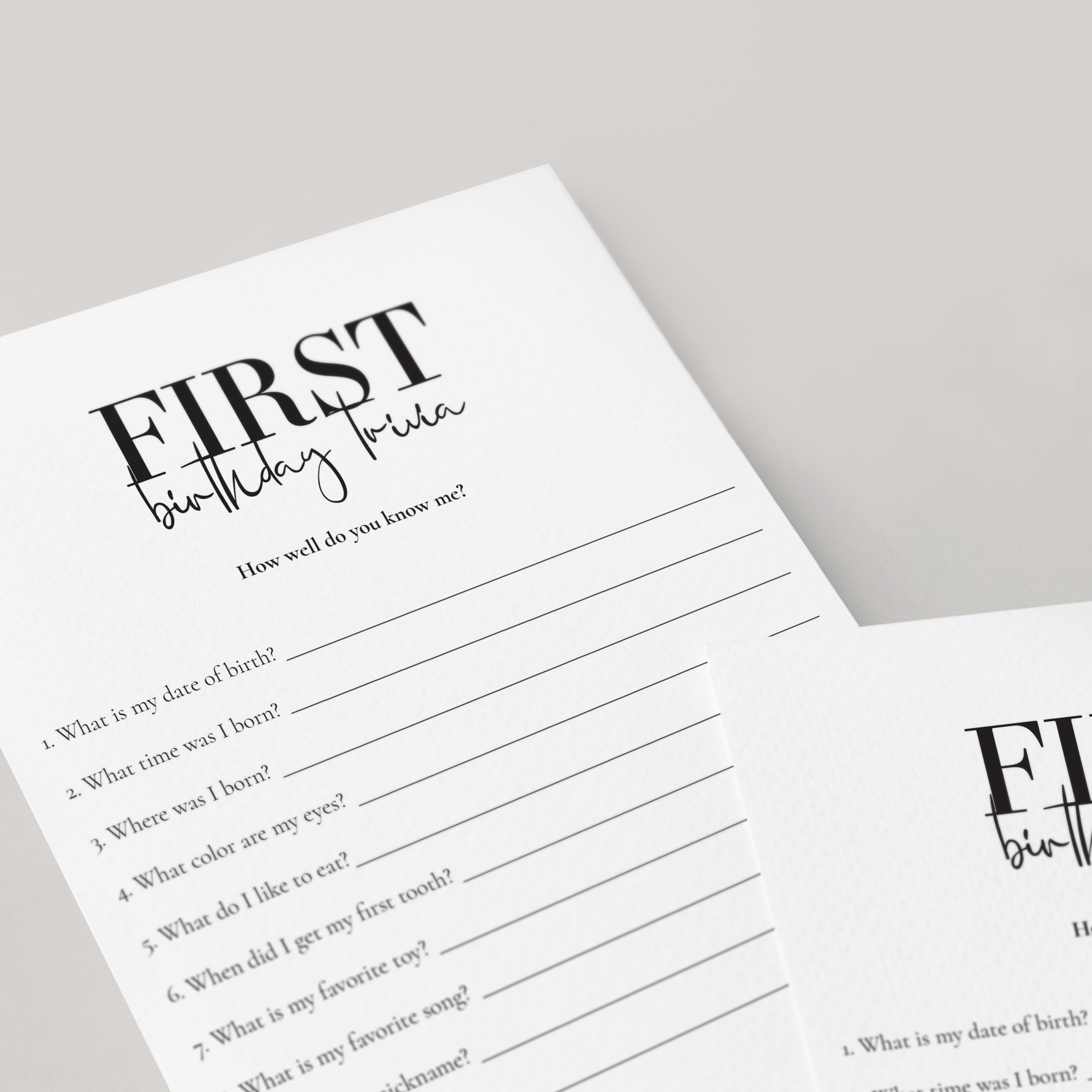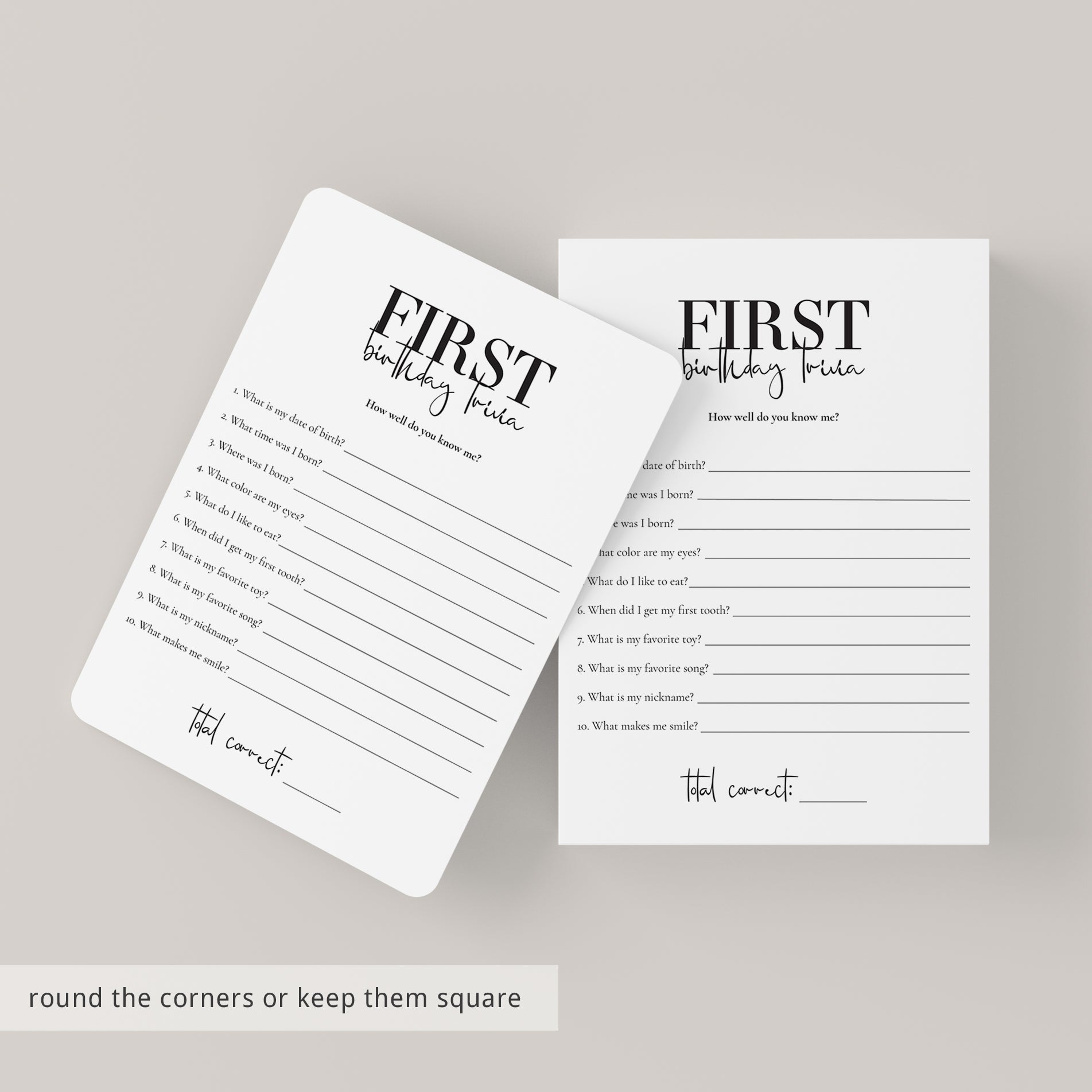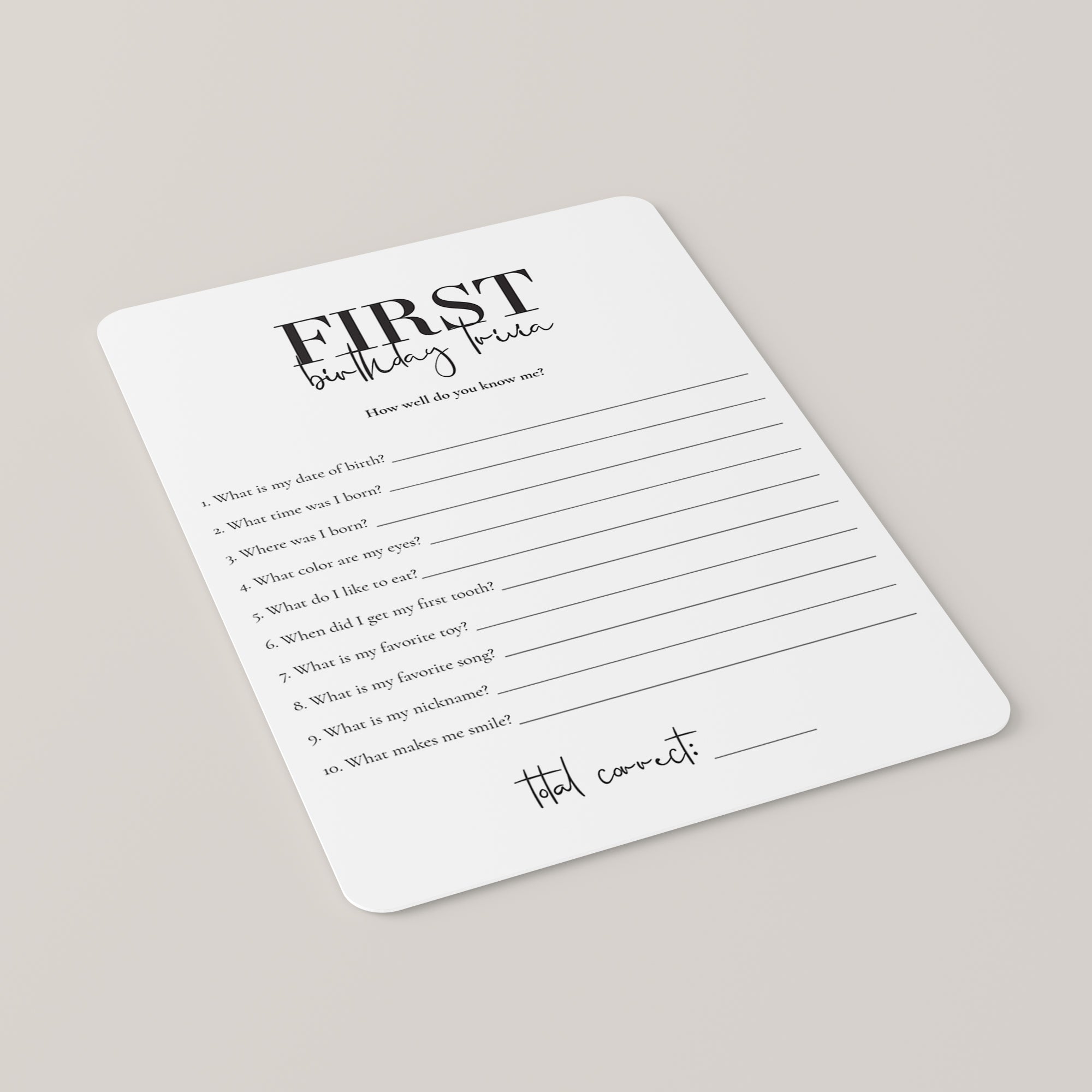 Are you looking for a fun game for your baby's first birthday party? Test your guests how well they know the birthday boy or girl and play first birthday trivia with this modern minimalist 'How well do you know the one year old’ game. This first birthday quiz is a great way to bring disparate people together and to put them all in a party mood. It's the perfect addition to your baby's first birthday party.