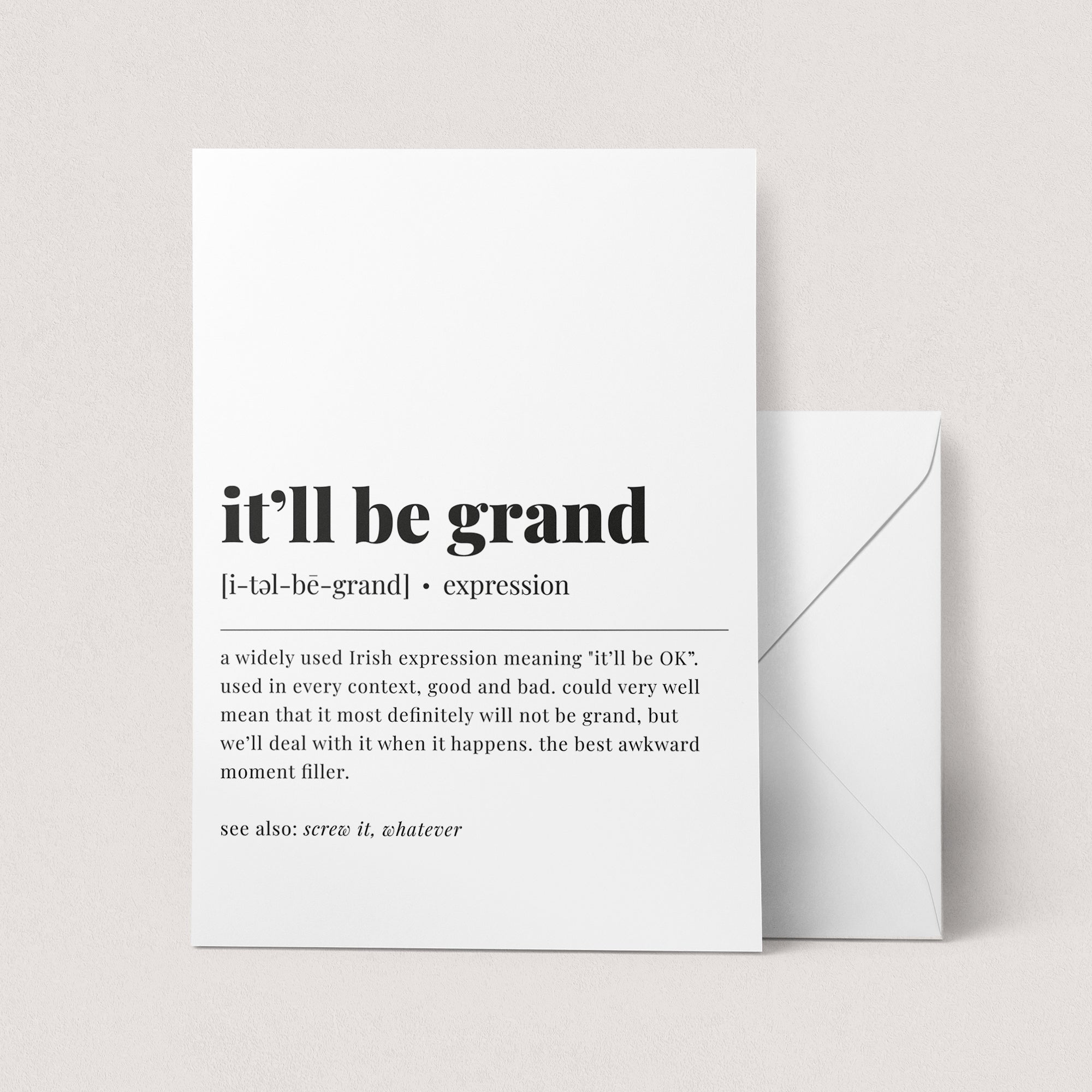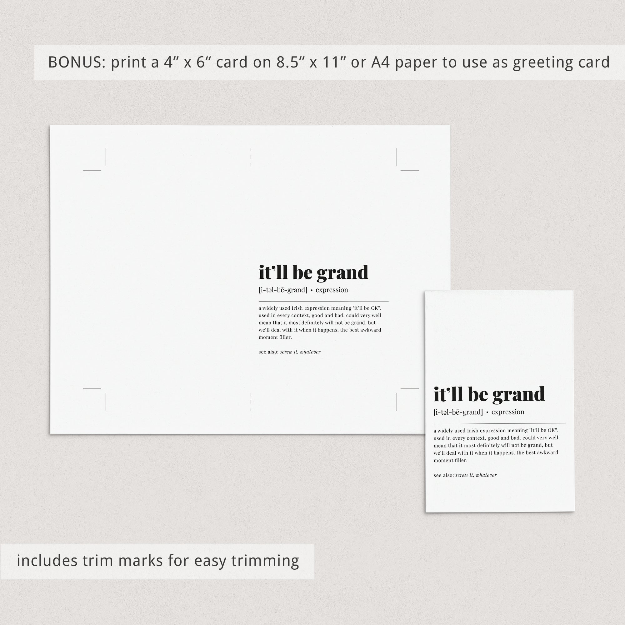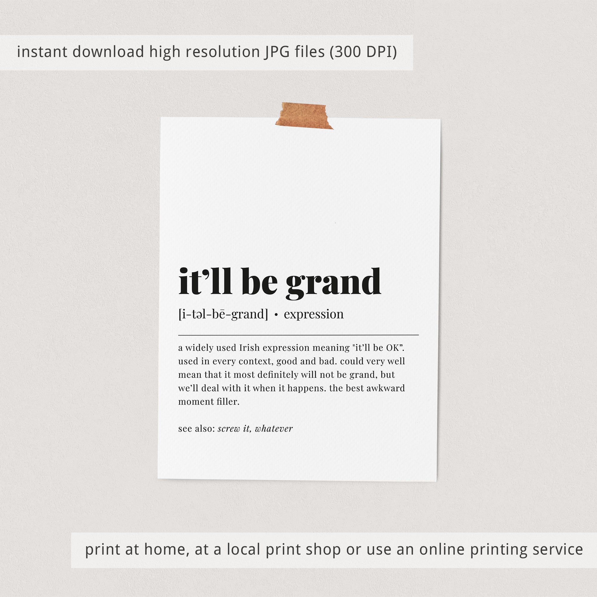 This dictionary-style meaning of 'it'll be grand' printable is an instant download. After purchase you will receive a download link immediately on screen. Also within minutes of your order and payment, an e-mail will be sent to you with a link for your download.