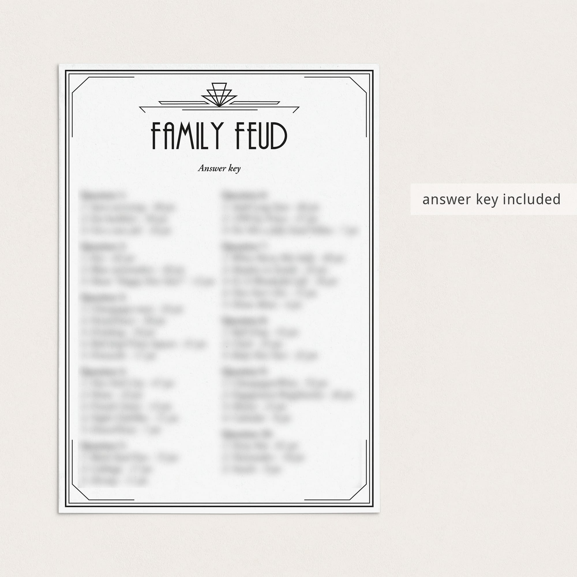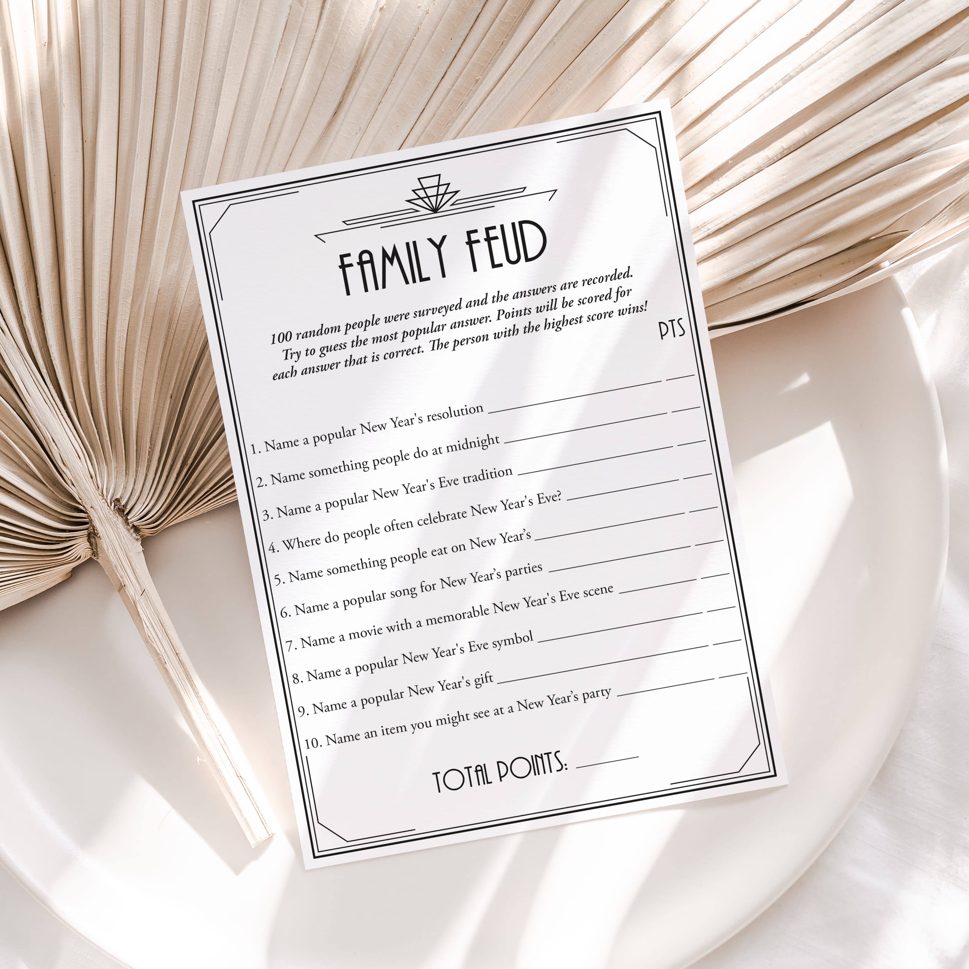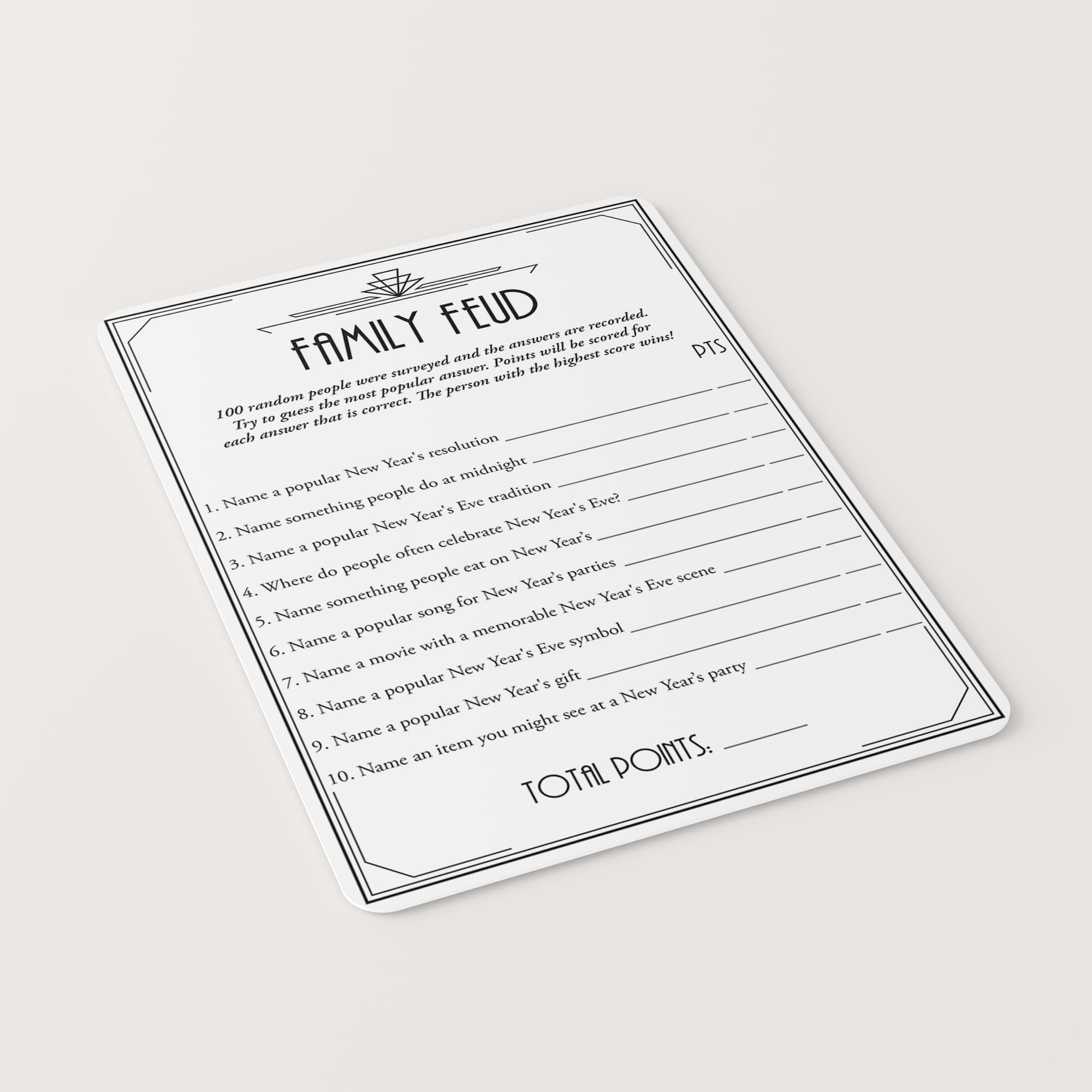 Add some fun to your Great Gatsby theme New Year's Eve party with a Family Feud game. Family Feud is one of the best game shows ever. Have your flapper girls and dapper men compete to guess the most popular answer to random New Year's themed family feud questions. An answer key with the family feud answers is included. The person or team with the highest score wins!