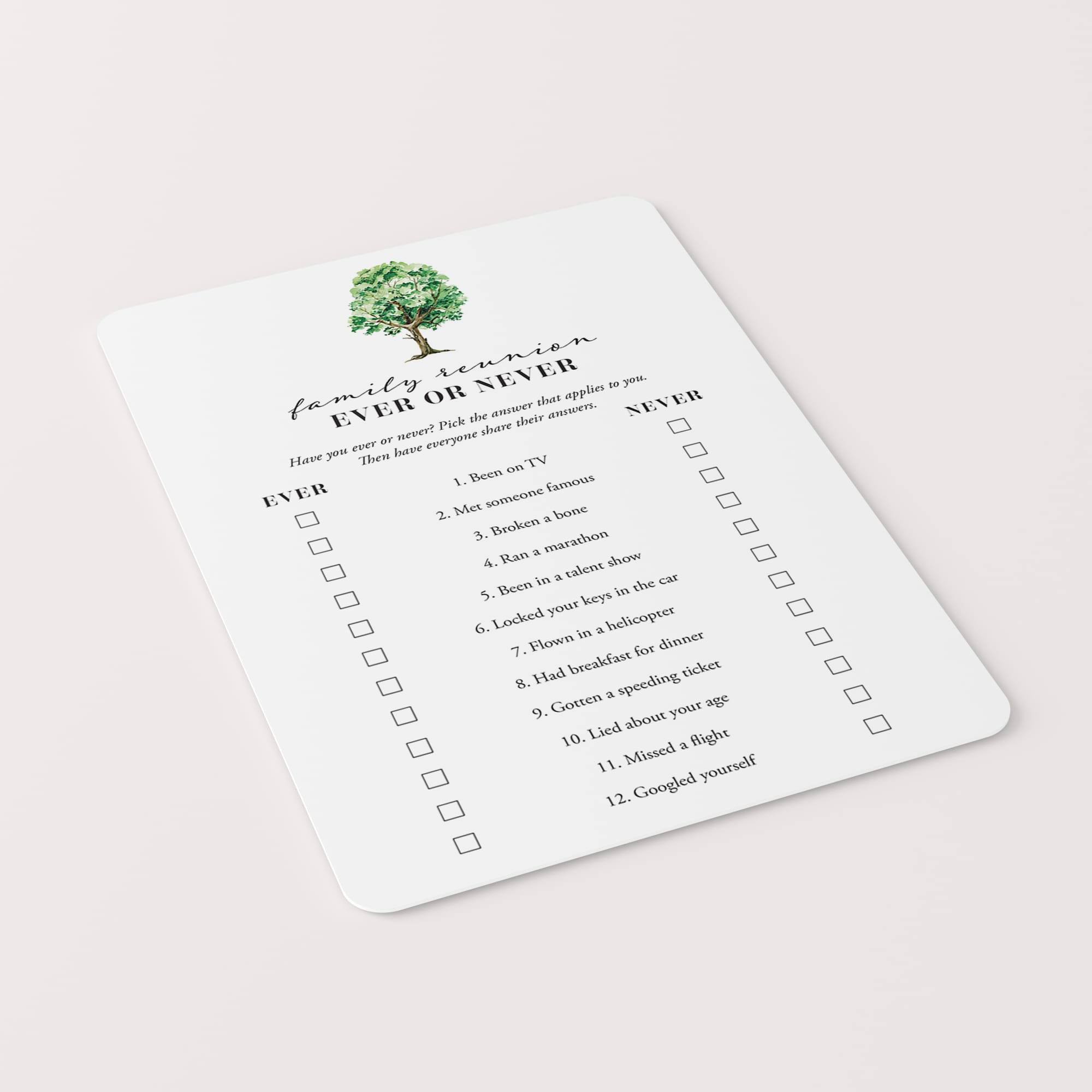 Find out what your relatives have ever or never done in this fun icebreaker game for the whole family!