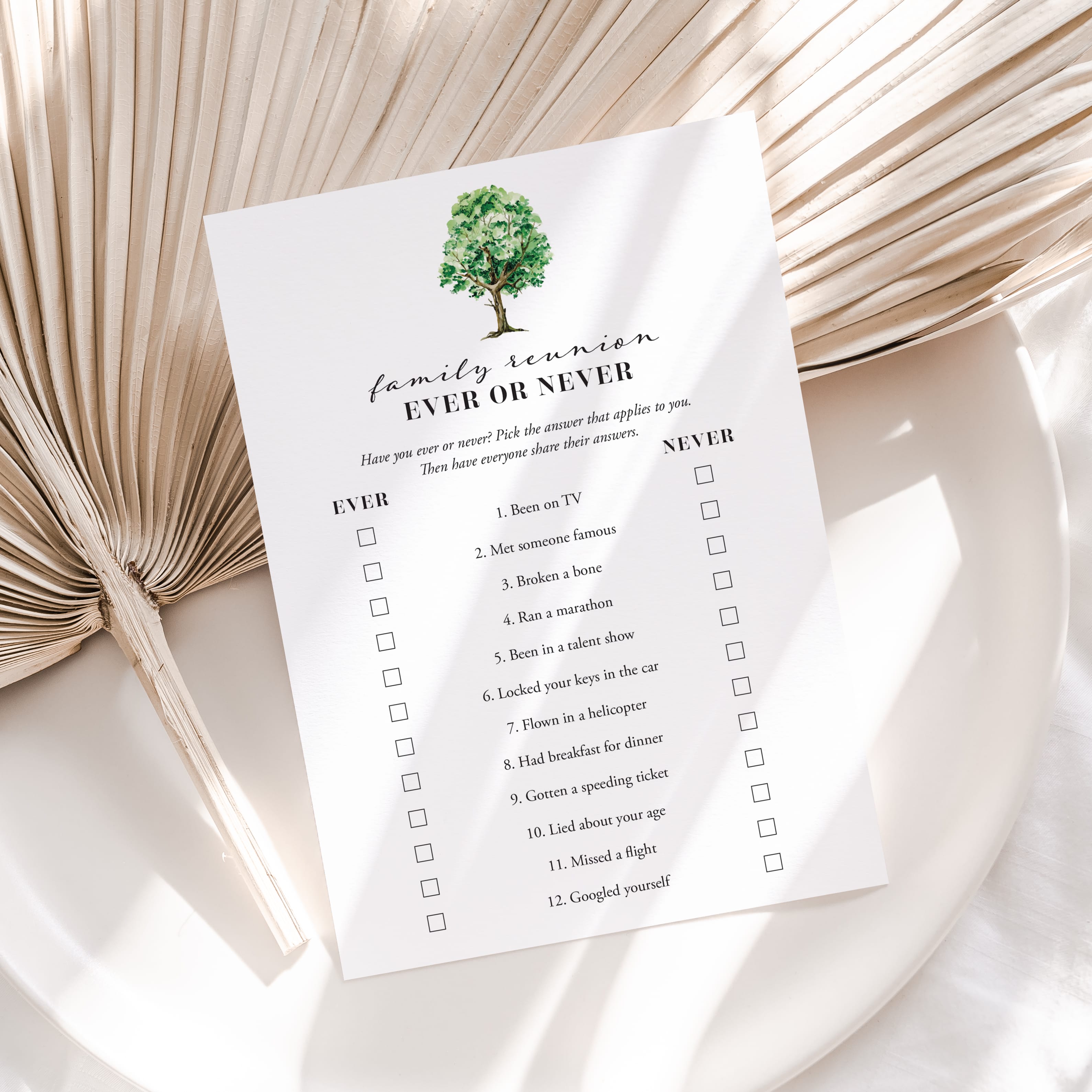 Each guest fills out the game card by marking whether they have ever or never done the listed activities. Then share your answers with the group and enjoy the funny stories, surprises, and memories that come up.