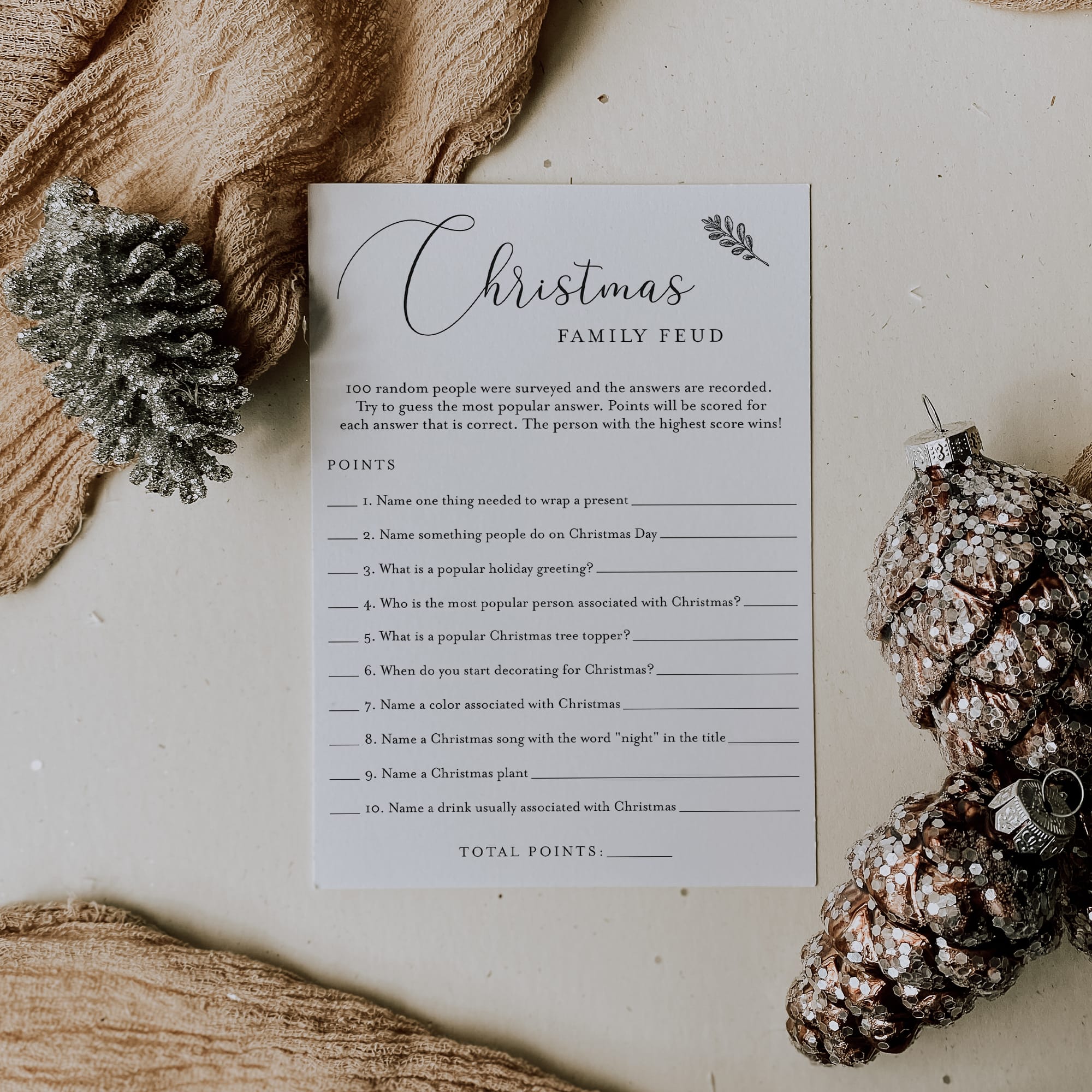 Family Feud is one of the best game shows ever. Have your friends and family compete to guess the most popular answer to random Christmas themed family feud questions. An answer key with the Christmas feud answers and points is included. The person or team with the highest score wins!