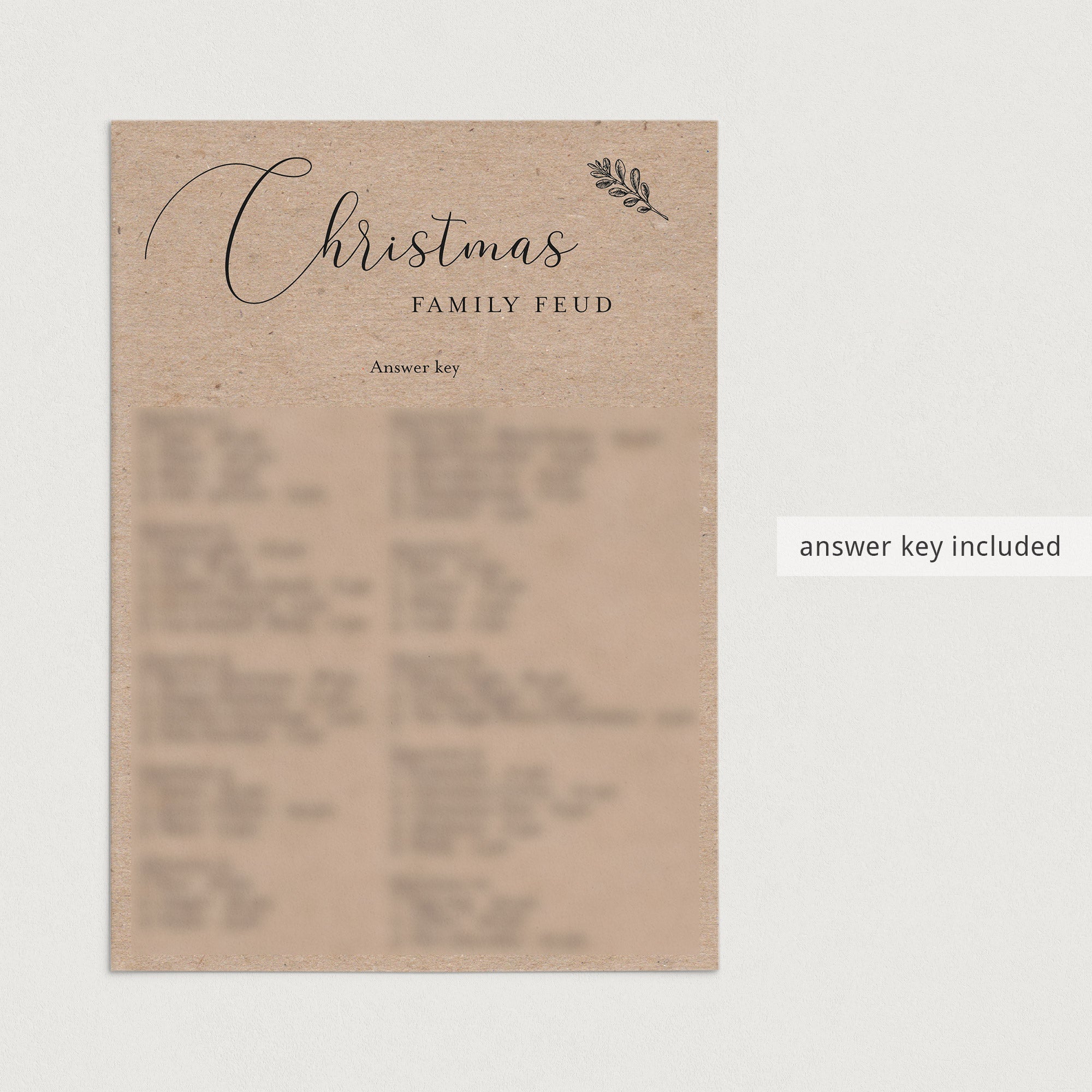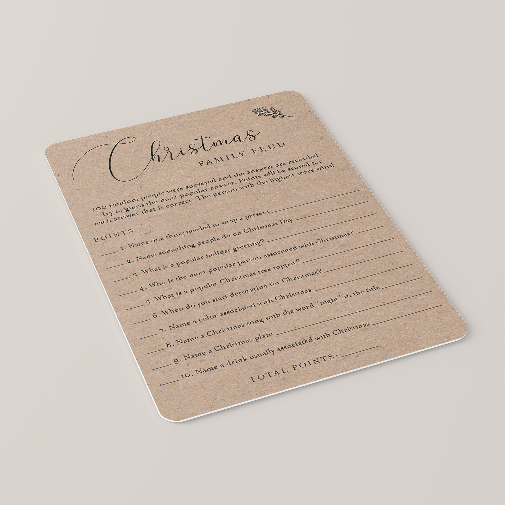 Are you looking for a fun game to play at your Christmas party? Play Christmas Family Feud with this rustic game card with kraft paper background.