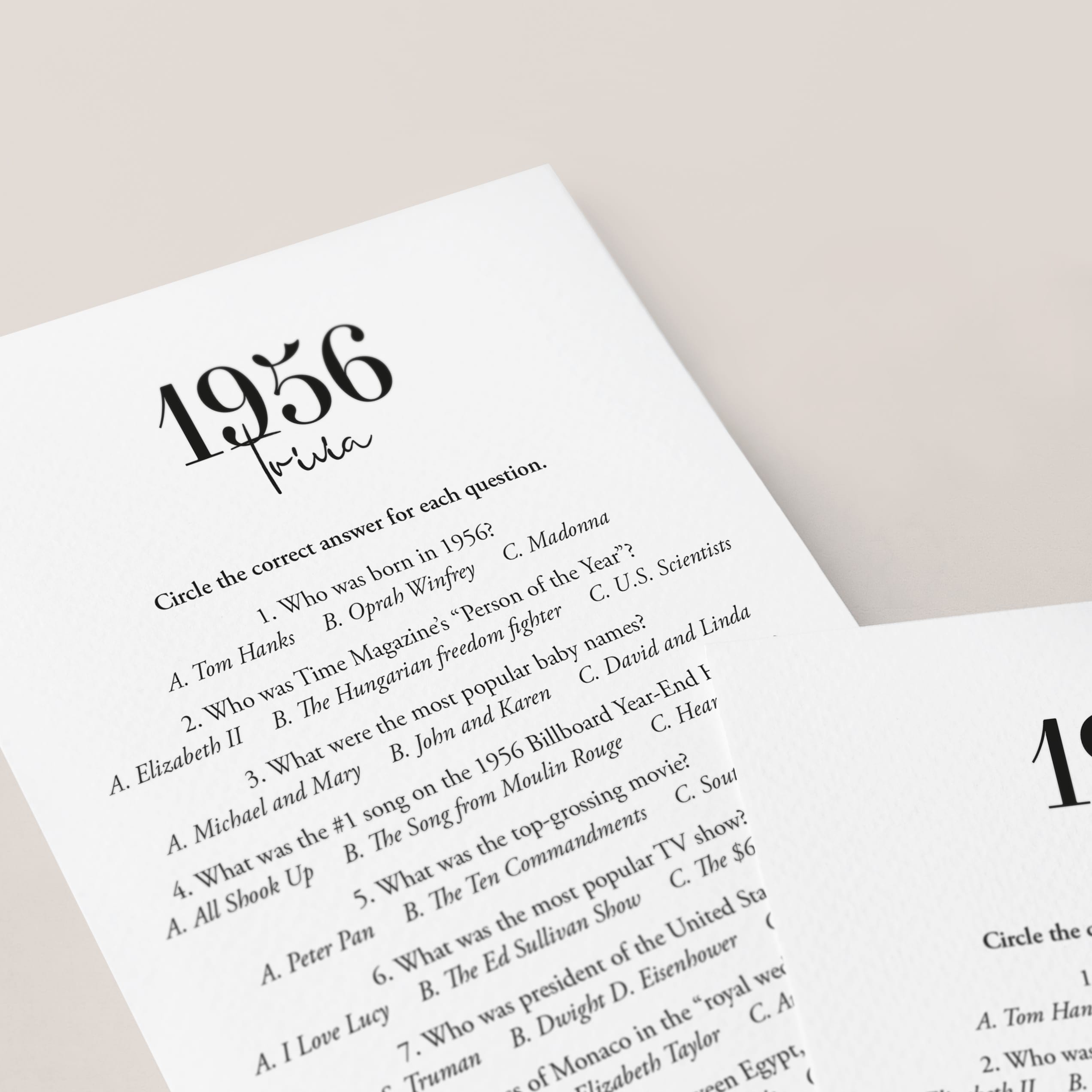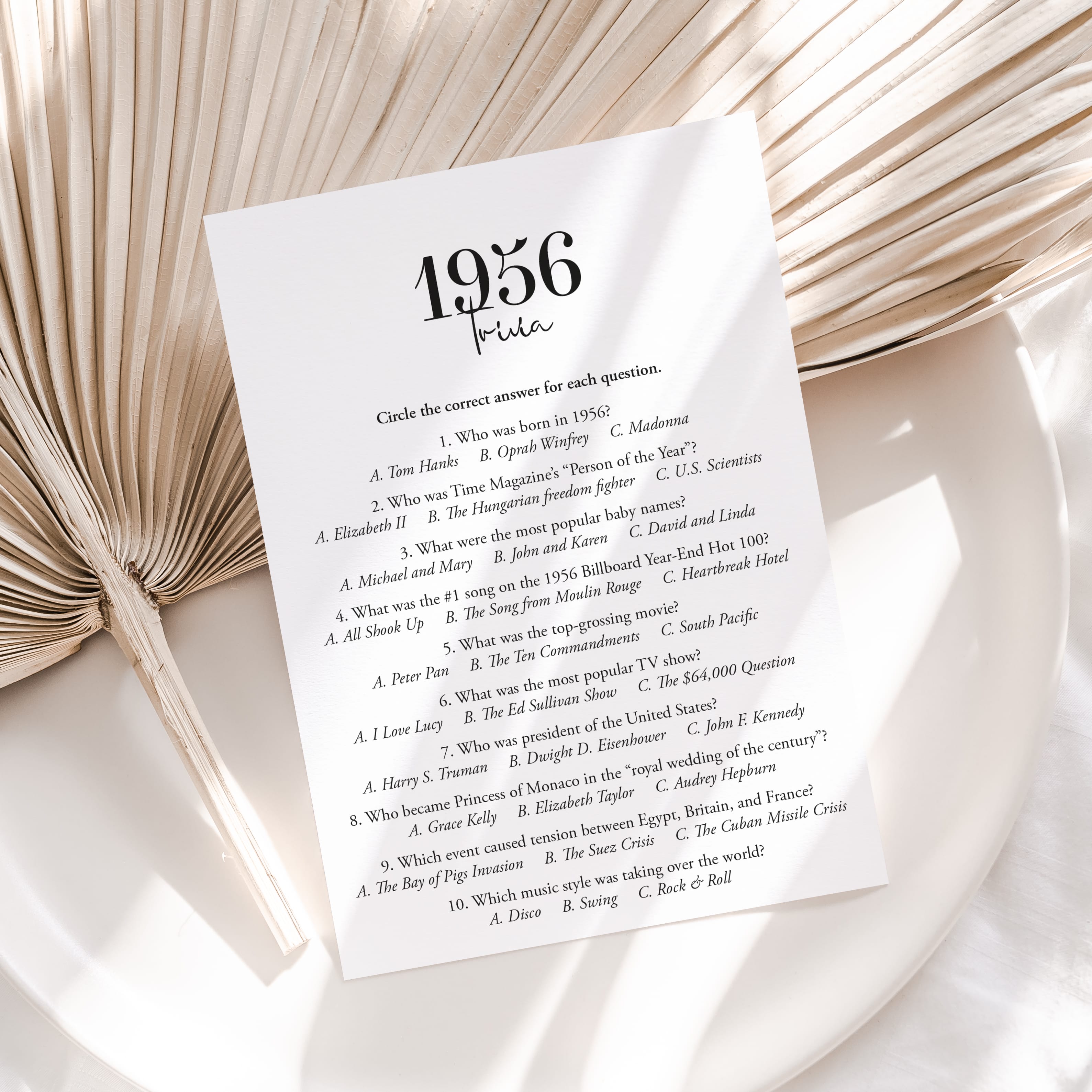 Are you looking for a fun game for a 70th birthday party? Look no further! This modern minimalist 1956 trivia is such a fun game to play with your friends and family. Test your guests how well they know 1956's pop culture. It's the perfect addition to a birthday party for someone born in 1956.