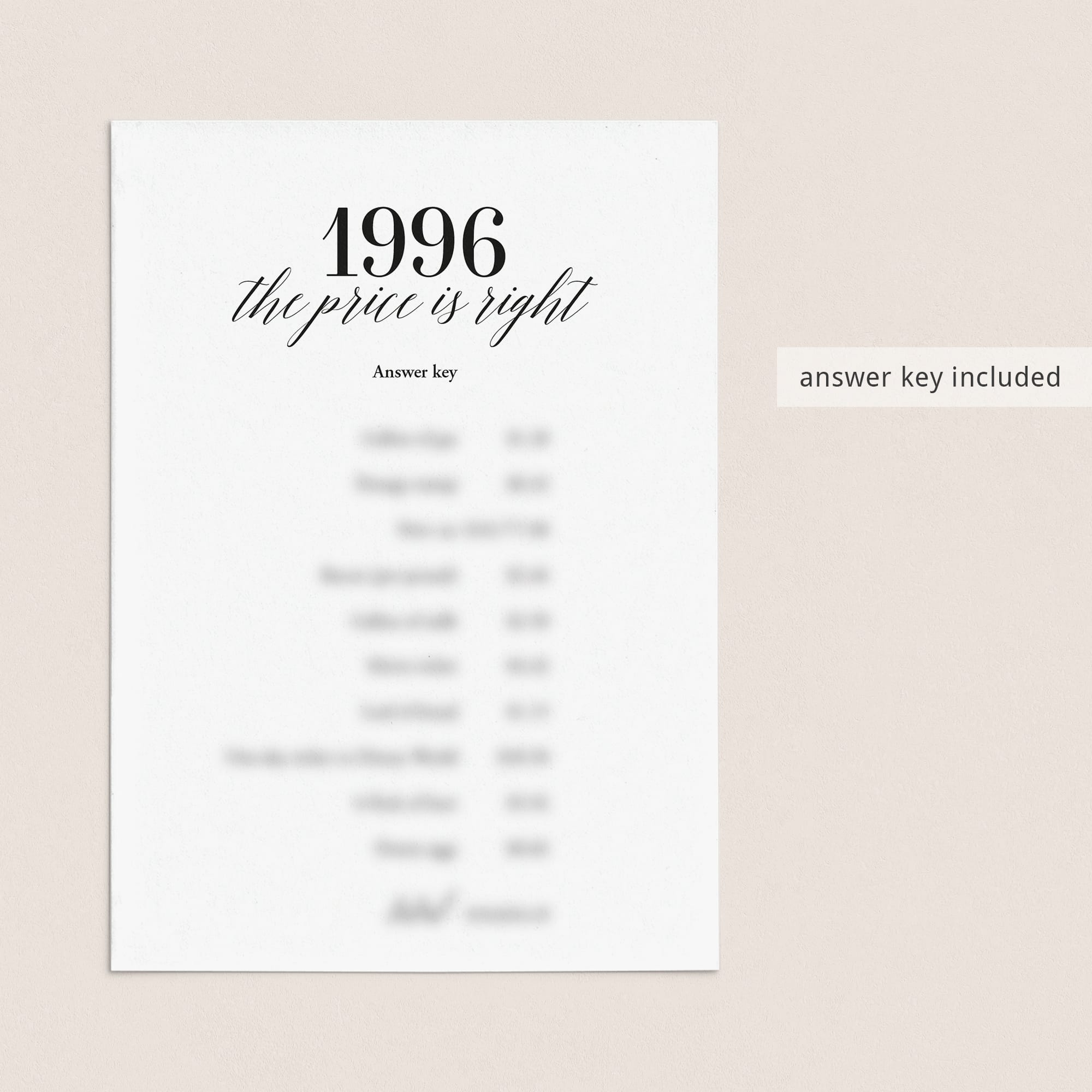 To determine the ultimate winner, simply add up everyone's guesses and see who comes closest to the actual total of these 1996 prices. It's a game of memory and estimation that will have your guests engaged and reminiscing about the good ol' days.