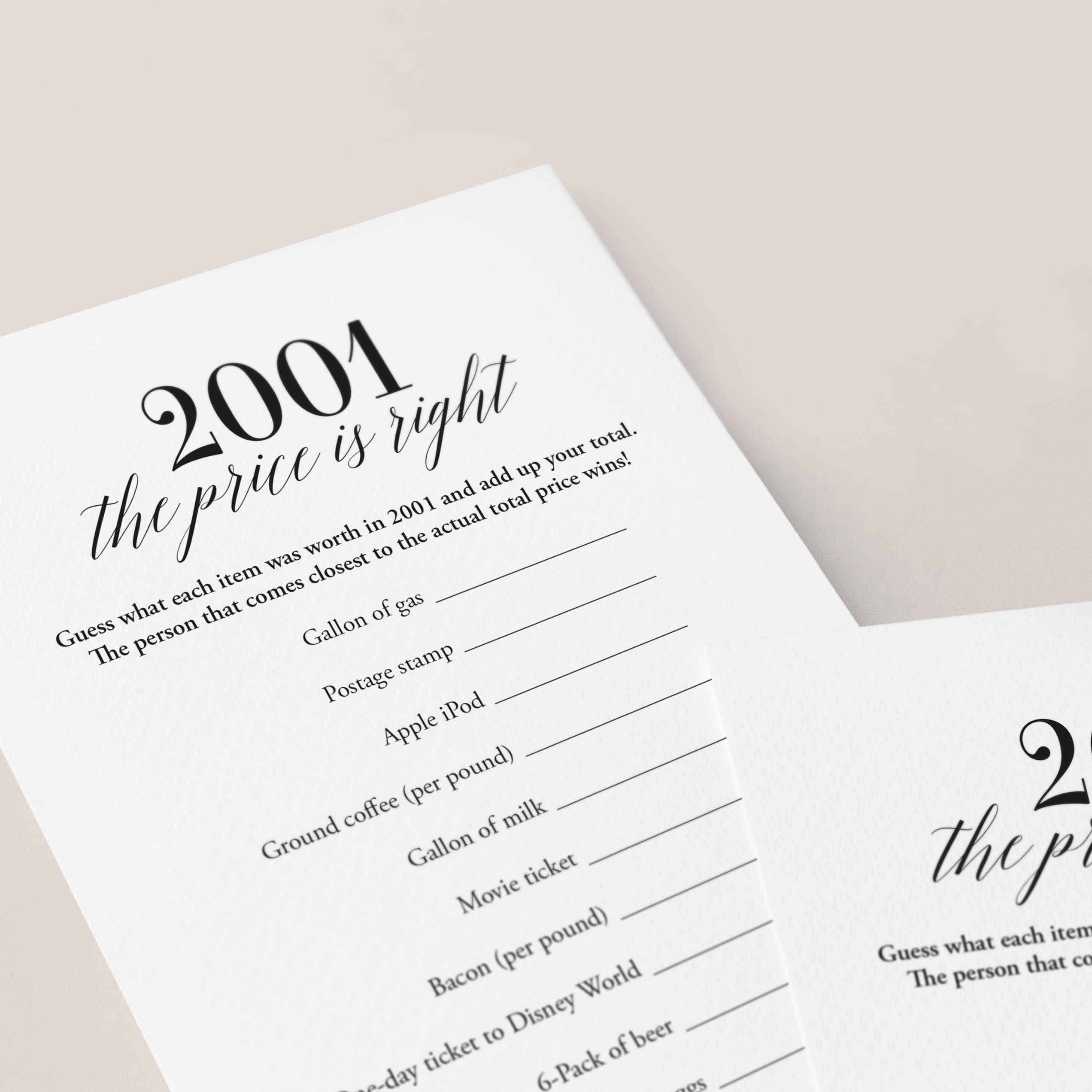 To determine the ultimate winner, simply add up everyone's guesses and see who comes closest to the actual total of these 2001 prices. It's a game of memory and estimation that will have your guests engaged and reminiscing about the good ol' days.