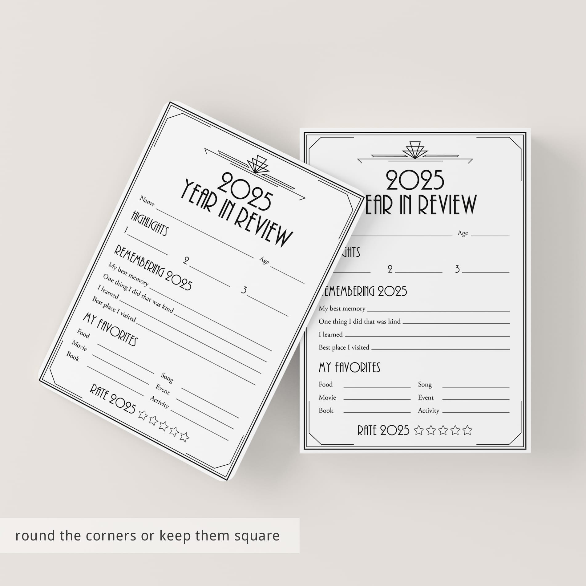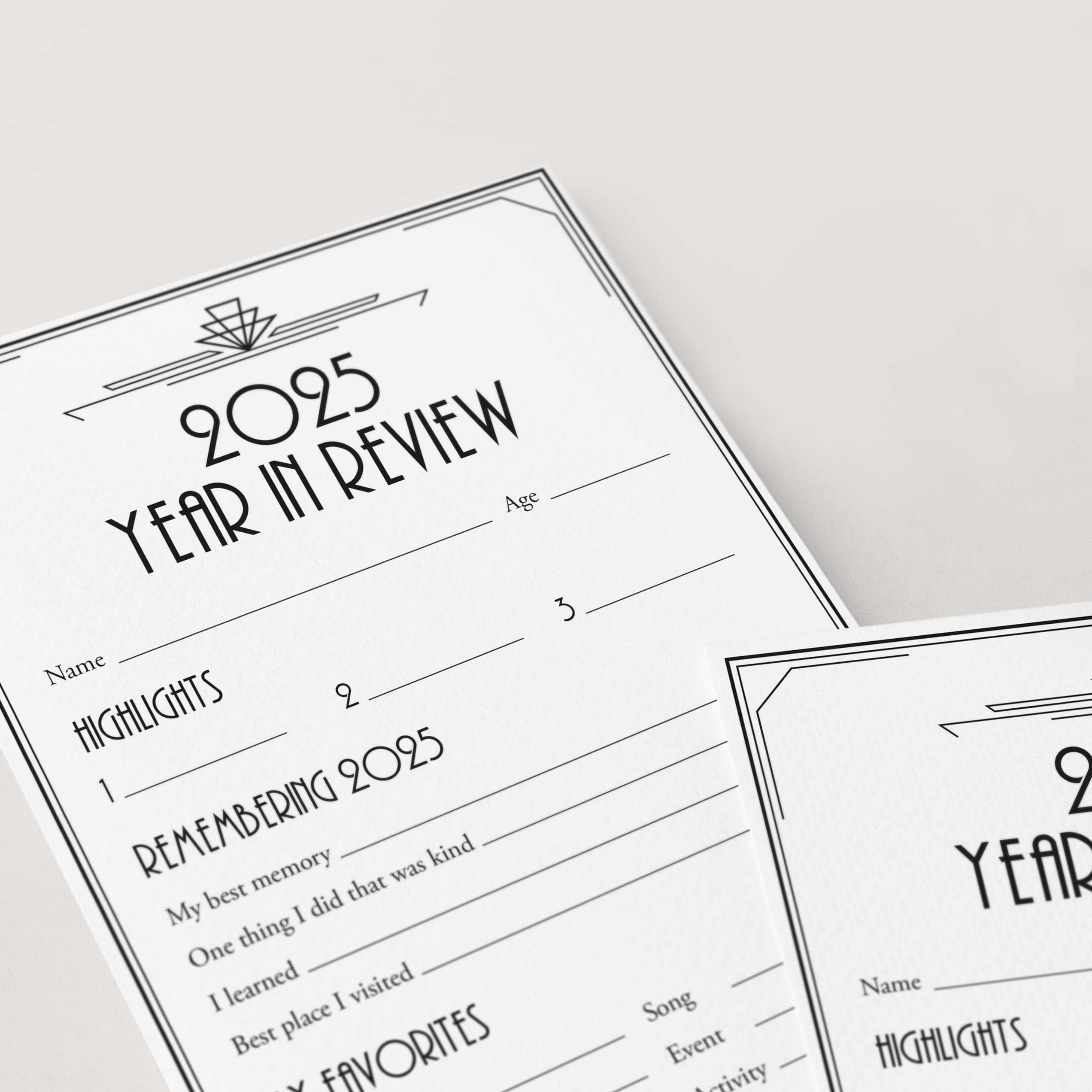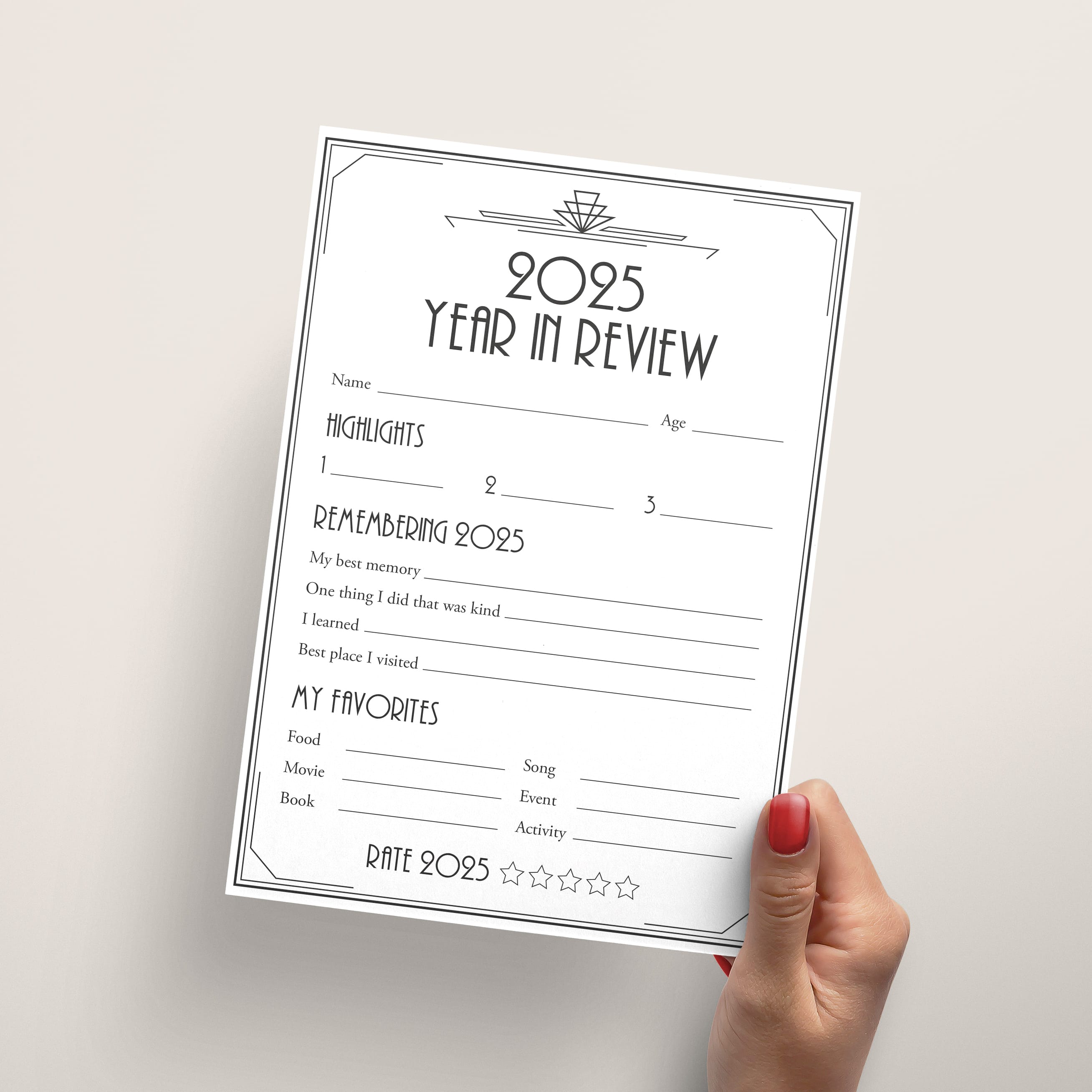 Take a look back at 2025 with this Year in Review Card. This Gatsby theme Year in Review will help you reflect on the past year. It's a great activity for your Gatsby New Years Party and a wonderful keepsake. Write down your highlights of 2025, your best memories and your favorites of the year.