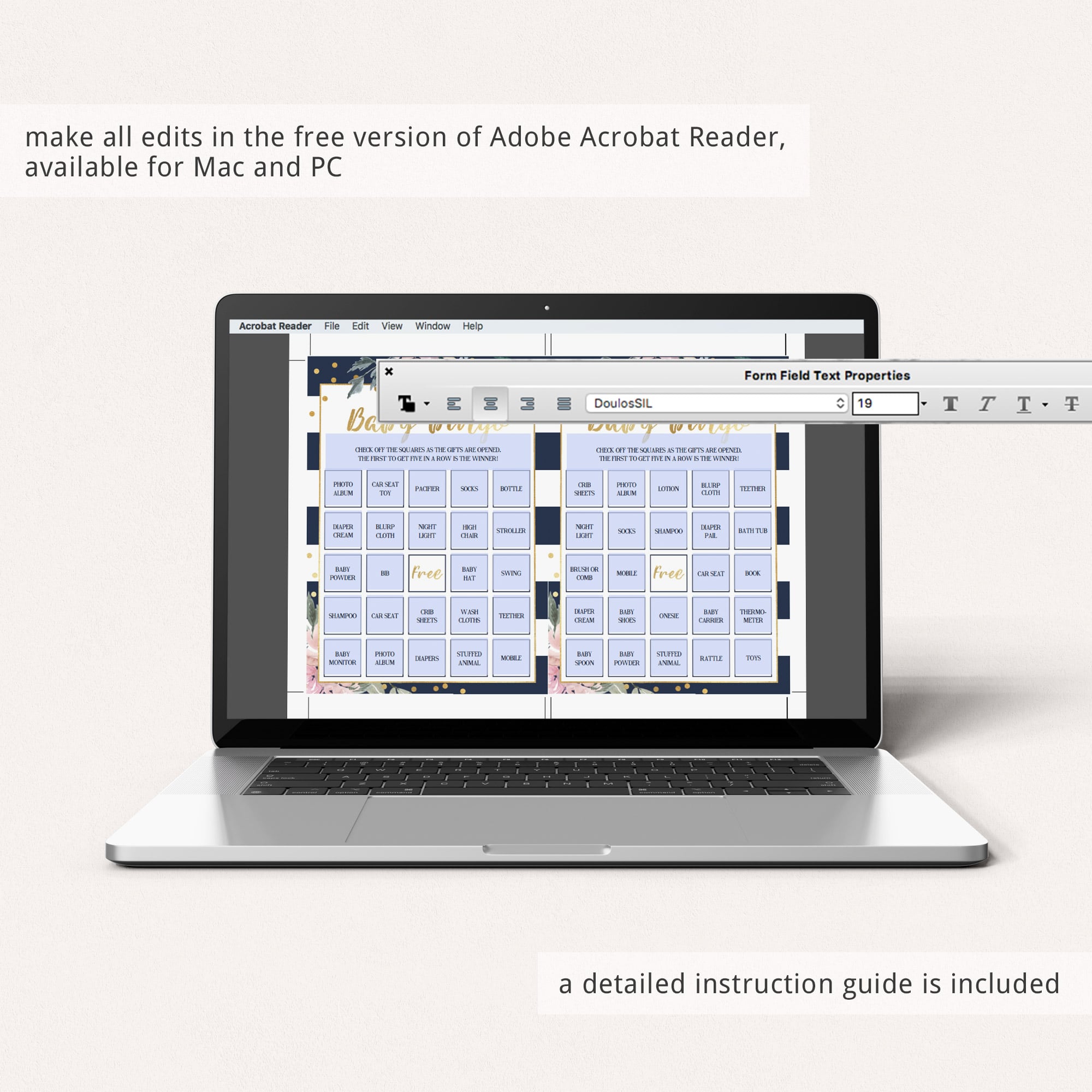 The baby shower bingo cards are instant downloadable files that can be printed right from your computer in a matter of minutes. Or you can have them printed by your favorite print shop. We recommend printing on a nice heavy card stock for the highest quality feel. A detailed instruction guide, with tips & tricks on editing, printing, trimming and more is included.