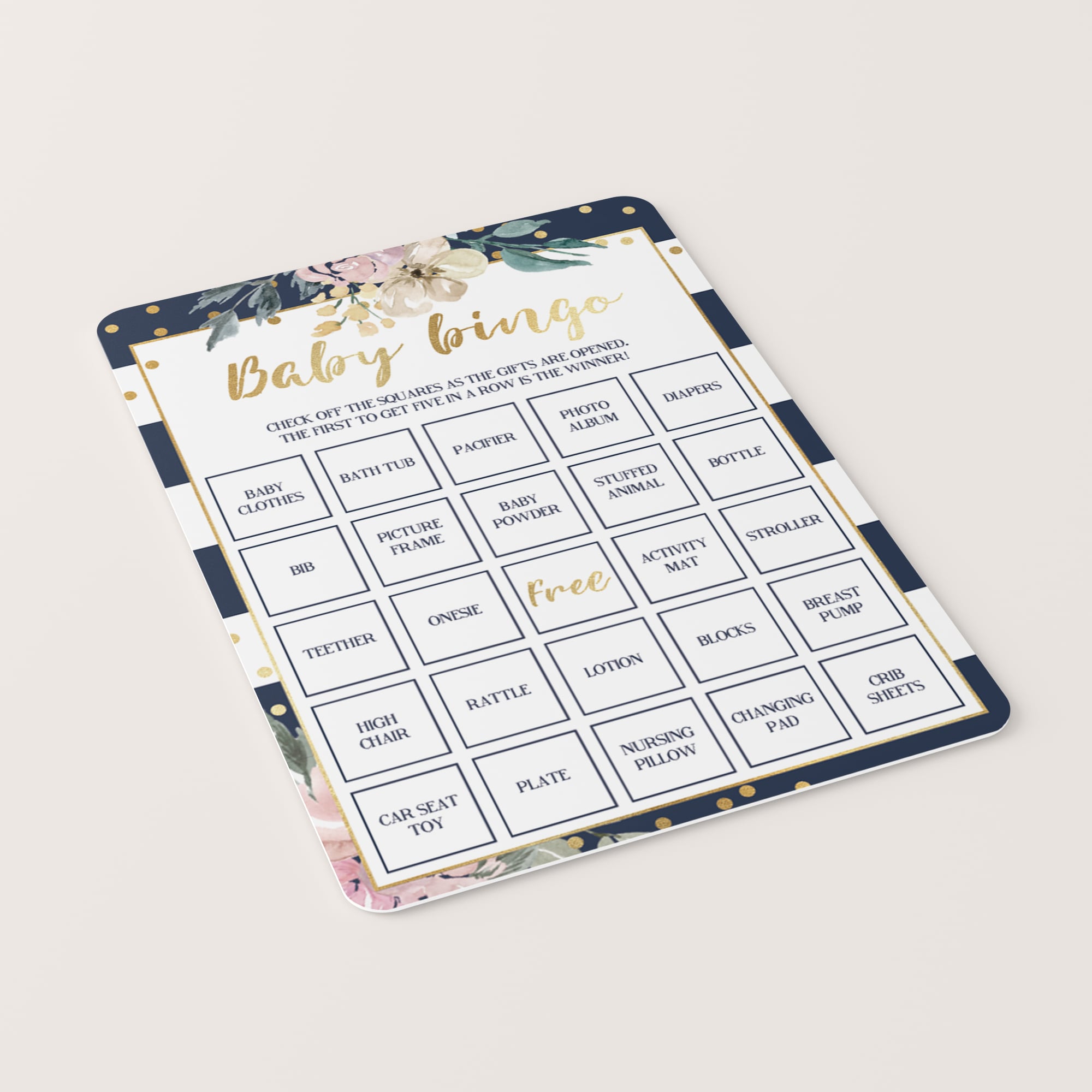 Let not only the mom-to-be enjoy unpacking gifts! Play Bingo with these gorgeous navy, pink and gold Baby Bingo cards. The florals in combination with the gold confetti give these game cards a festive look and will make everyone excited!