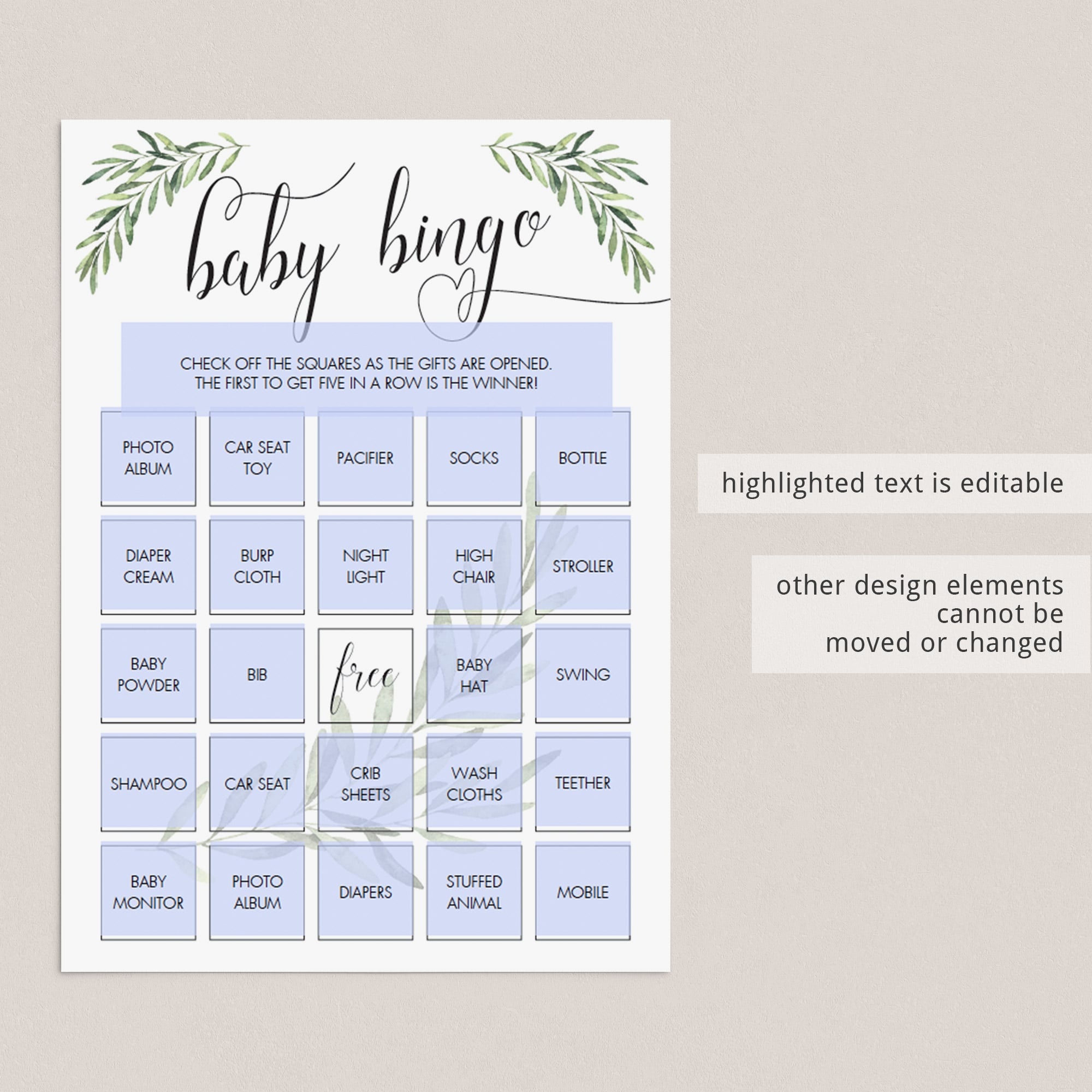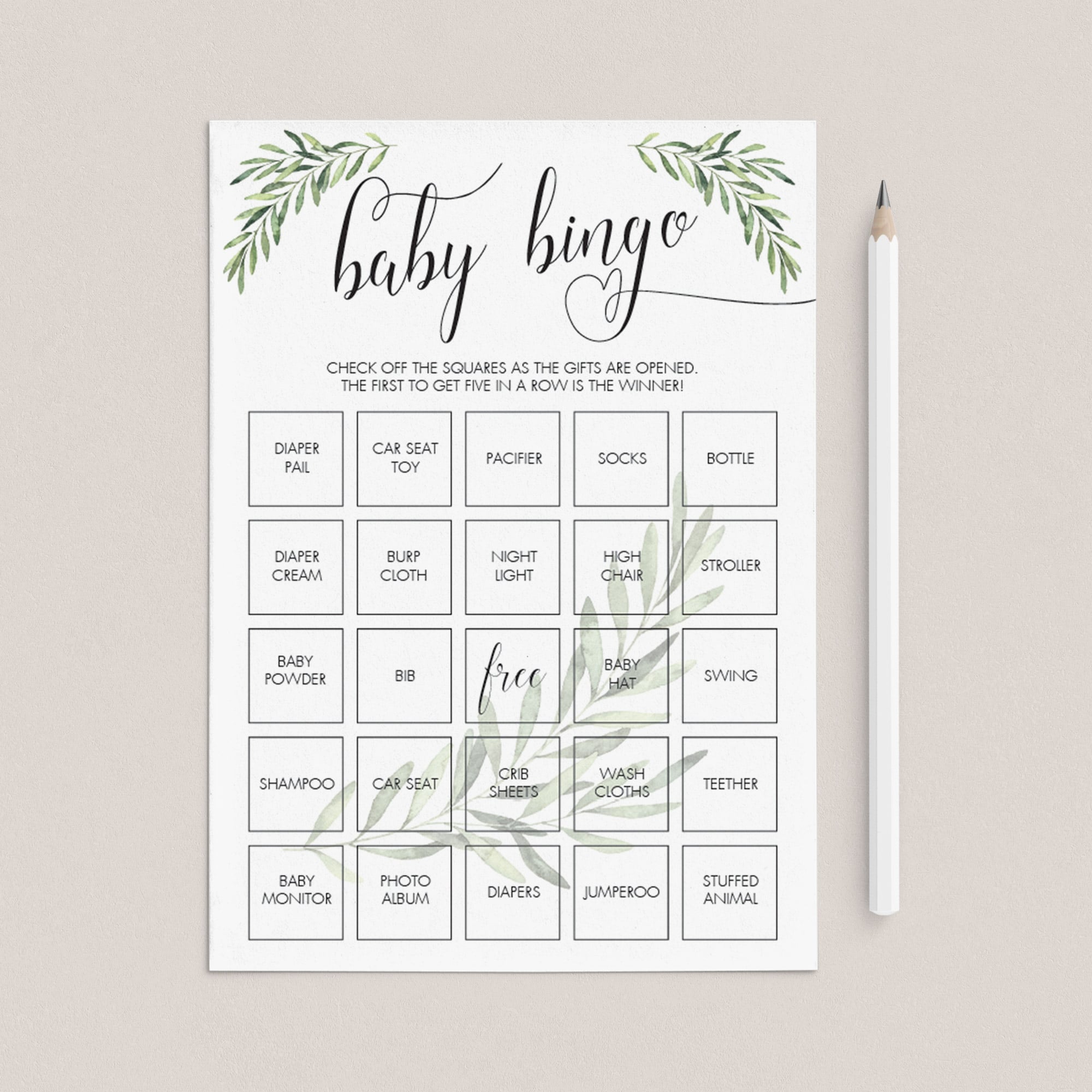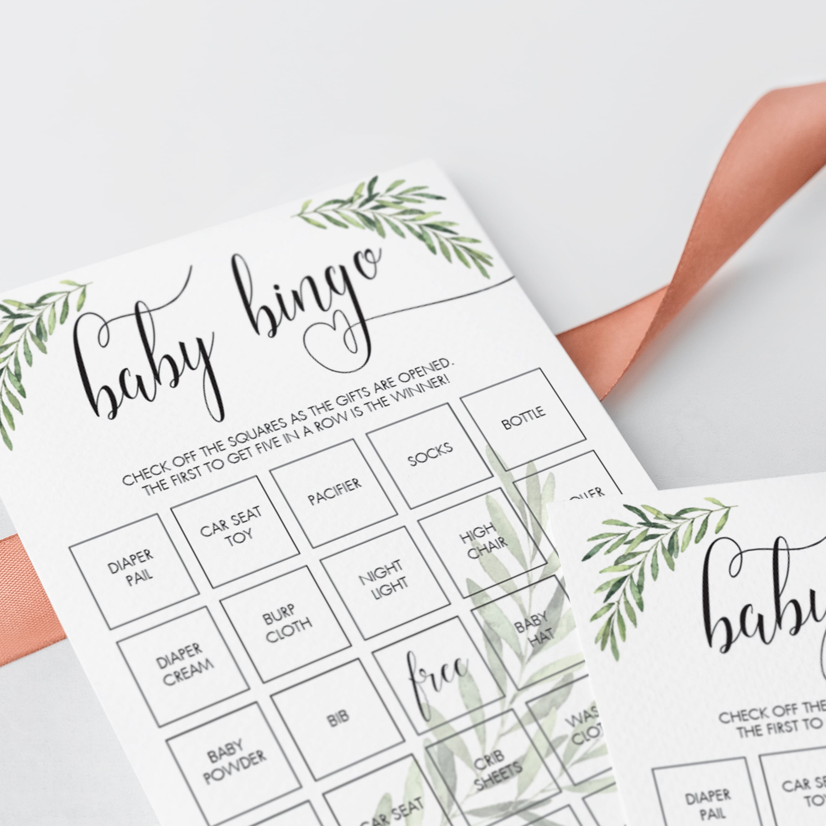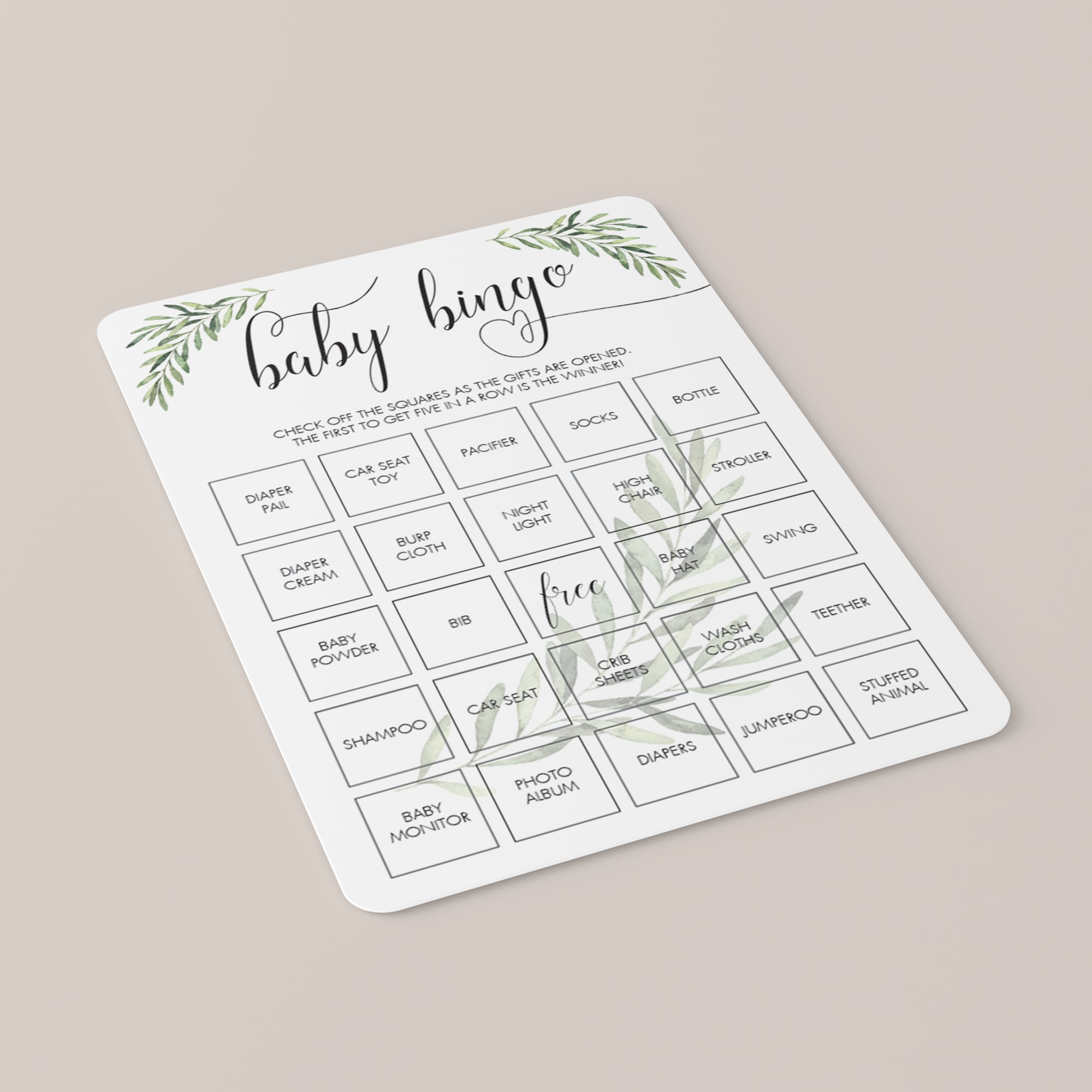 Hand out the greenery baby bingo cards to your guests and let them check off the squares as the gifts are being opened by the bride-to-be. The first to get five in a row is the winner!