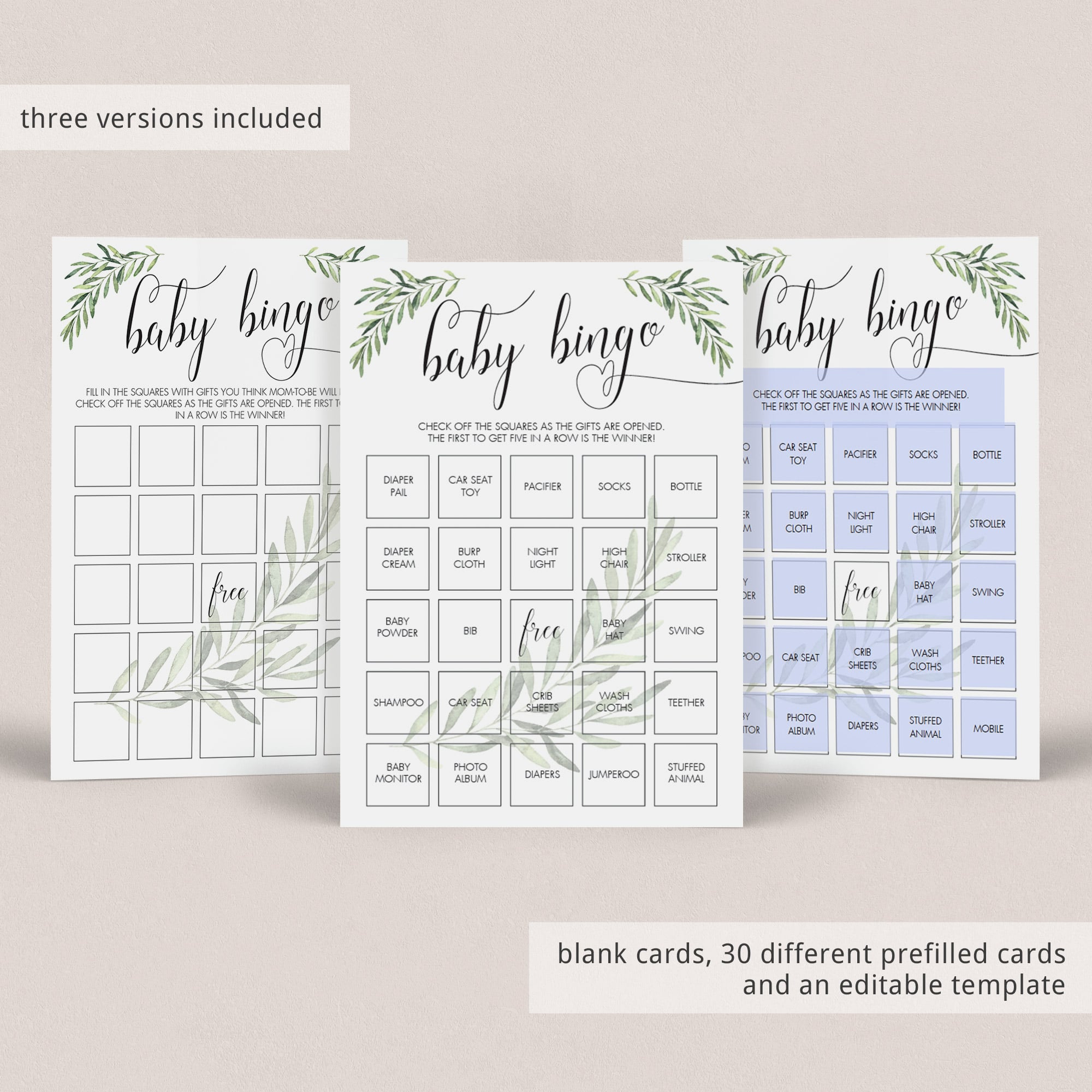 Are you hosting a gender neutral or greenery themed baby shower? Let not only the mom-to-be enjoy unpacking gifts! Play Baby Bingo with these unique baby bingo cards with green foliage and calligraphy font.