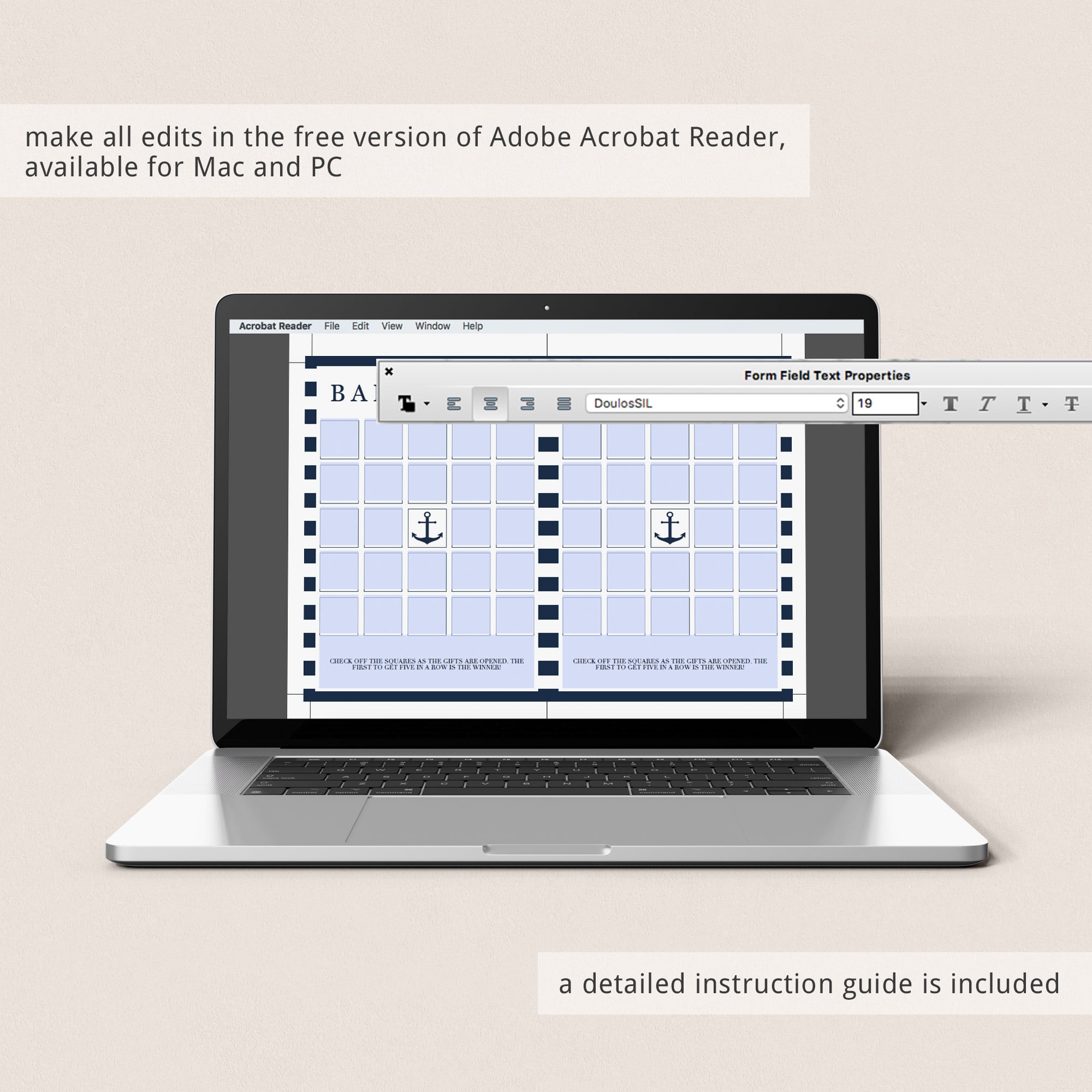The nautical baby bingo cards are affordable printables that can be printed at home or ordered from a local or online print shop. We've included a detailed instruction guide to make the process as smooth as possible!