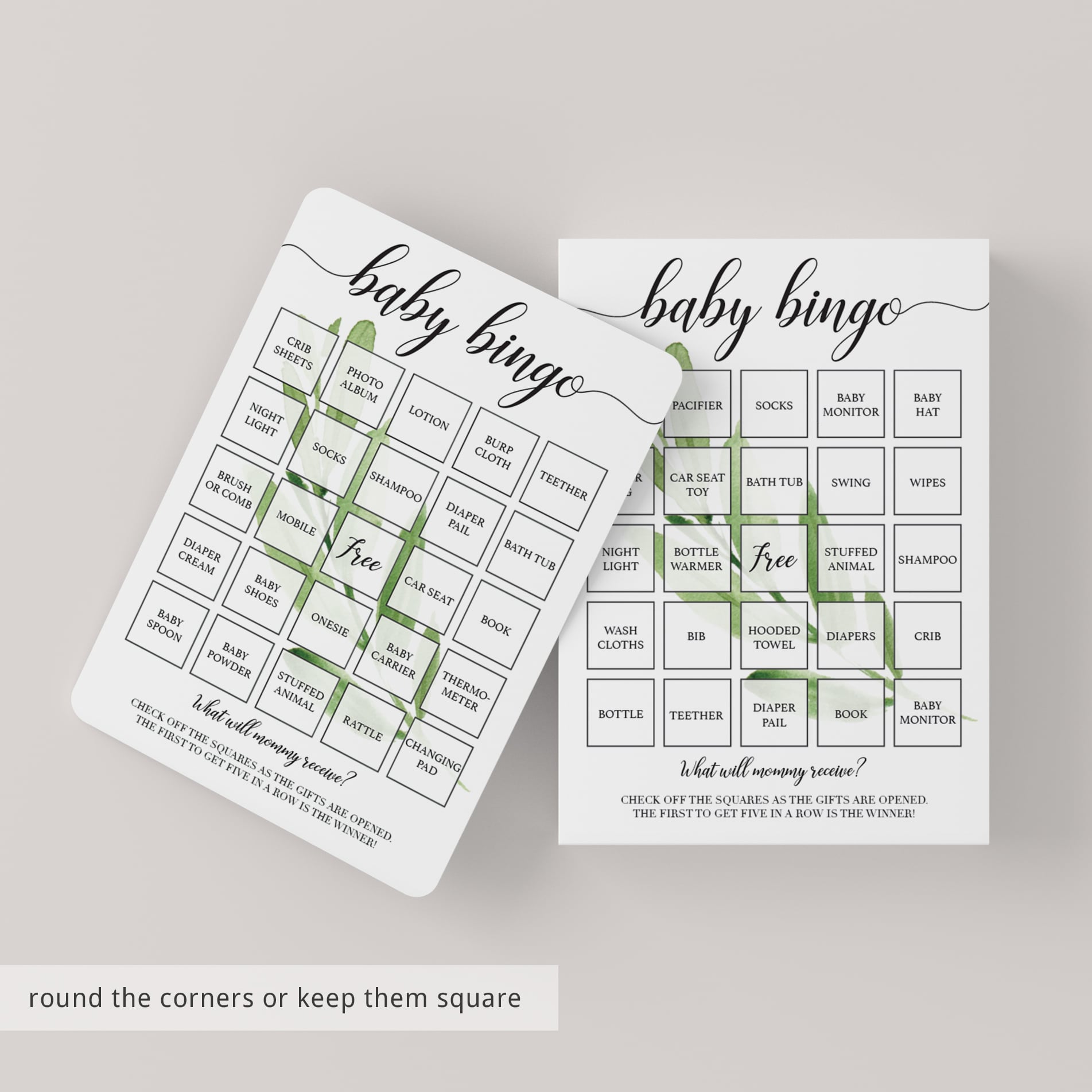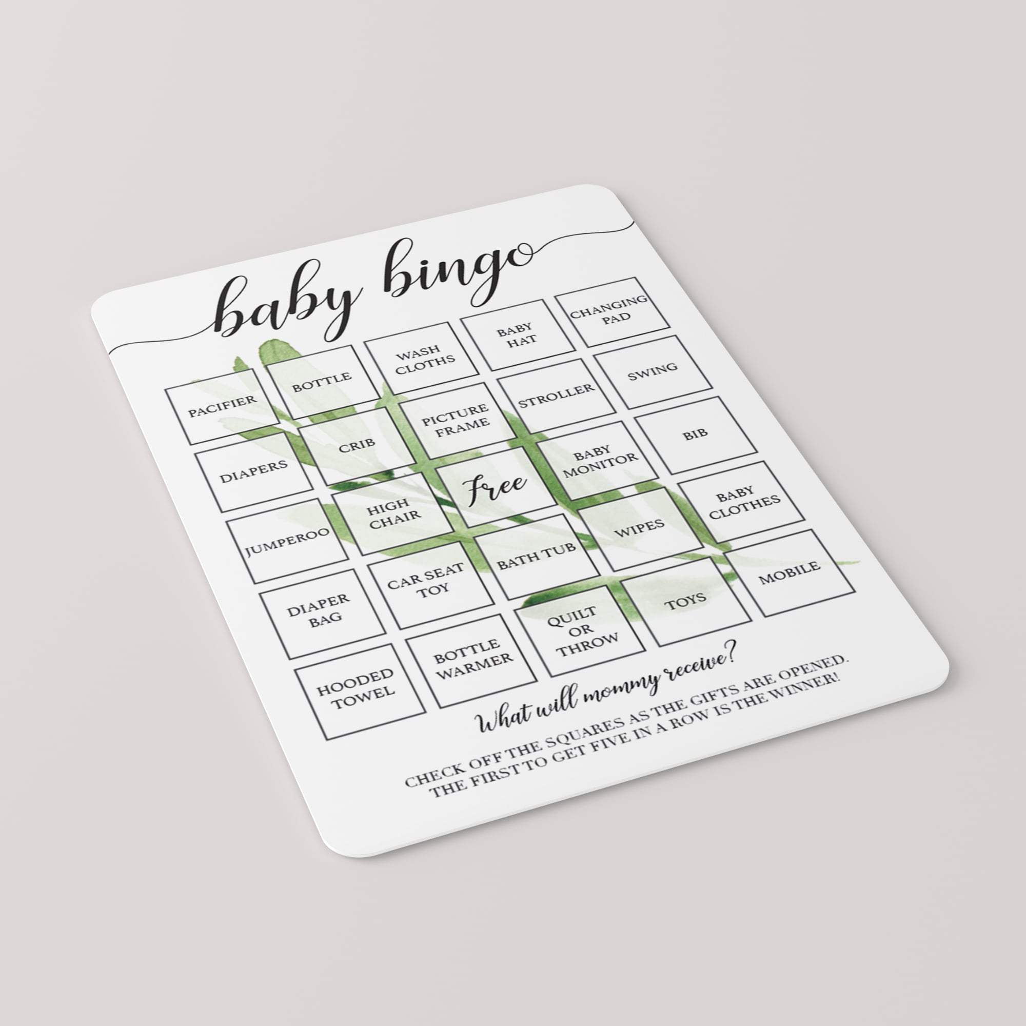 Let not only the mom-to-be enjoy unpacking gifts! Play Bingo with these greenery baby shower baby bingo cards. Check off the squares as the gifts are opened. The first to get five in a row is the winner!