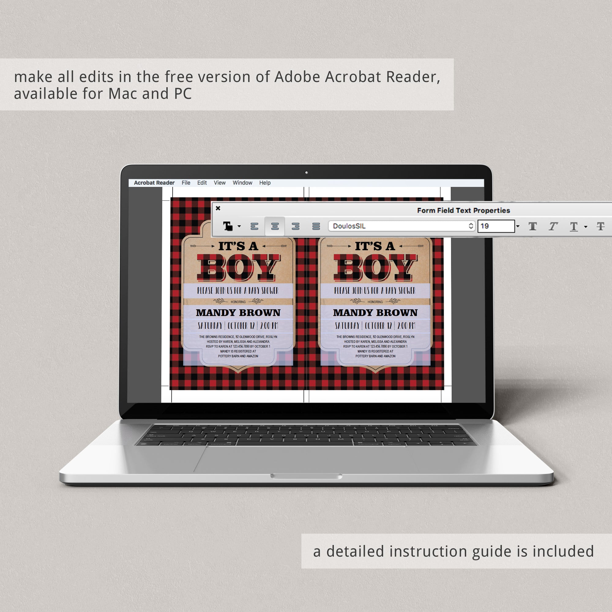 • 1 Editable PDF sized 5” x 7” to print or to use as evite