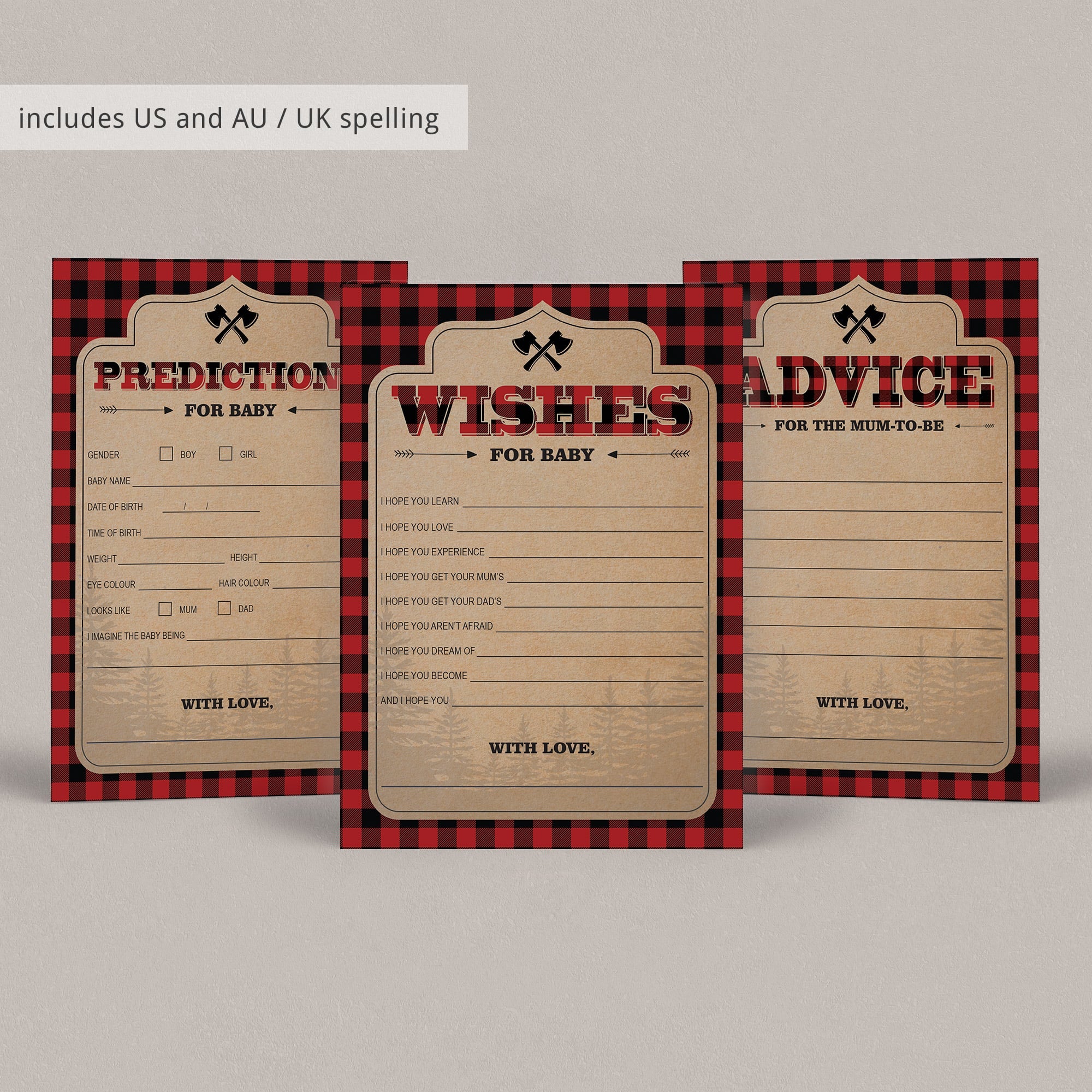 For the Advice card for the mom-to-be and for the parents-to-be, Baby Predictions card with and without baby gender prediction, Baby Wishes card, all in US English and AU / UK English, each: