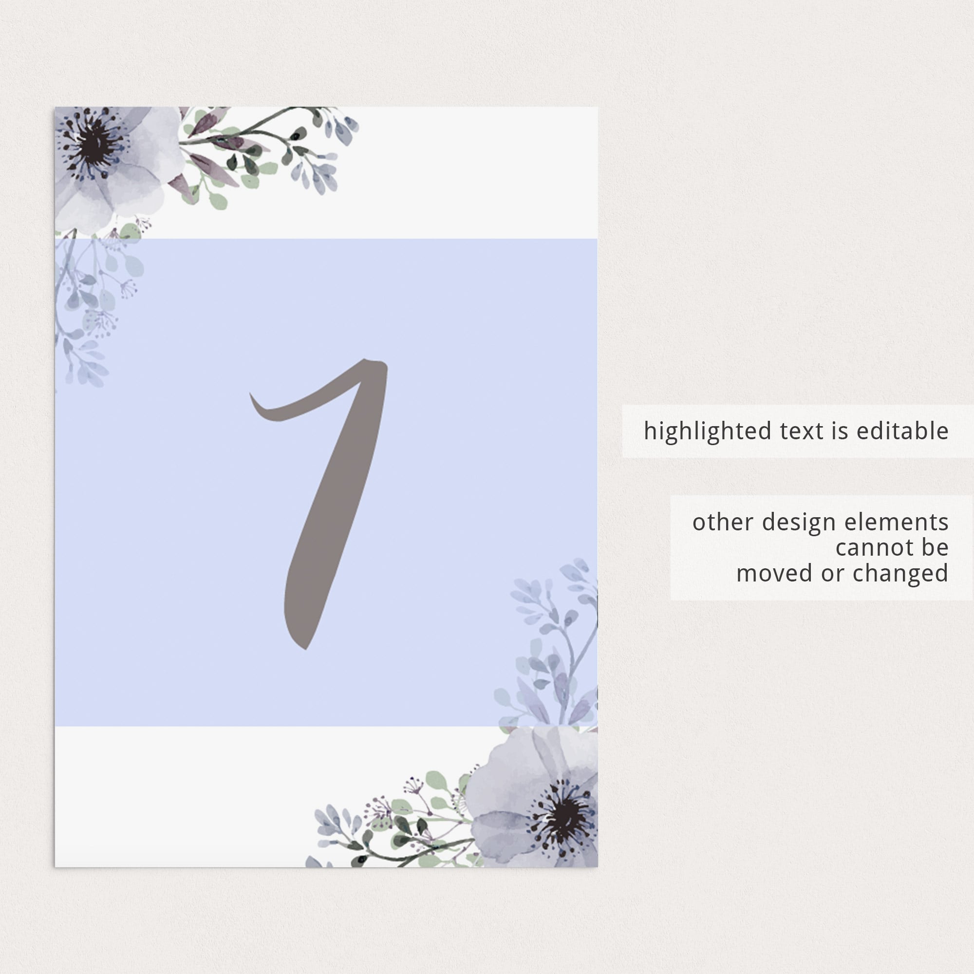 The table number template is editable in Adobe Acrobat Reader (free download). Print the purple table number cards one-sided or double-sided. A detailed instruction guide is included as well, so that customizing the PDF templates will be an easy and fun DIY project for anyone.
