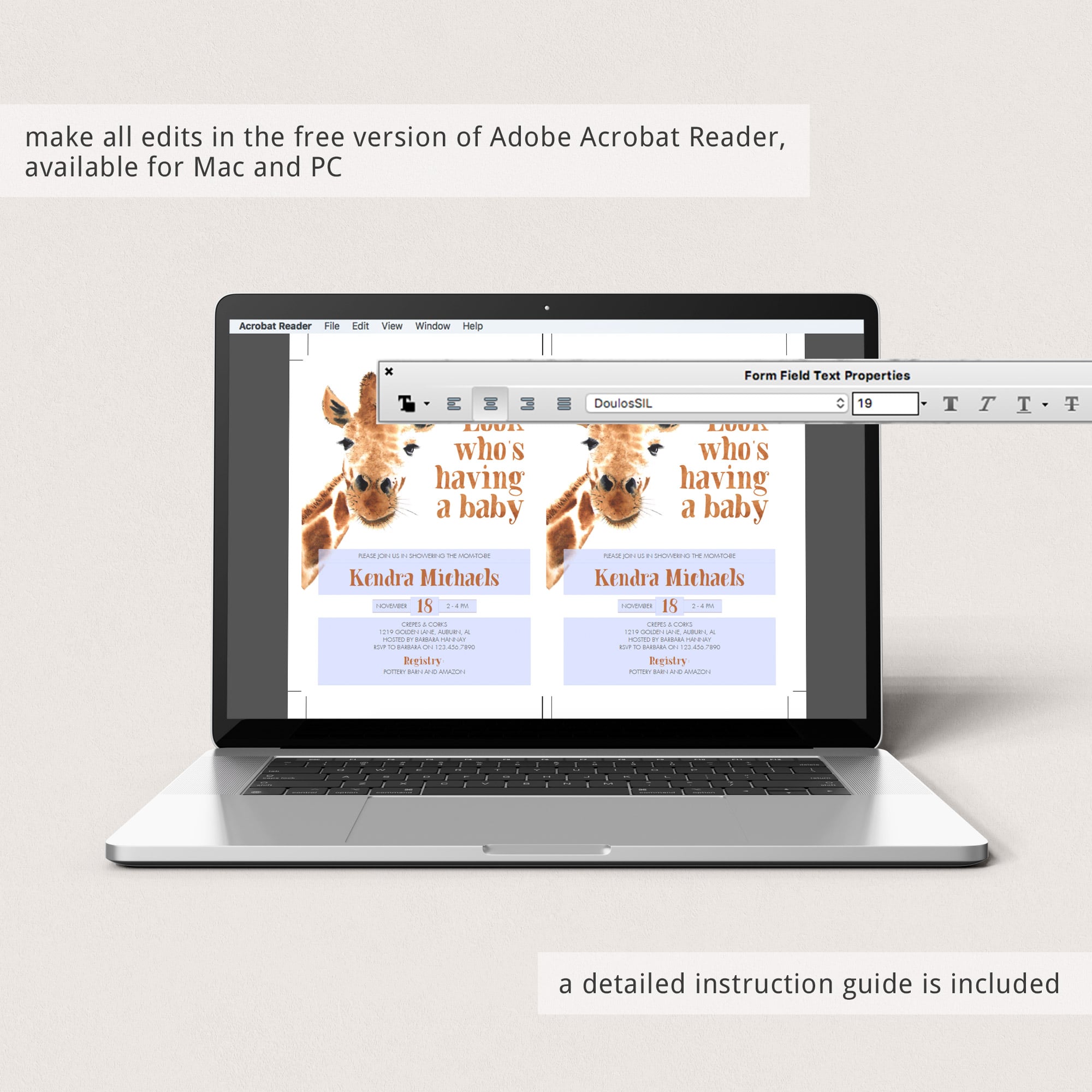 • 1 Editable PDF sized 5” x 7” to print or to use as evite
