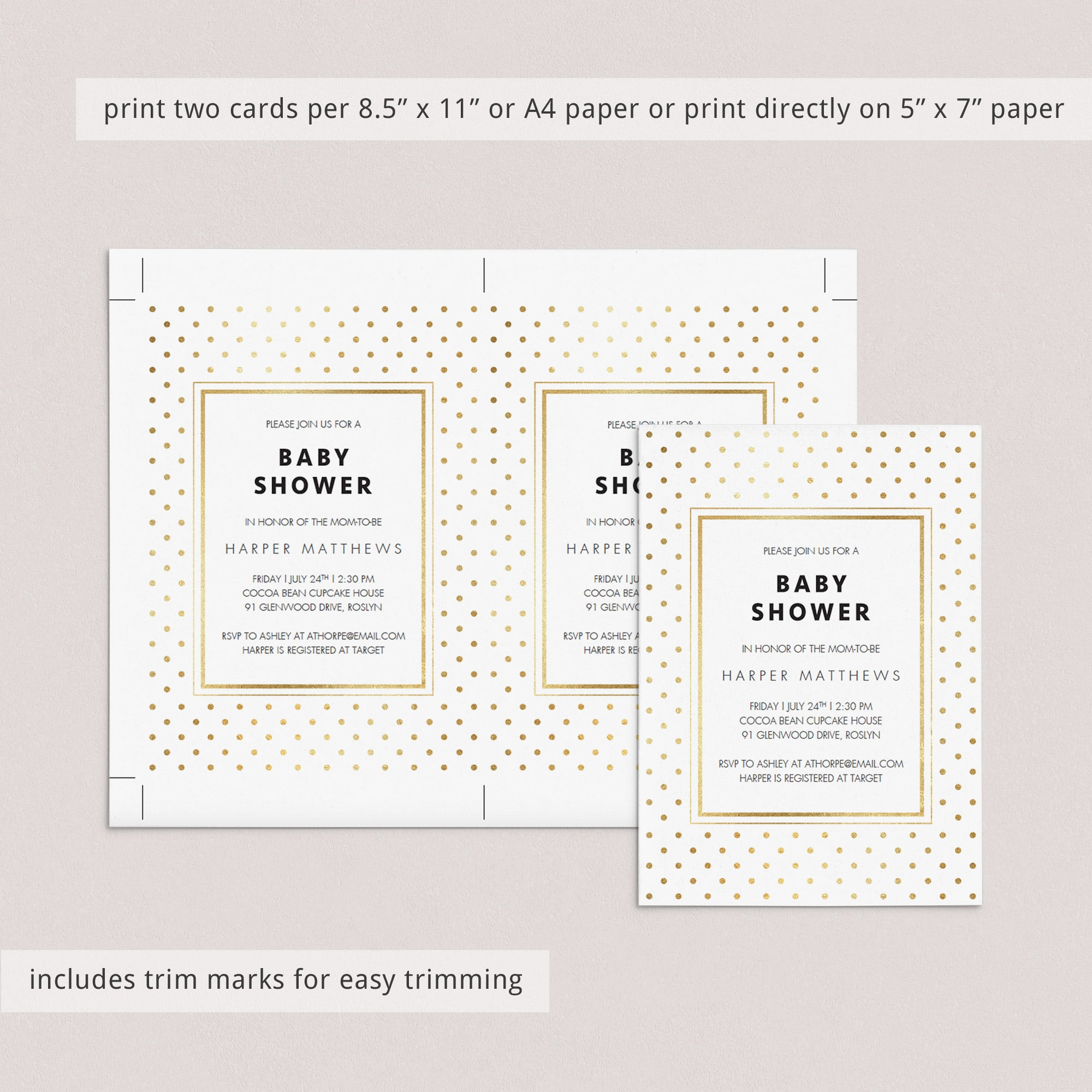 Are you hosting a gold themed baby shower? Make the perfect announcement with this modern gold baby shower invitation set. The set includes the Baby Shower Invitation, a Diaper Raffle ticket and a Book Request card. It is perfect for a gender neutral baby shower.