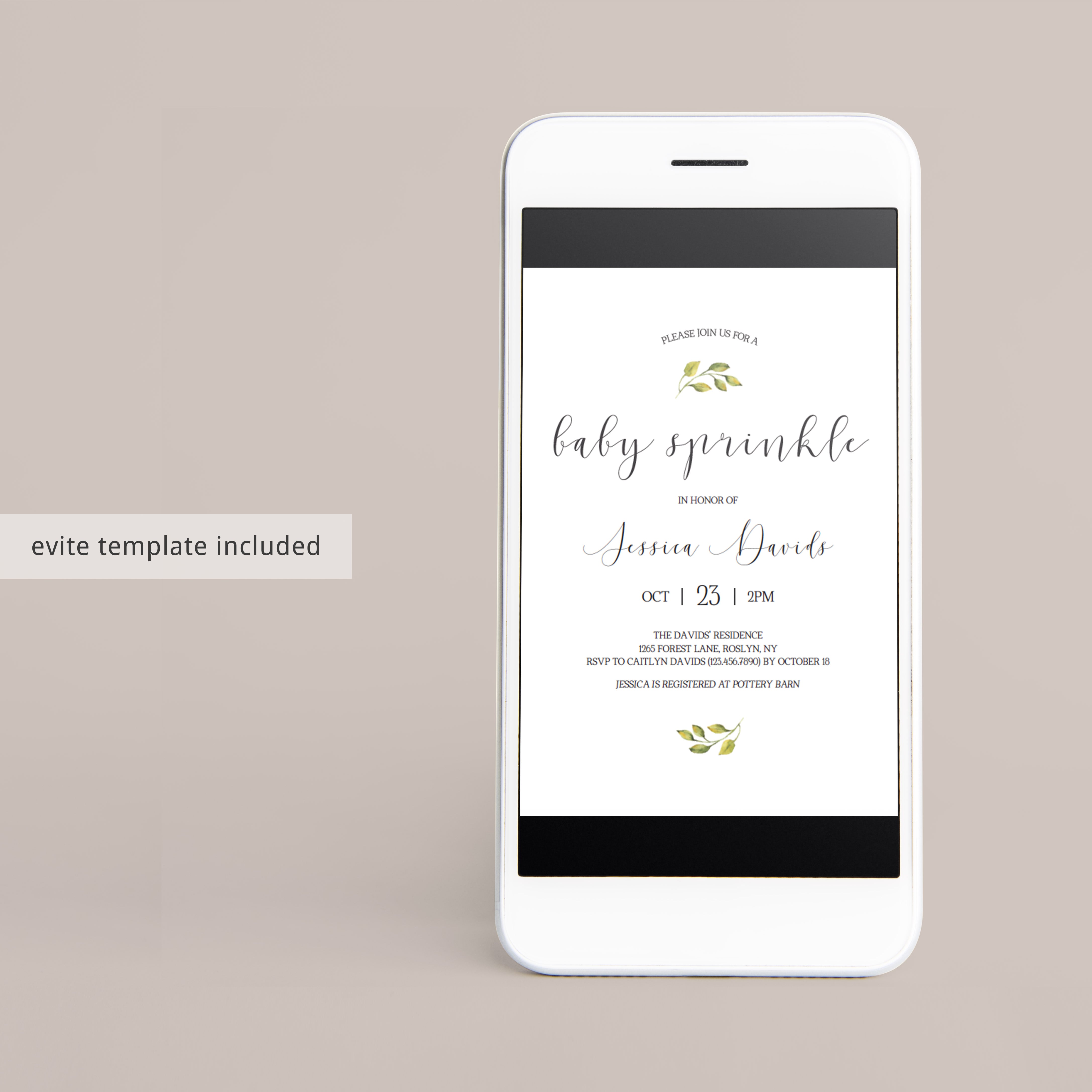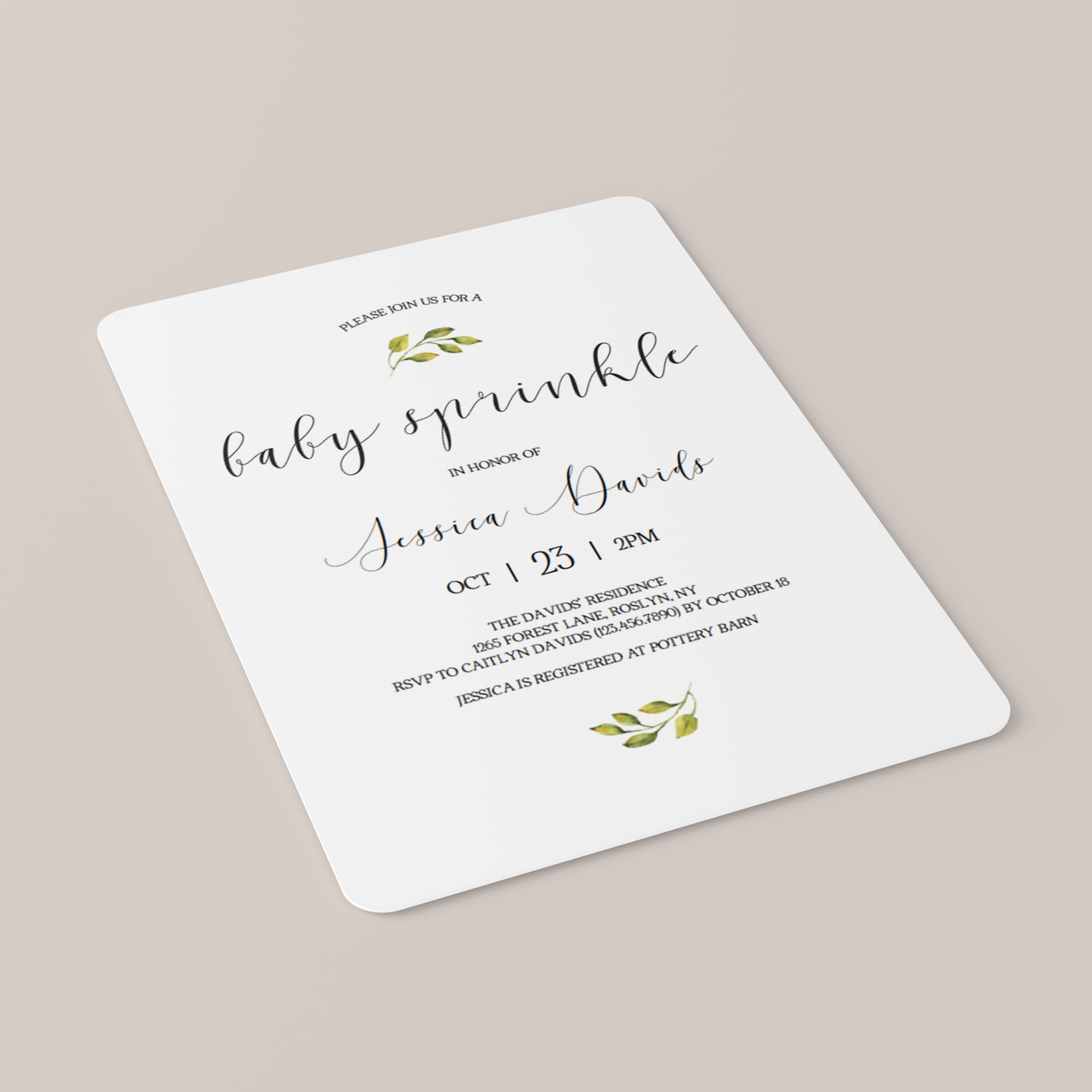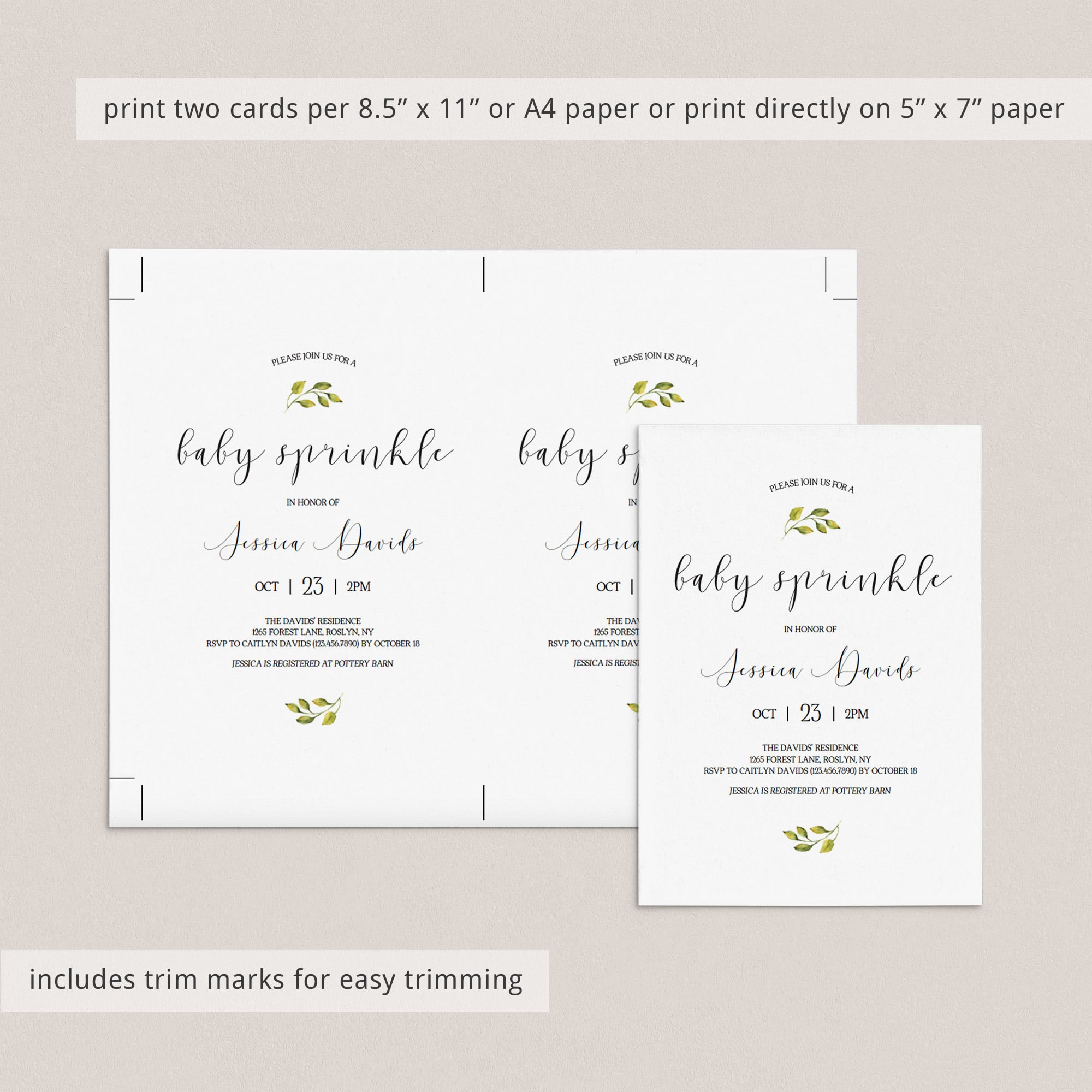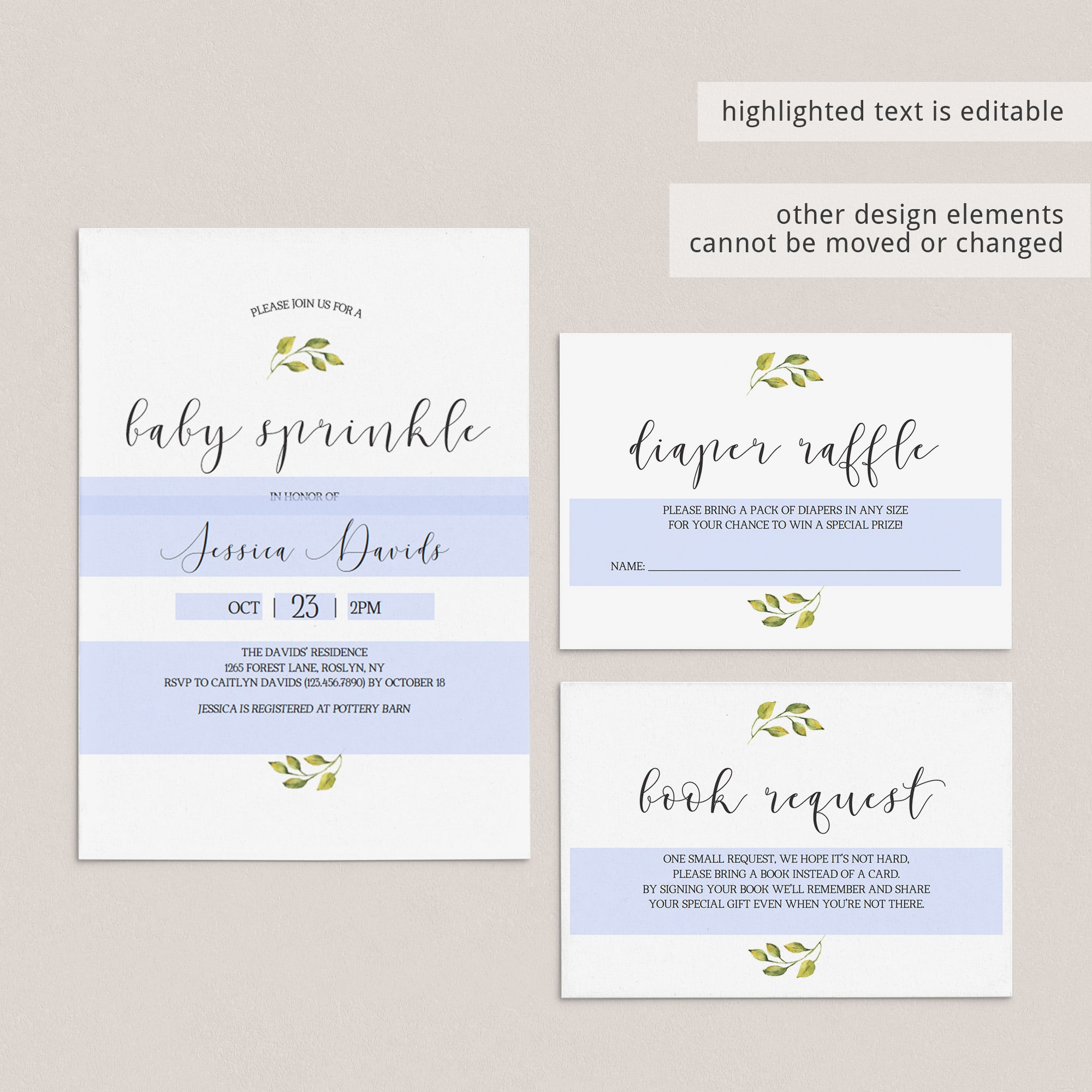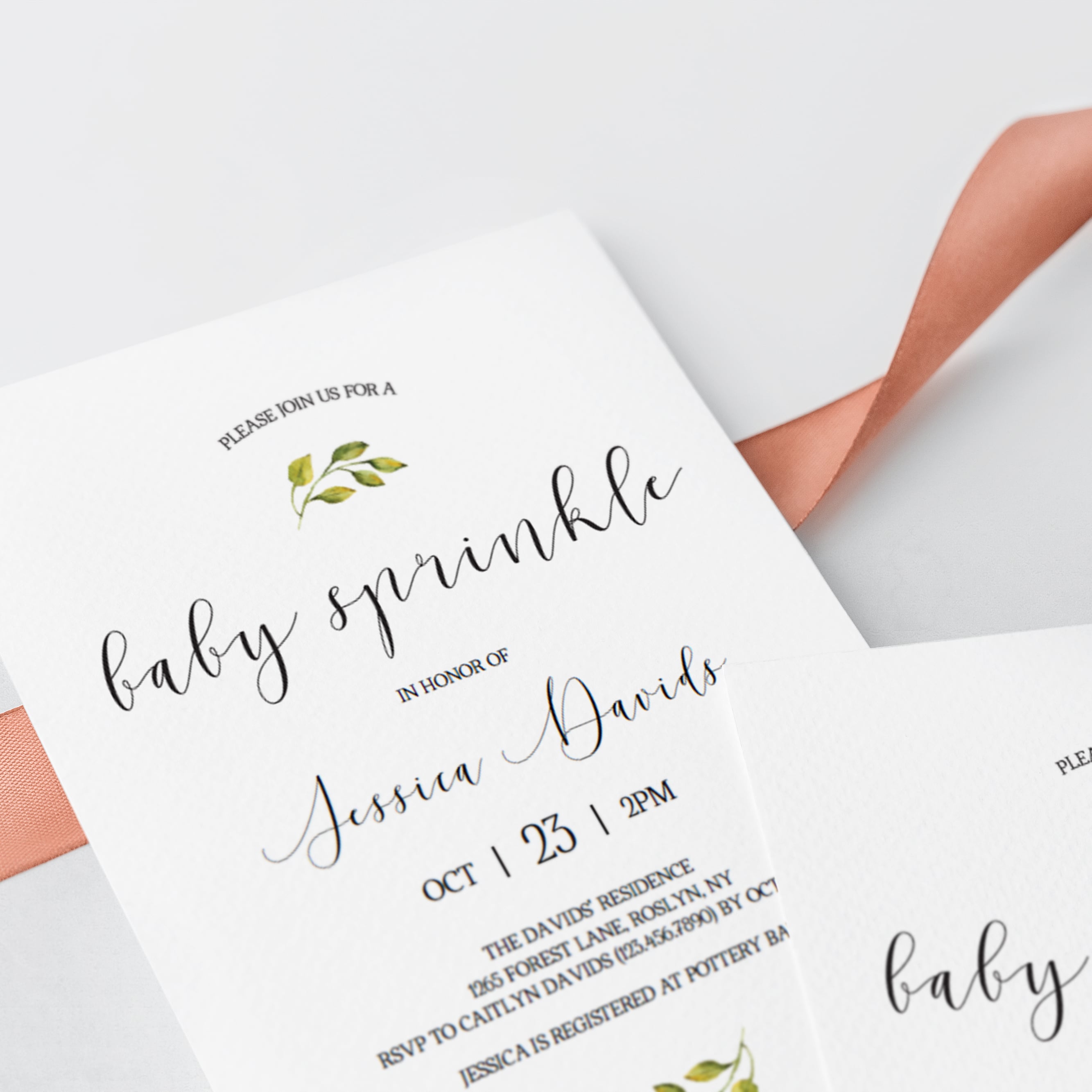Are you hosting a baby sprinkle to celebrate the arrival of a baby brother or sister? Invite your guests in style with this minimal baby sprinkle invitation set with tiny green leaves. Included in the set are the Baby Sprinkle Invitation, a Diaper Raffle ticket and a Book Request card.