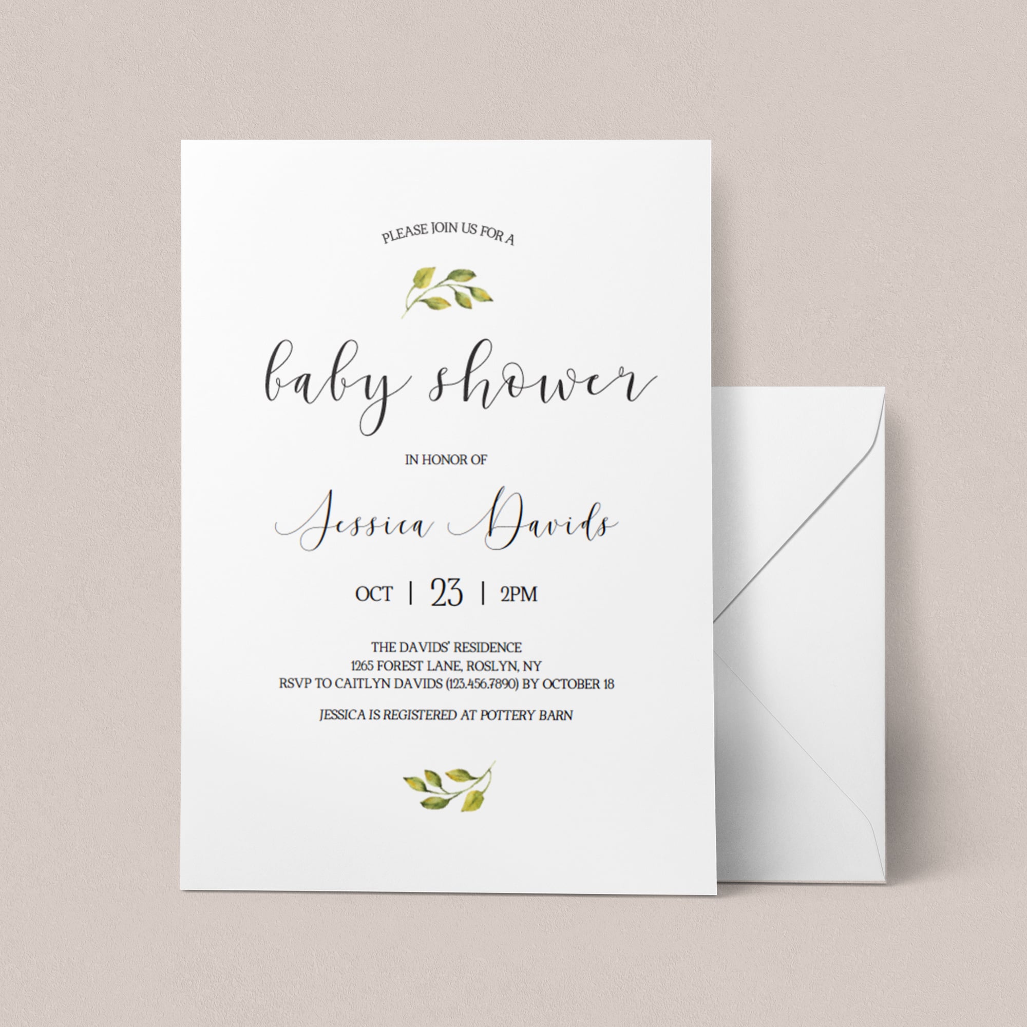 Are you hosting a gender neutral baby shower? Guests will be delighted when they receive this sophisticated white and green baby shower invitation set with tiny leaves. The simple design is perfect for a gender neutral baby shower.