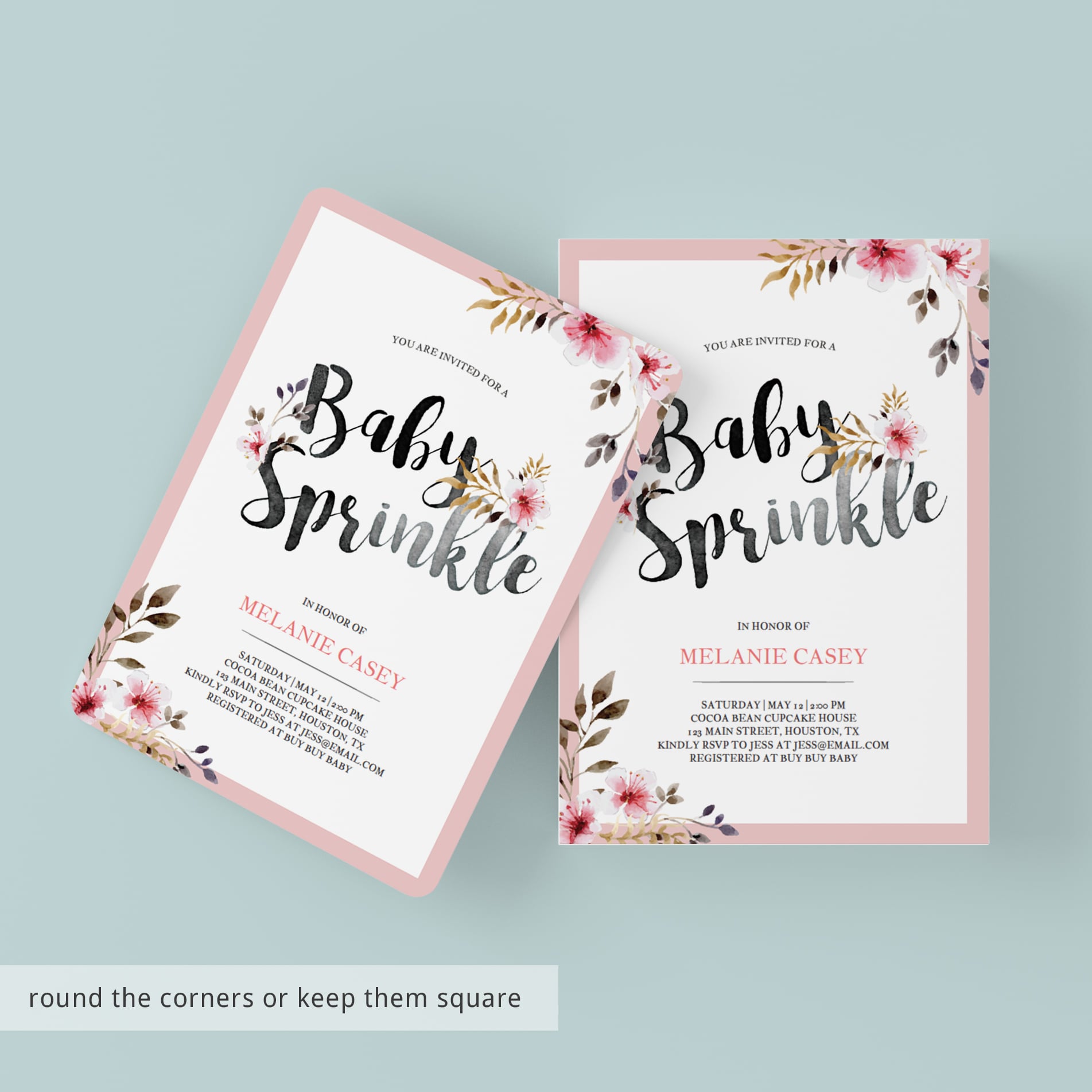 Print the invitations right from your computer or have them printed at your favorite print shop. Or keep it simple and send out a digital baby sprinkle invitation. An evite template is included.