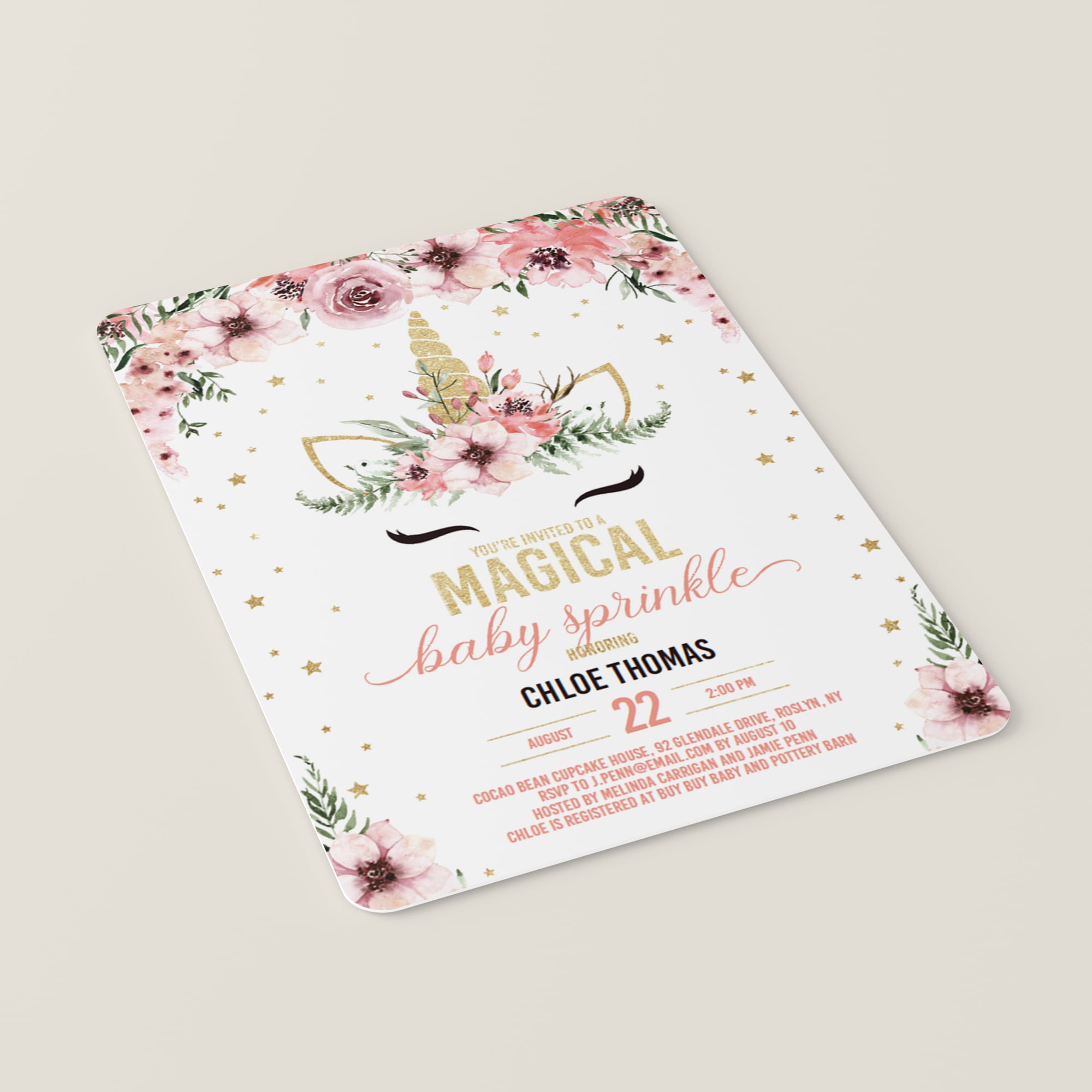 Make everyone go "ooh" and "ahh" with this magical floral unicorn baby sprinkle invitation!