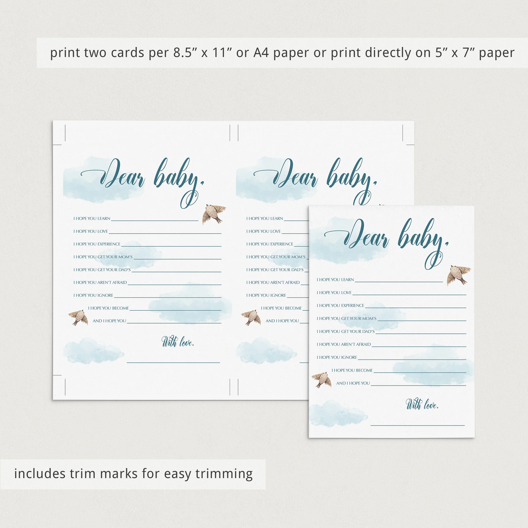 This printable baby wishes card is an instant download, so simply download and print the cards as many times as you need. We recommend printing on a nice heavy card stock for highest quality feel. Print right from your computer in a matter of minutes or have the cards printed at your favorite print shop.