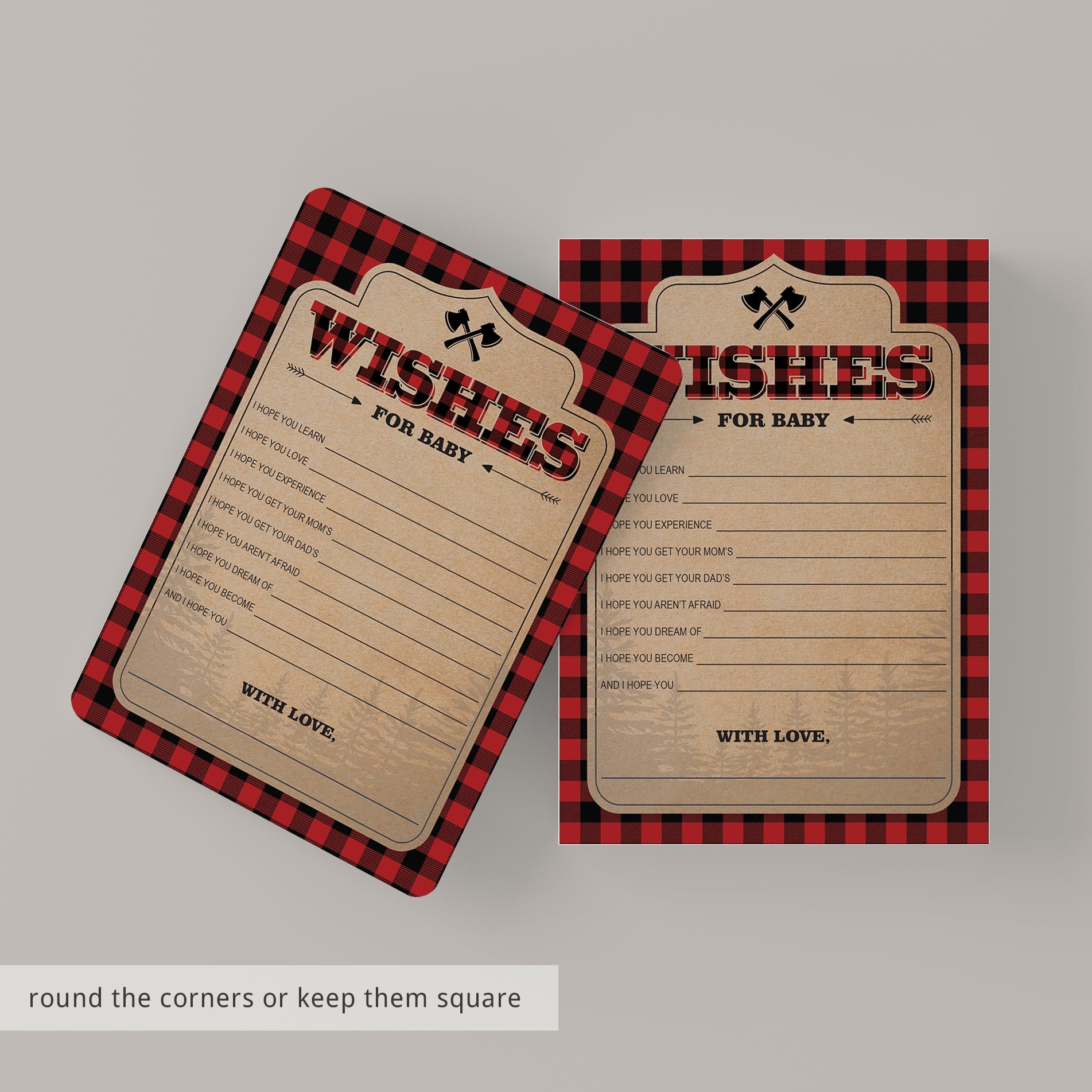 Create a gorgeous keepsake with these lumberjack baby shower wishes for baby cards. They are the perfect addition to a woodland baby shower. Let every baby shower guest write down their wishes for the new baby and collect the cards for the lucky mom-to-be.