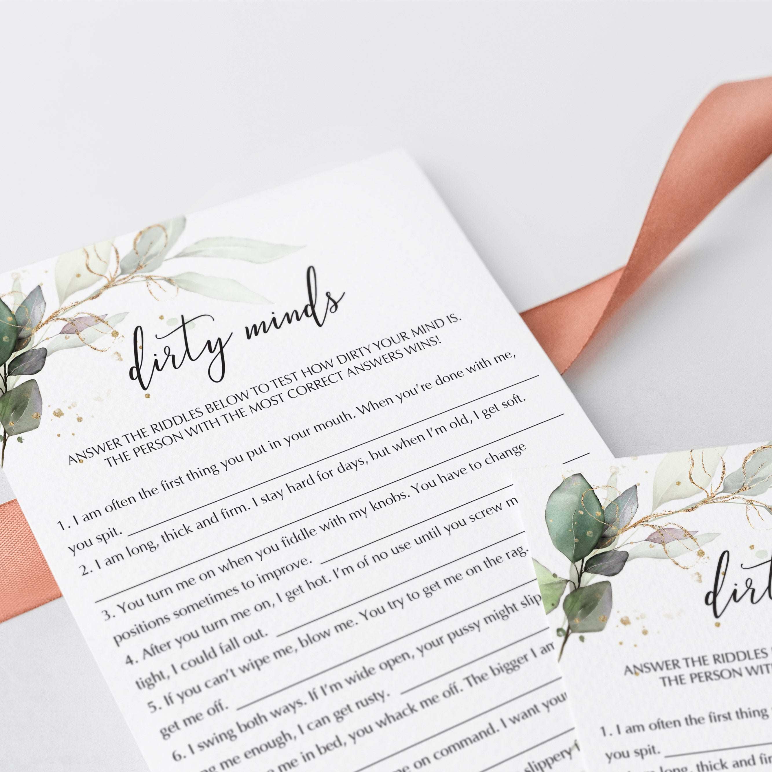 Kick off the fun at your hen party with this greenery dirty hen party games bundle with 4 naughty games. The games are the perfect addition to your girls night, hen party or bachelorette party.