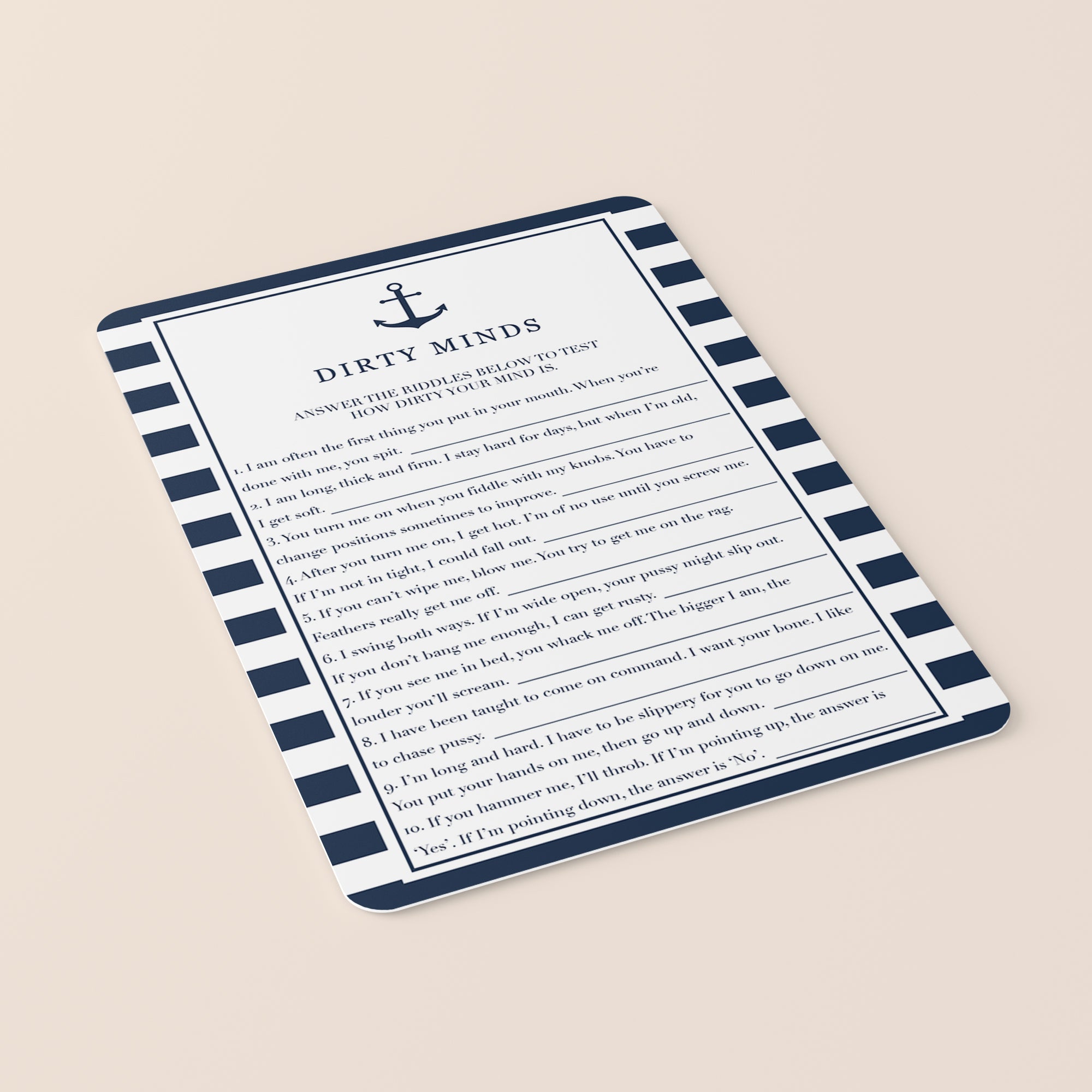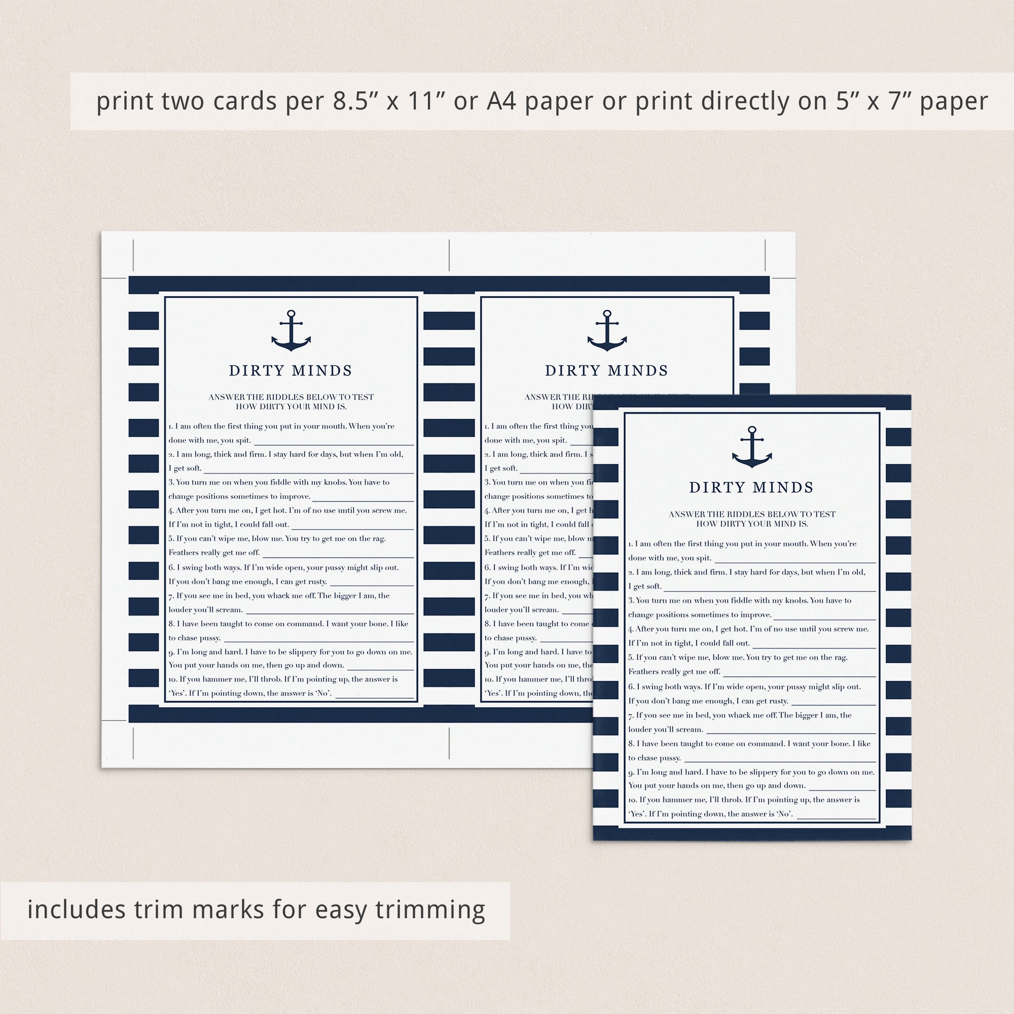 The nautical theme Dirty Minds game an instant download. After purchase you will receive a download link immediately on screen. Also within minutes of your order and payment, an e-mail will be sent to you with a link for your download.