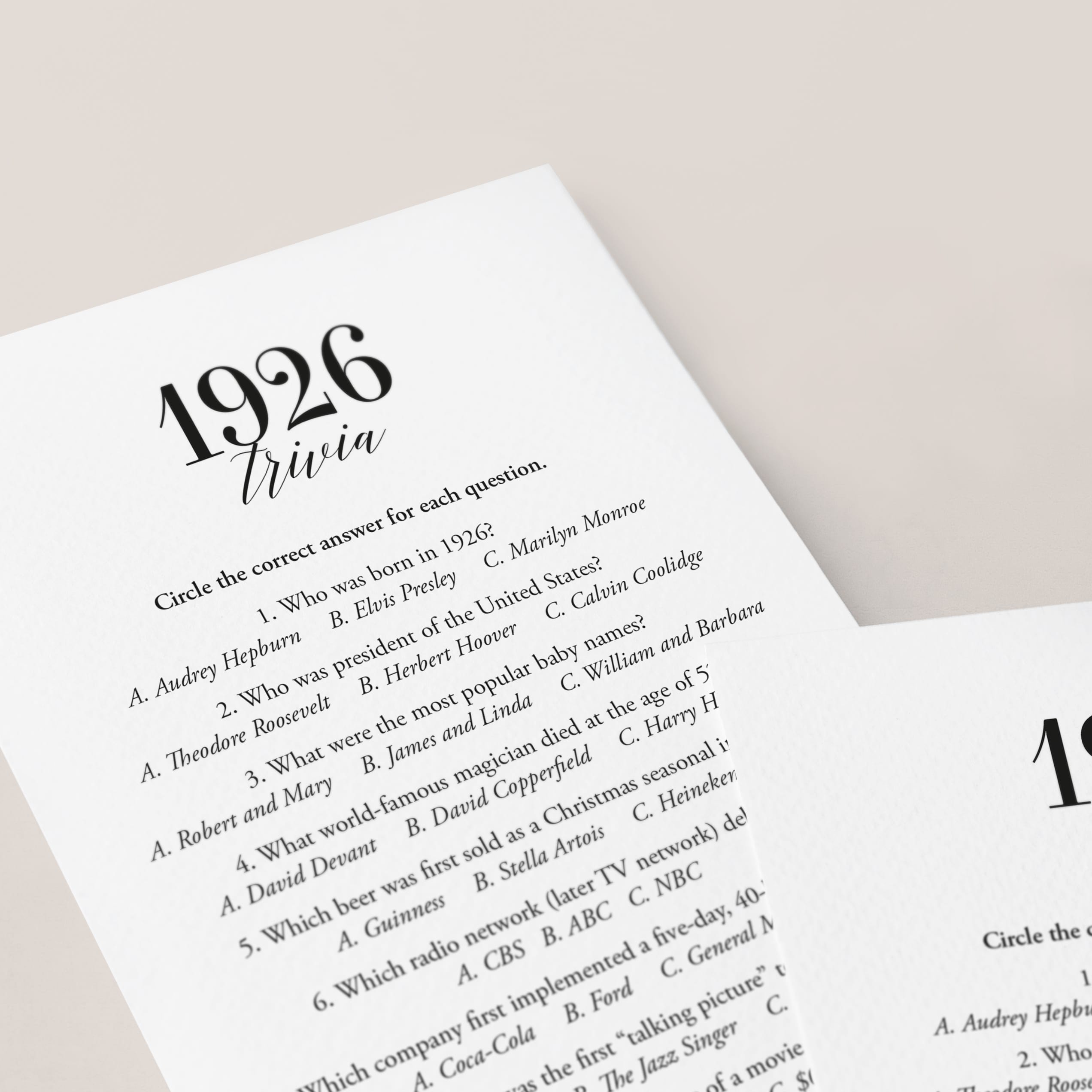 Looking for a fun game for a 100th birthday party? Look no further! This modern, minimalist 1926 trivia game features 10 multiple-choice questions, making it perfect for sharing laughs and memories with friends and family. Test your guests' knowledge of 1926's pop culture!
