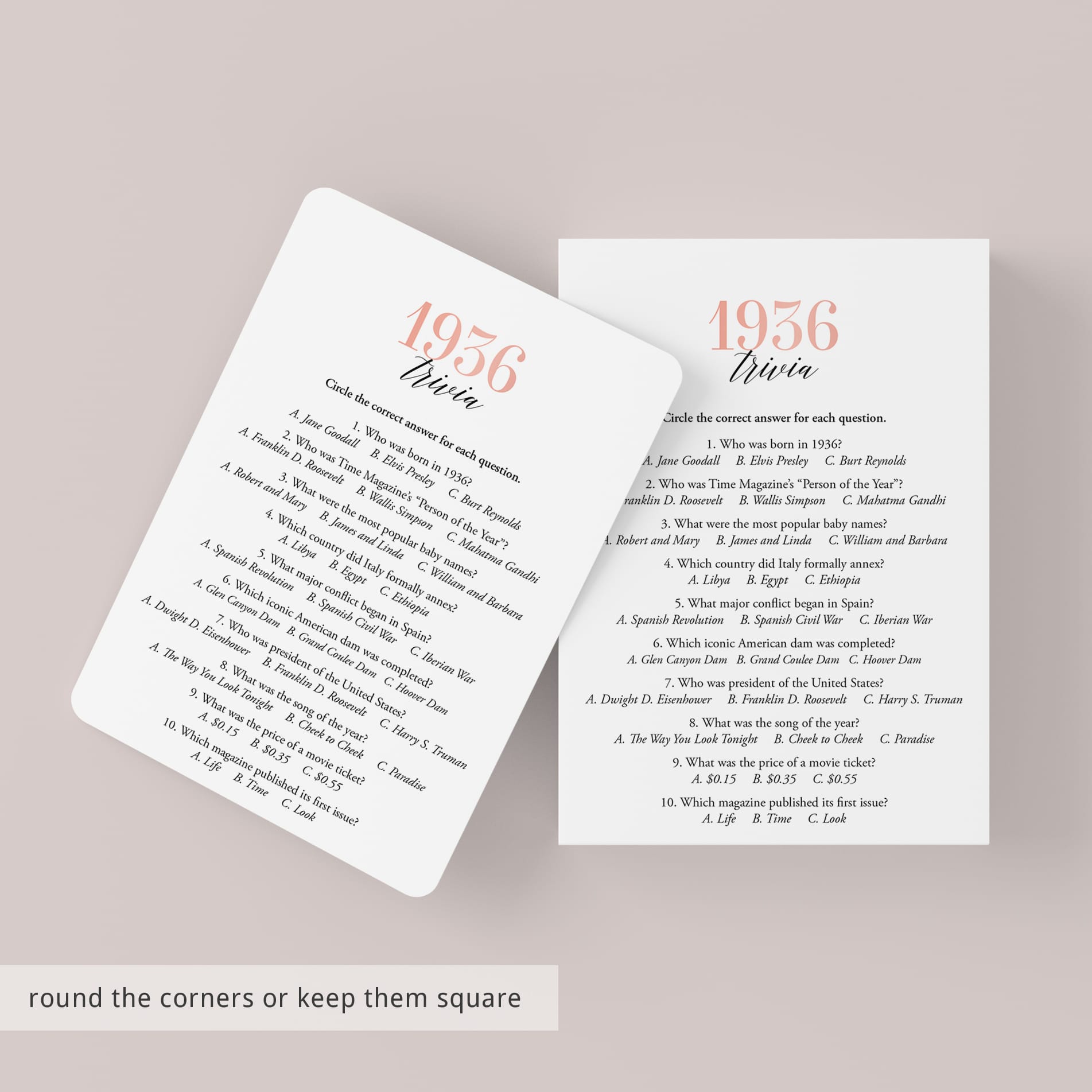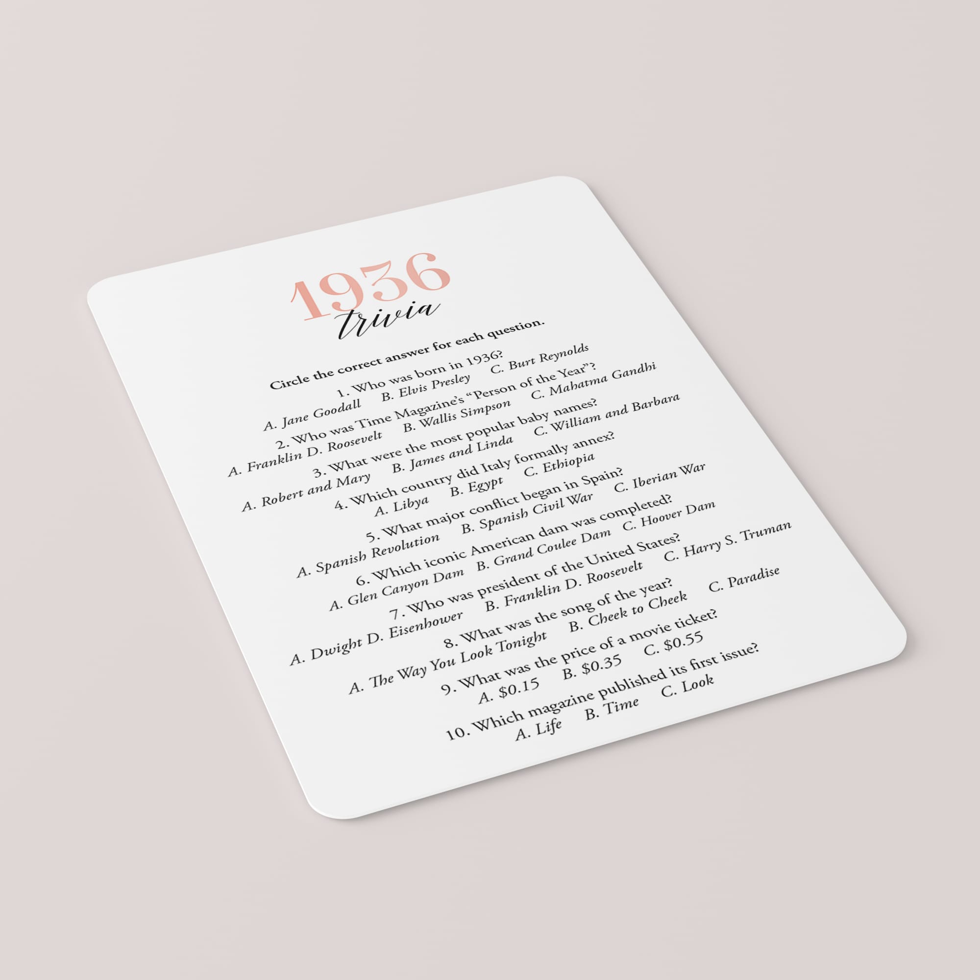 Are you looking for a fun game for a woman's 90th birthday party? Look no further! This 1936 Trivia, with 10 multiple-choice questions, is perfect for celebrating with friends and family. Test your guests’ knowledge of 1936 pop culture!