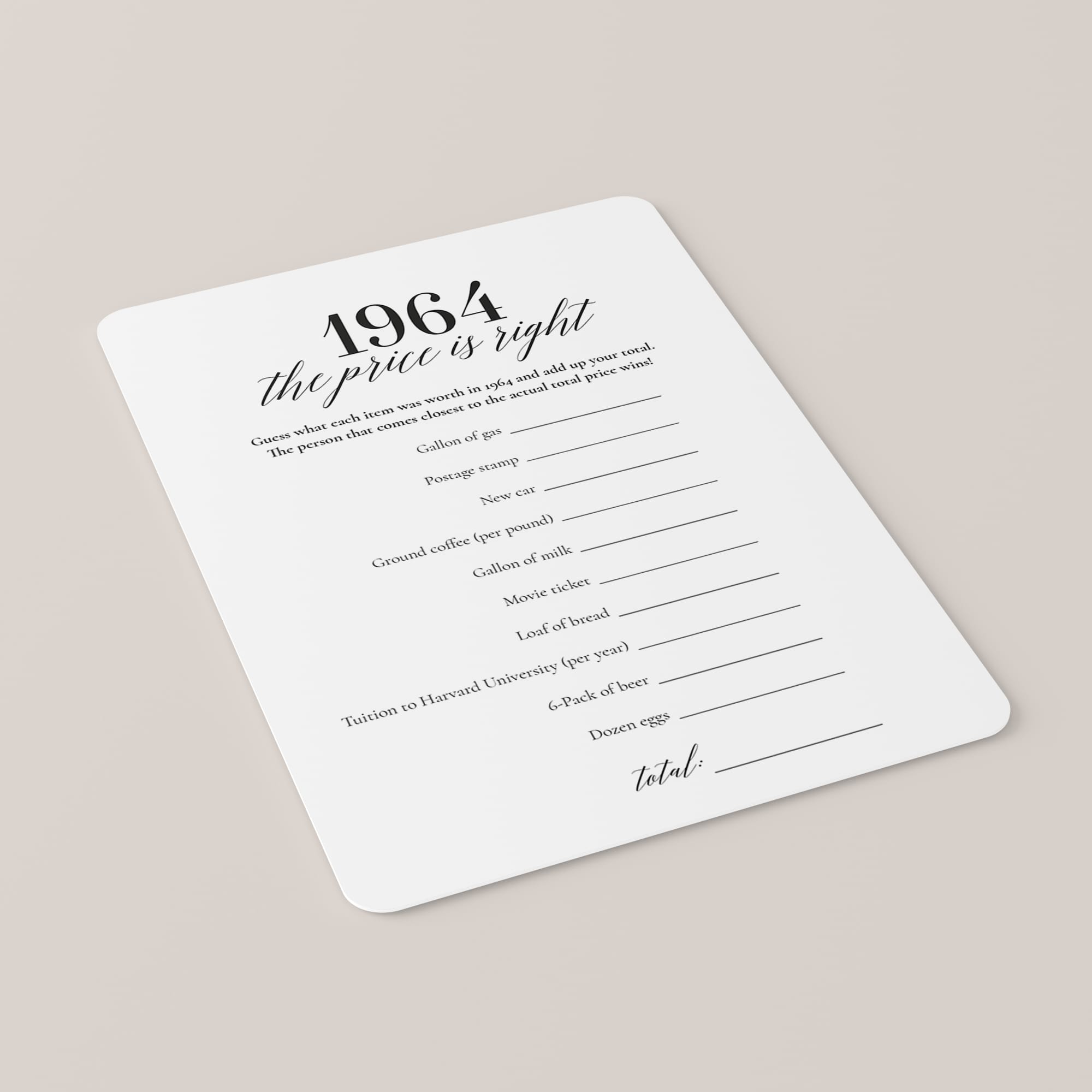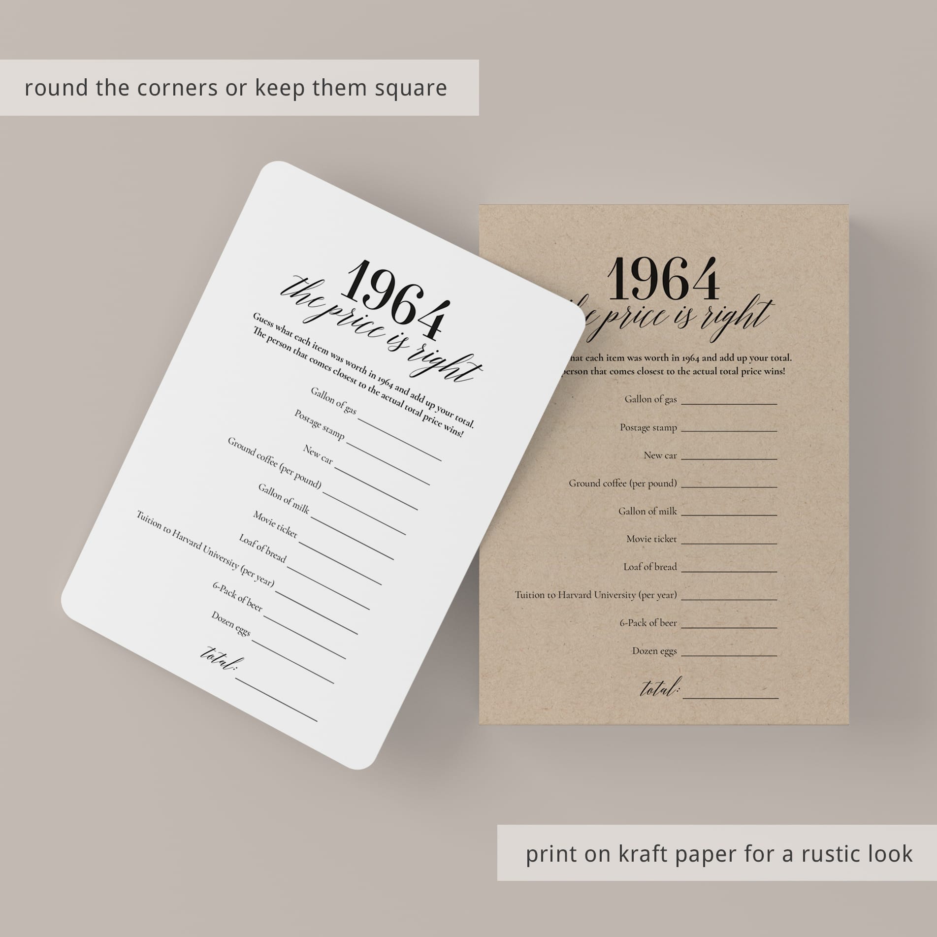 To determine the ultimate winner, simply add up everyone's guesses and see who comes closest to the actual total of these 1964 prices. It's a game of memory and estimation that will have your guests engaged and reminiscing about the good ol' days.