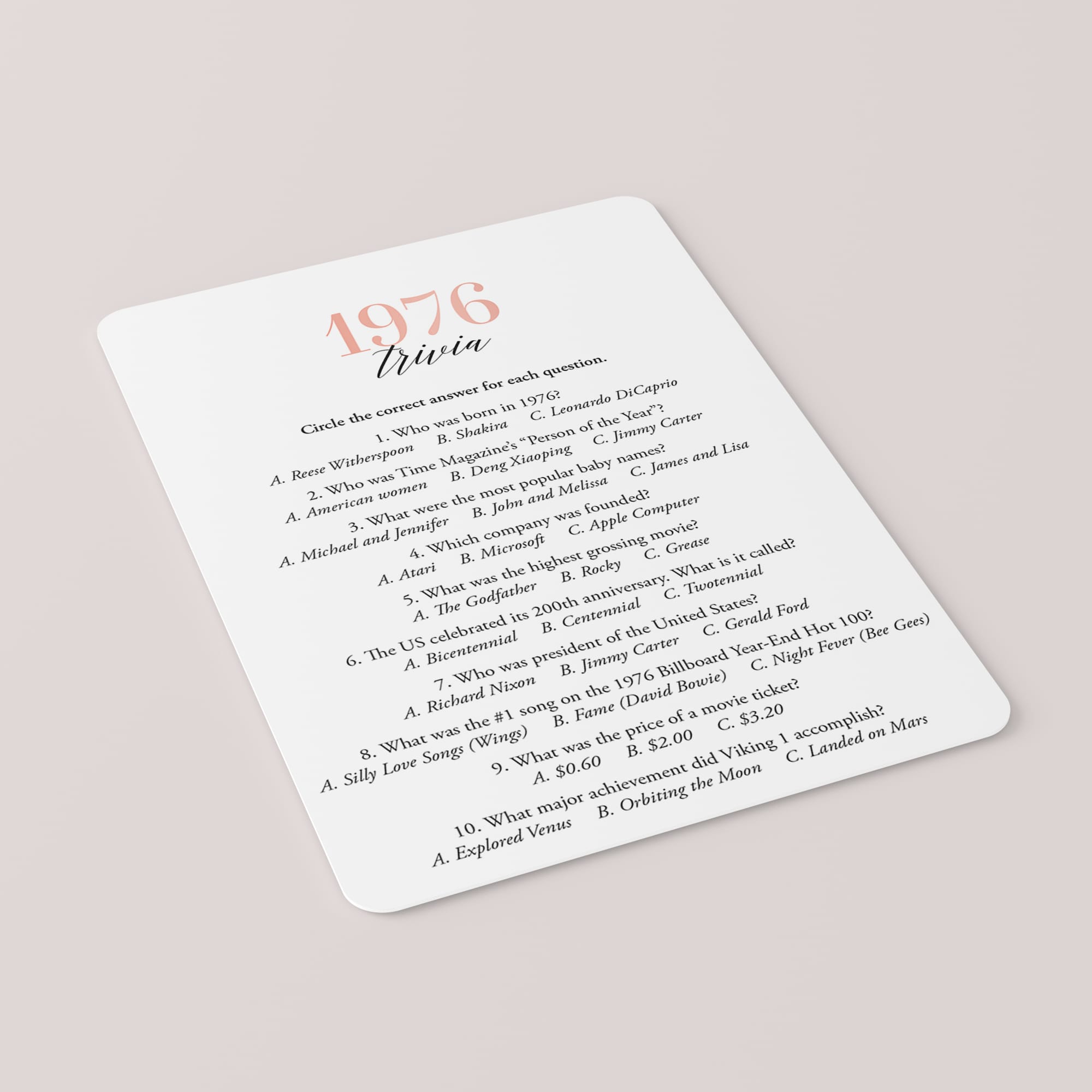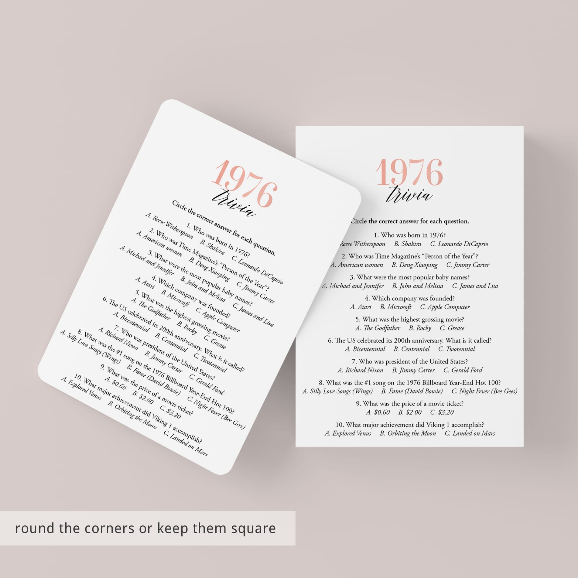 Are you looking for a fun game for a 50th birthday party? Look no further! This 1976 trivia quiz with 10 multiple choice questions is such a fun game to play with your friends and family. Test your guests how well they know 1976's pop culture. It's the perfect addition to an over the hill birthday party for a woman born in 1976.