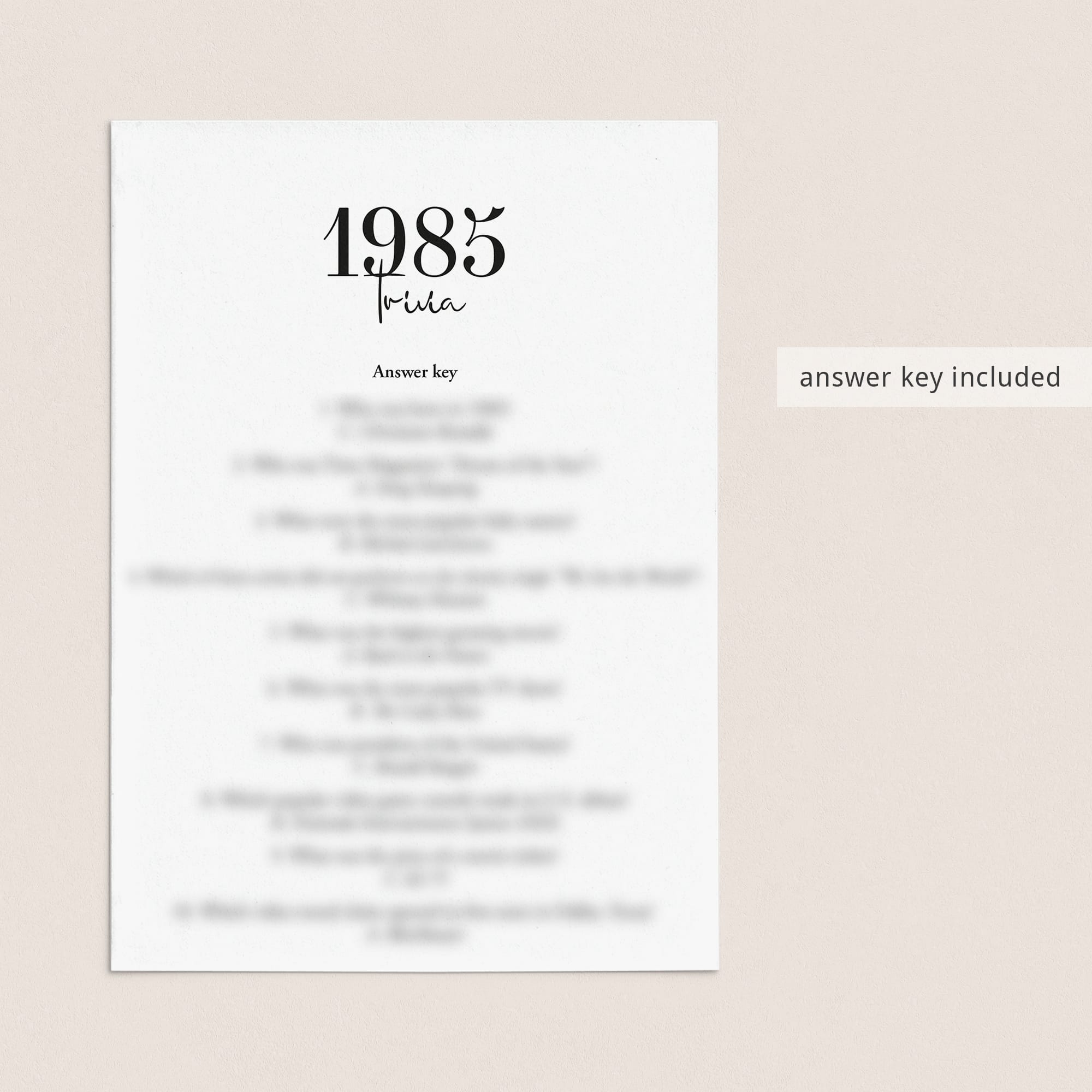 Just in case you are having trouble figuring out the answers, an answer key with the 1985 trivia answers is included.