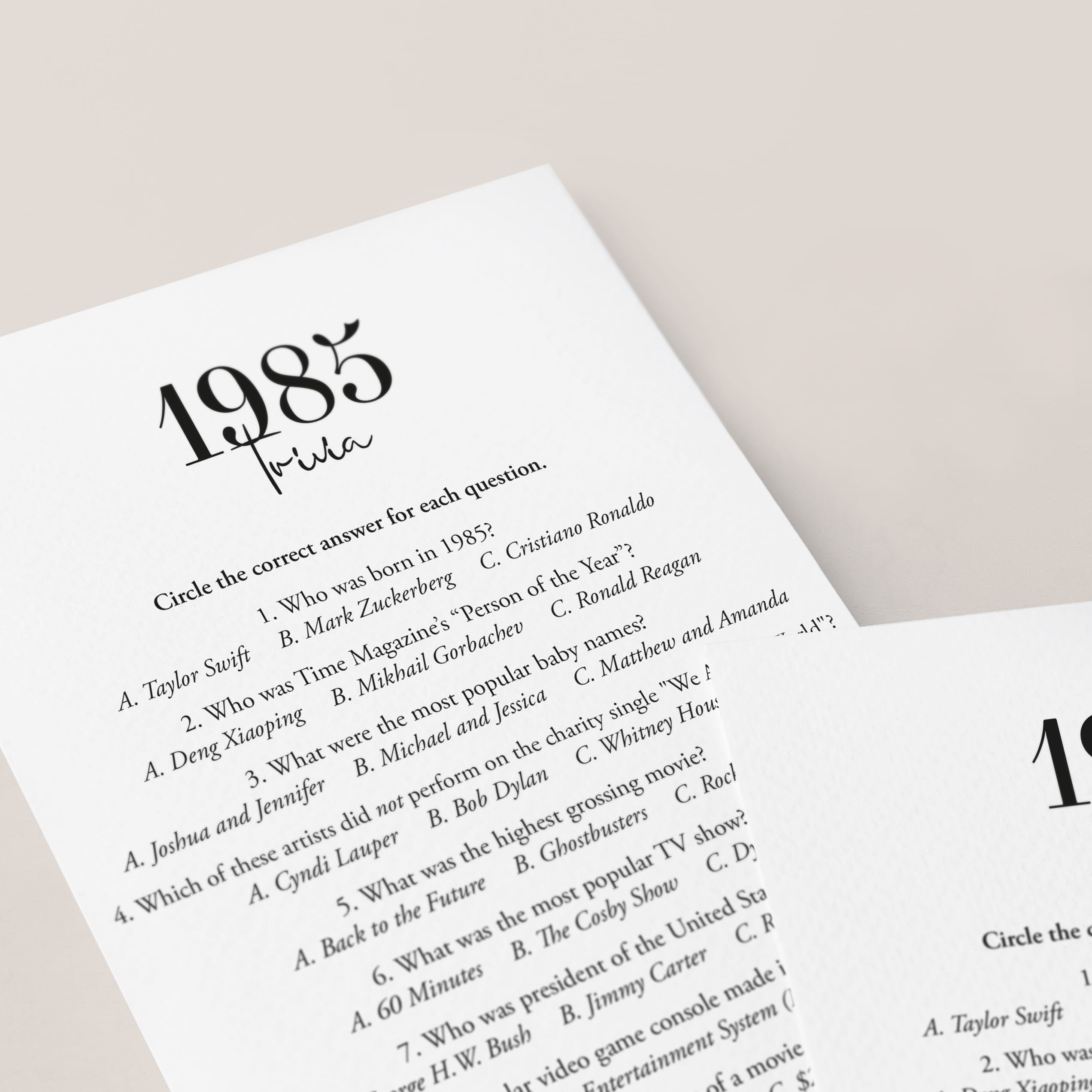 This 1985 trivia quiz is a digital download. After purchase you will receive a download link immediately on screen. Also within minutes of your order and payment, an e-mail will be sent to you with a link for your download.