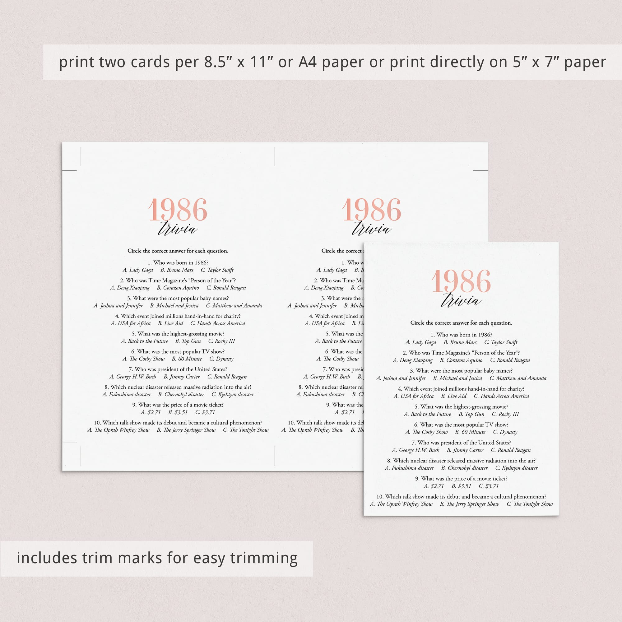 Are you looking for a fun game for a 40th birthday party? Look no further! This 1986 trivia quiz with 10 multiple choice questions is such a fun game to play with your friends and family. Test your guests how well they know 1986's pop culture. It's the perfect addition to a birthday party for a woman born in 1986.