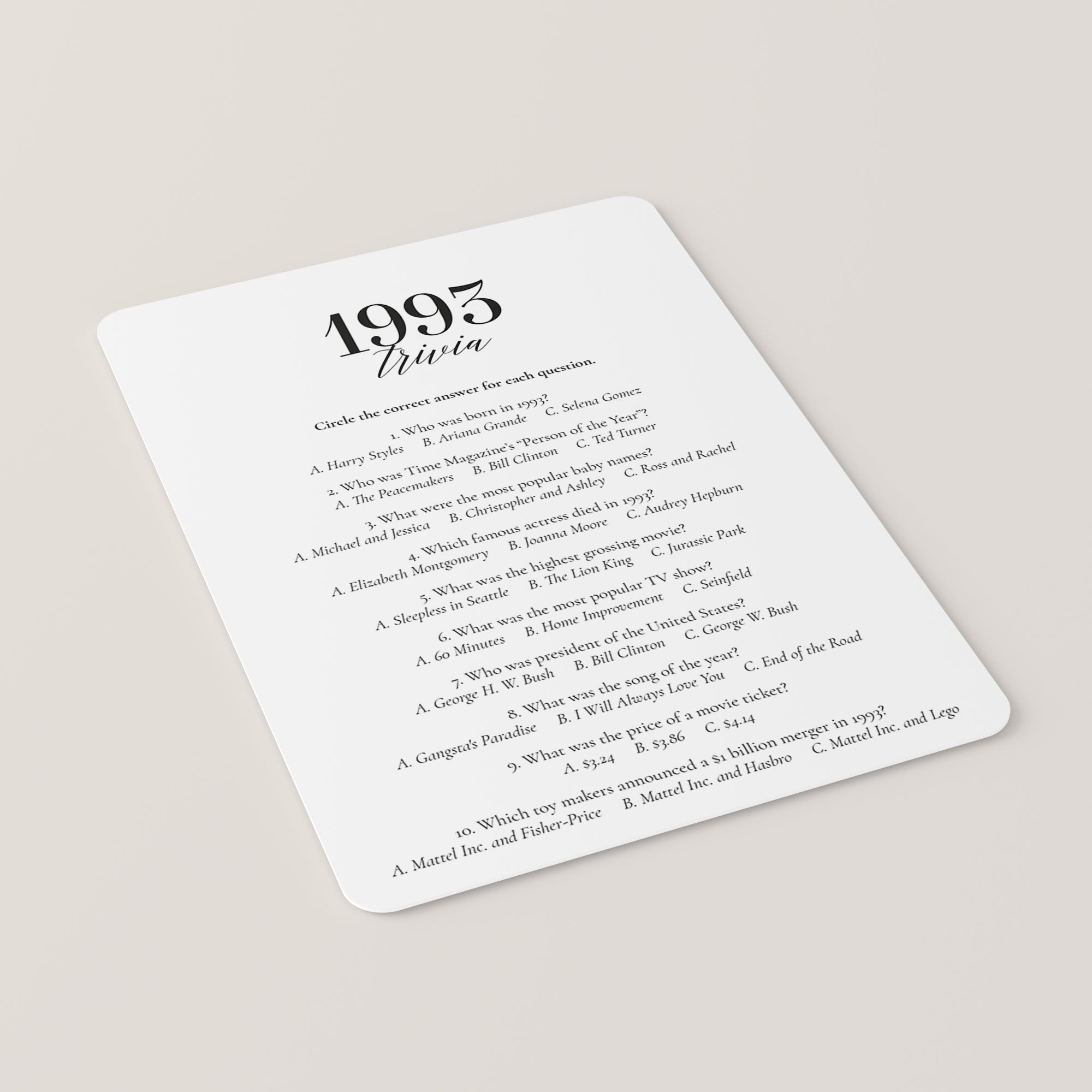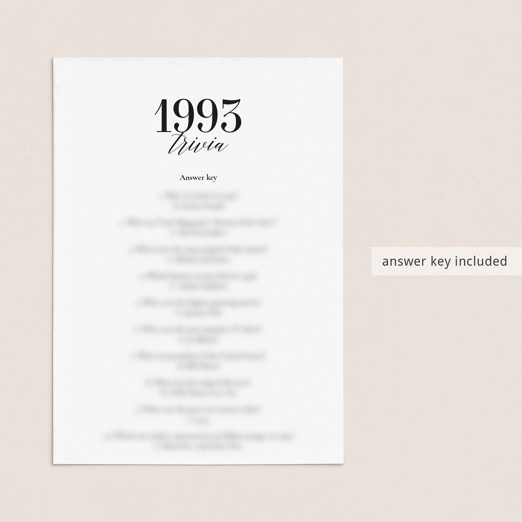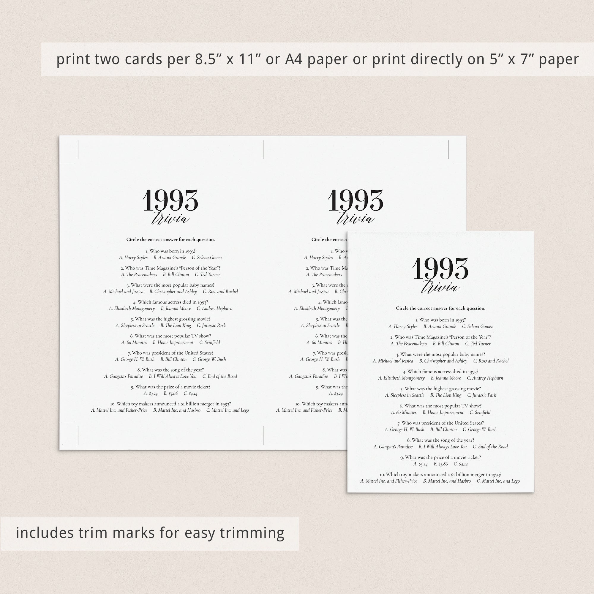 This fun facts about 1993 quiz is a digital download. After purchase you will receive a download link immediately on screen. Also within minutes of your order and payment, an e-mail will be sent to you with a link for your download.