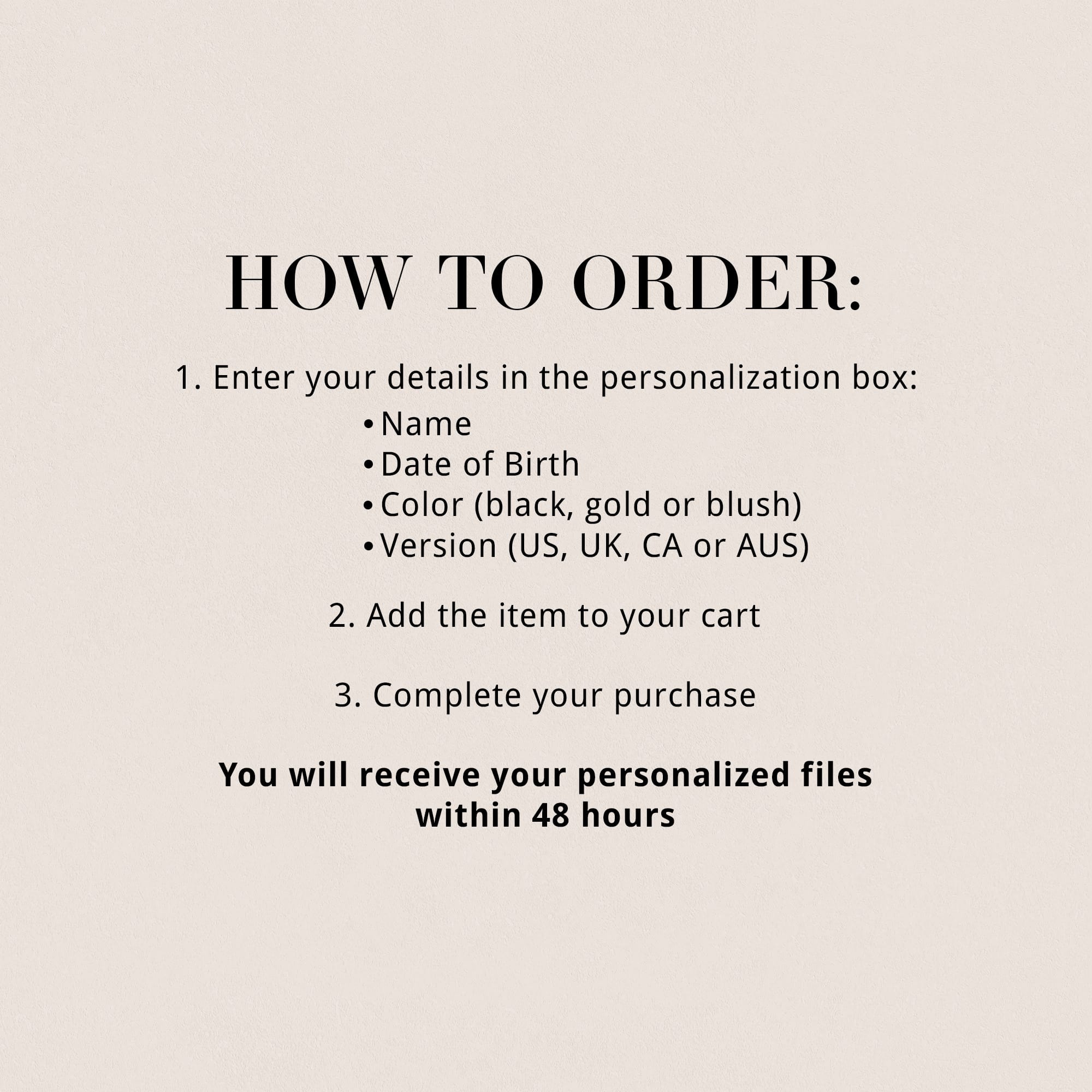 1. Add the name, date of birth, preferred color (black, gold or blush) and version (US, UK, CA or AUS) in the personalization box