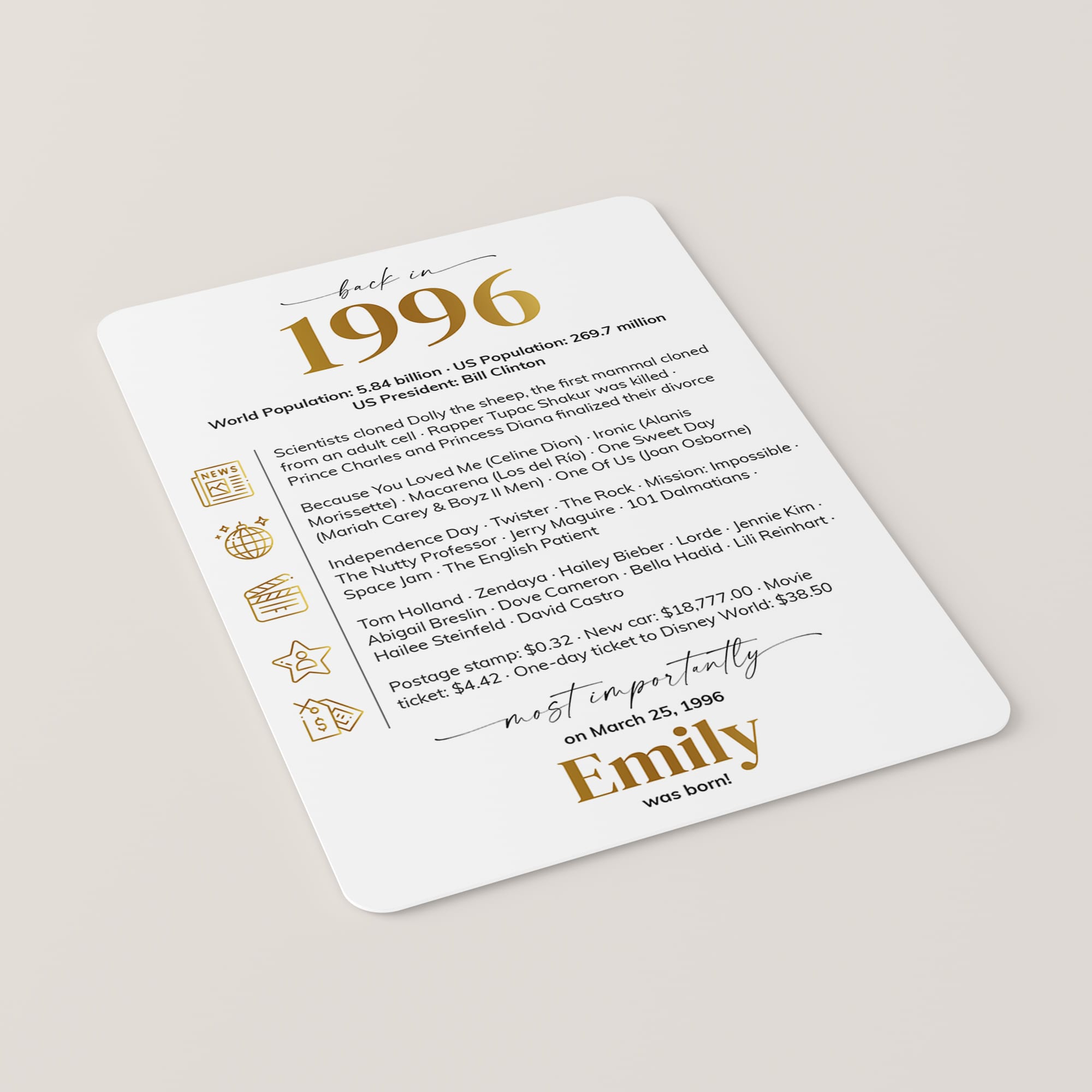 Looking for a stylish way to add a personal touch to a 30th birthday party? Our “Back in 1996” table card is a sleek and modern addition to any 30th birthday celebration in 2026. Personalized with the honoree’s name and birth date, this design combines entertaining facts from 1996 with clean icons for a fresh, contemporary look.