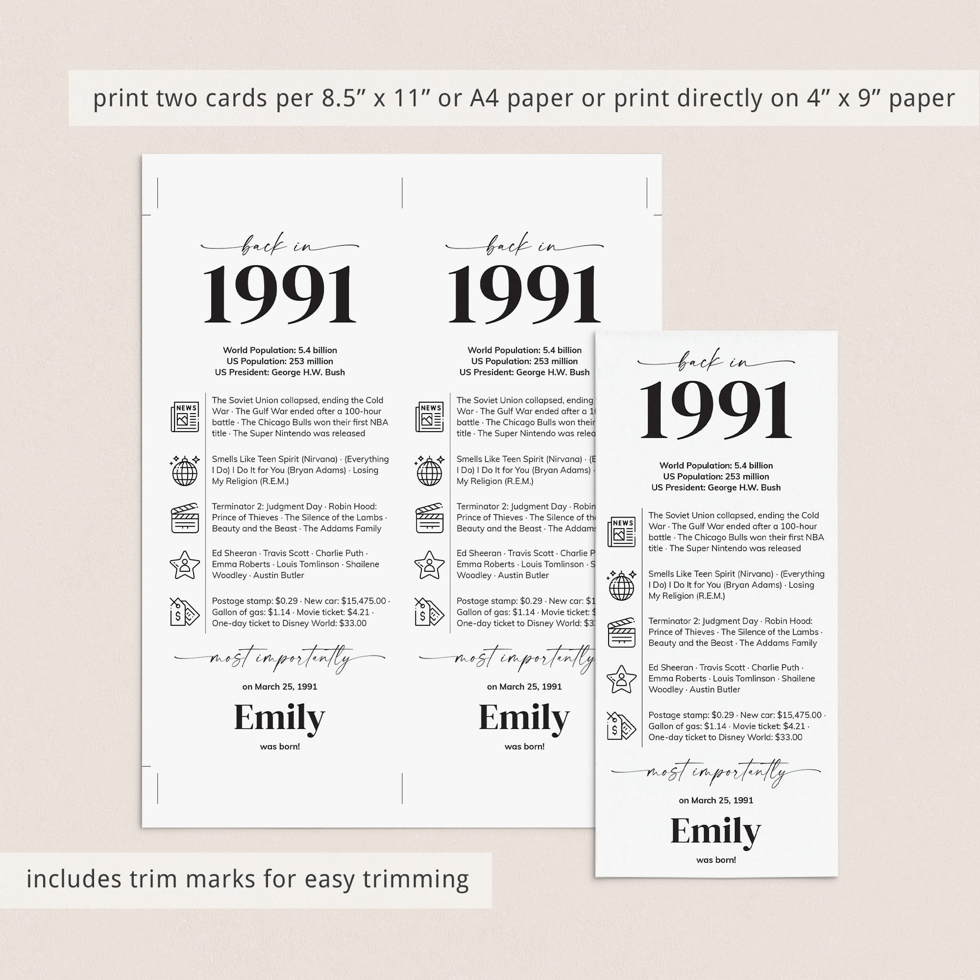 Personalized with the honoree’s name and birth date, this design combines entertaining facts from 1991 with clean icons for a fresh, contemporary look.
