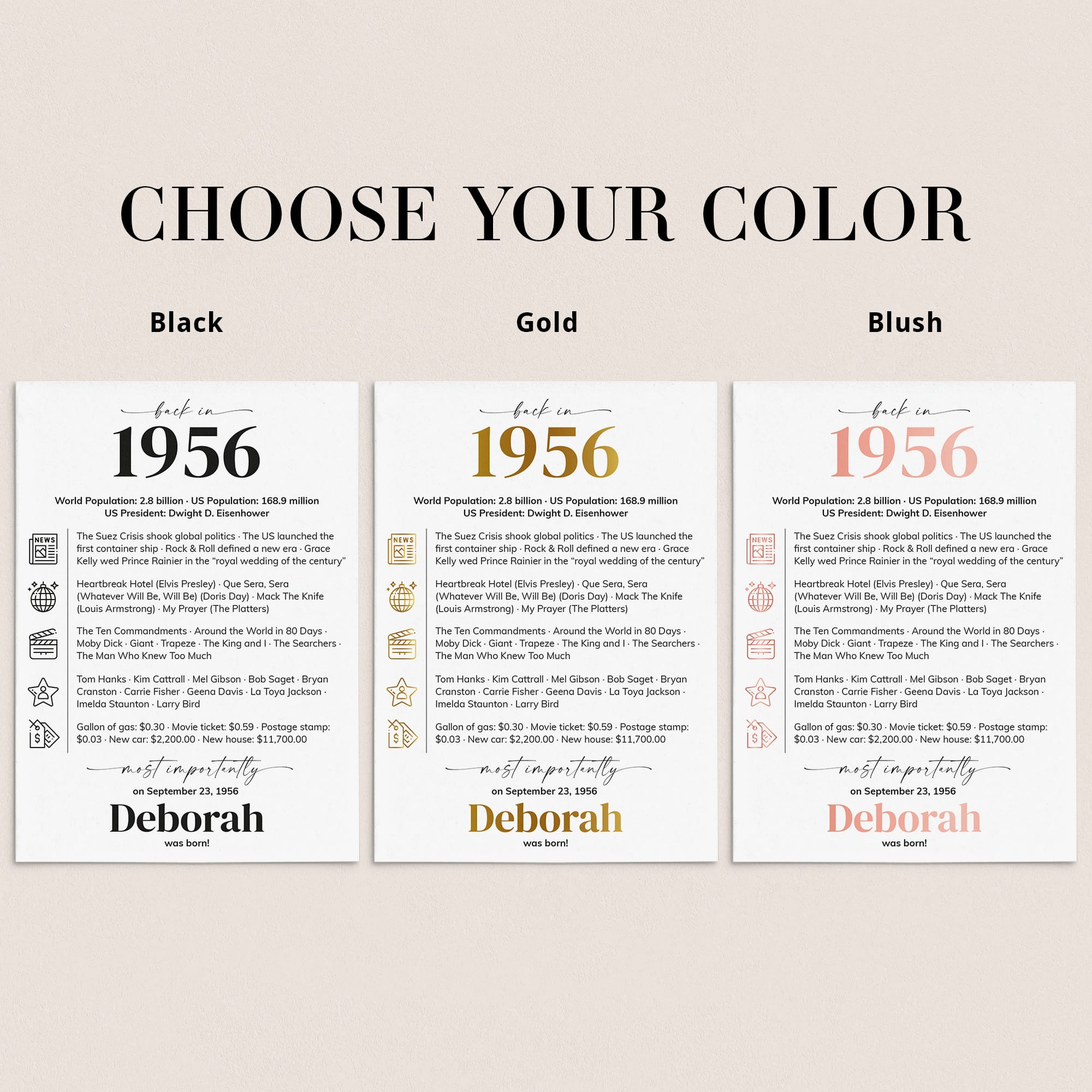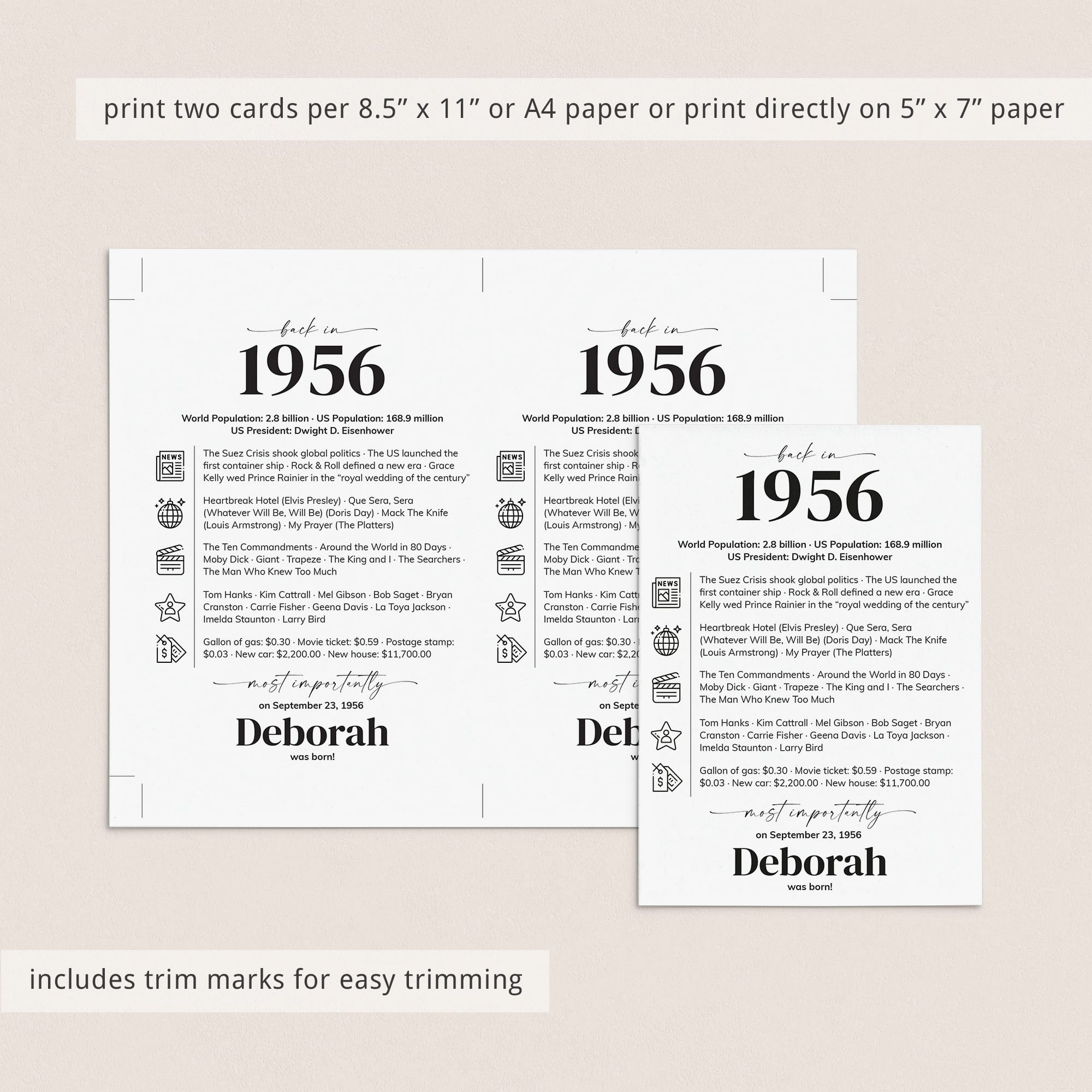 Looking for a stylish way to add a personal touch to a 70th birthday party? Our “Back in 1956” table card is a sleek and modern addition to any 70th birthday celebration in 2026. Personalized with the honoree’s name and birth date, this design combines entertaining facts from 1956 with clean icons for a fresh, contemporary look.