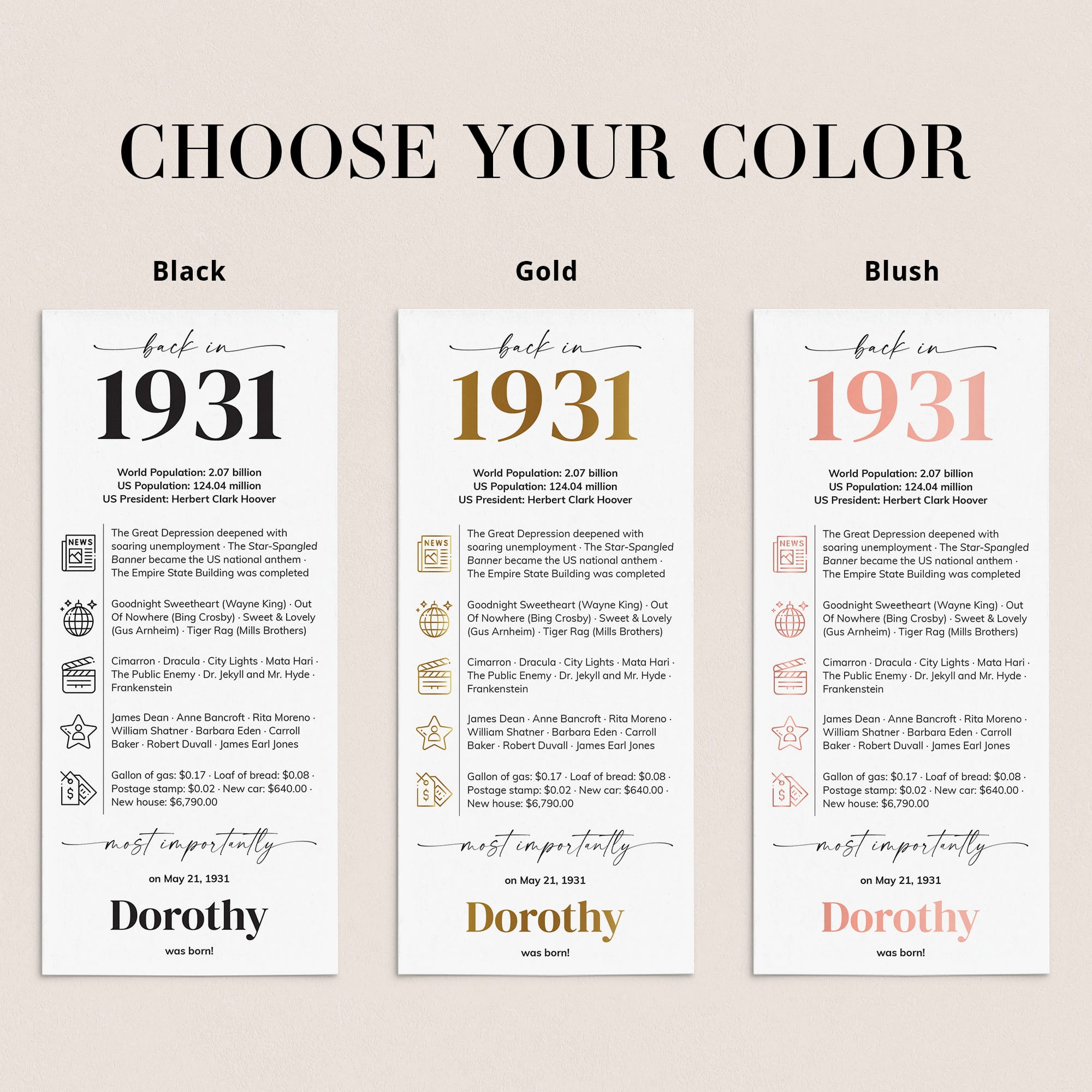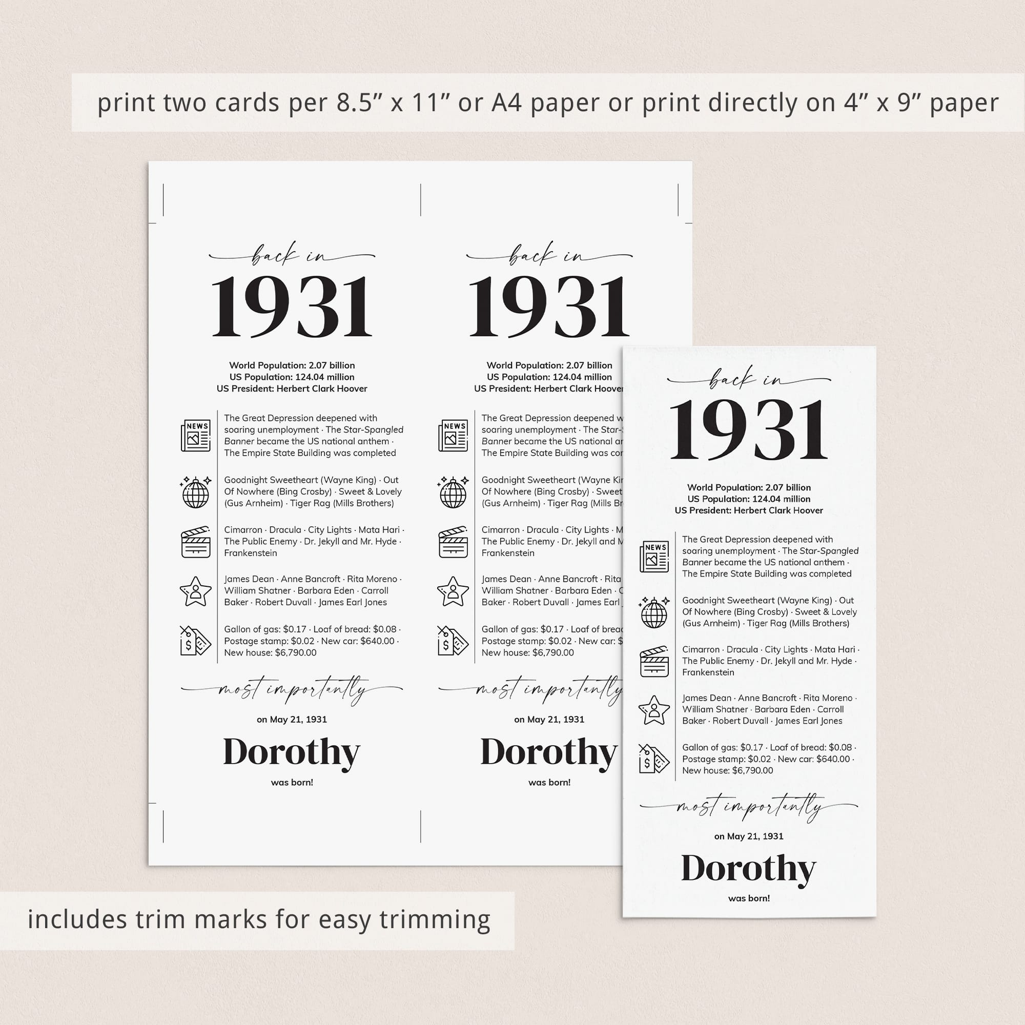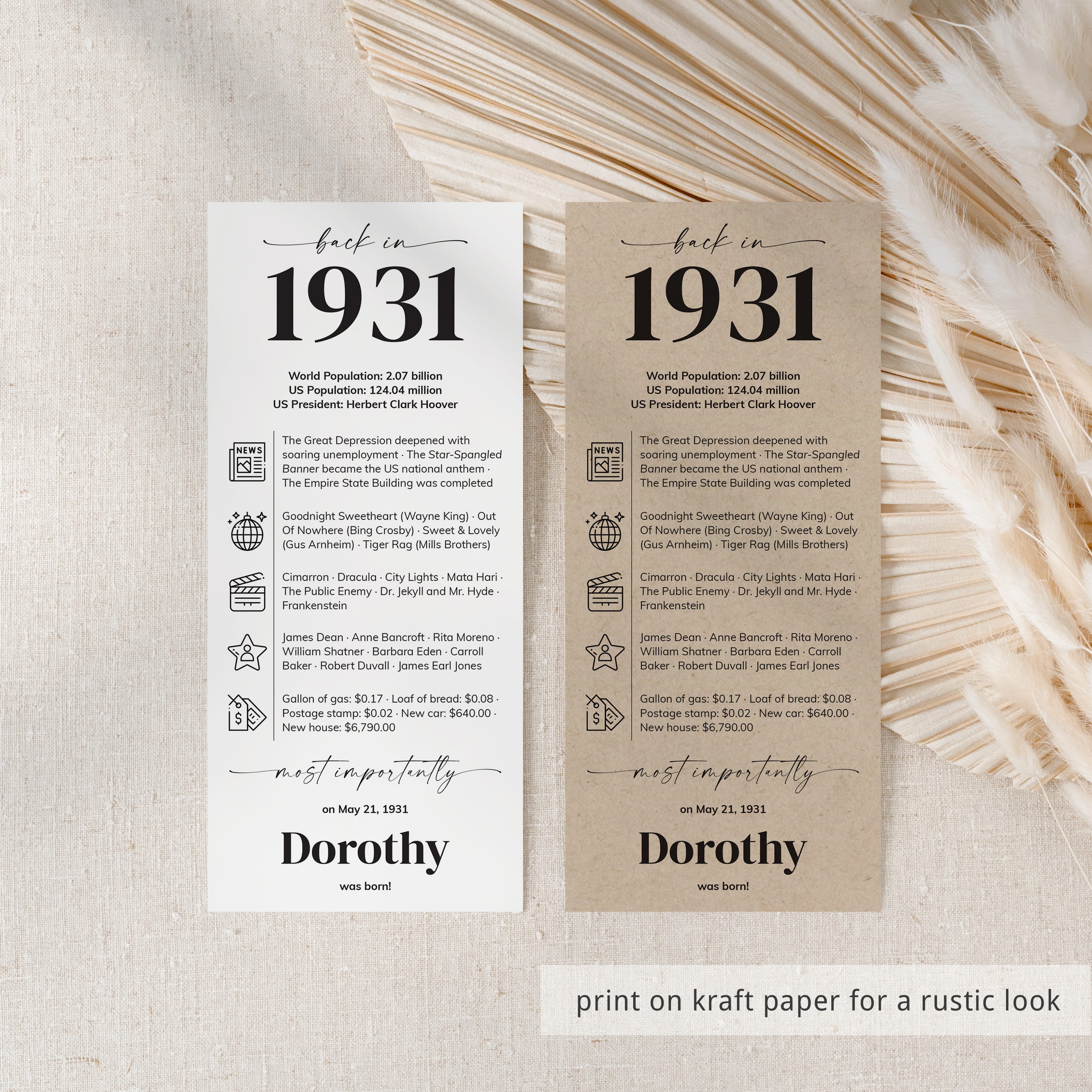 Personalized with the honoree’s name and birth date, this design combines entertaining facts from 1931 with clean icons for a fresh, contemporary look.